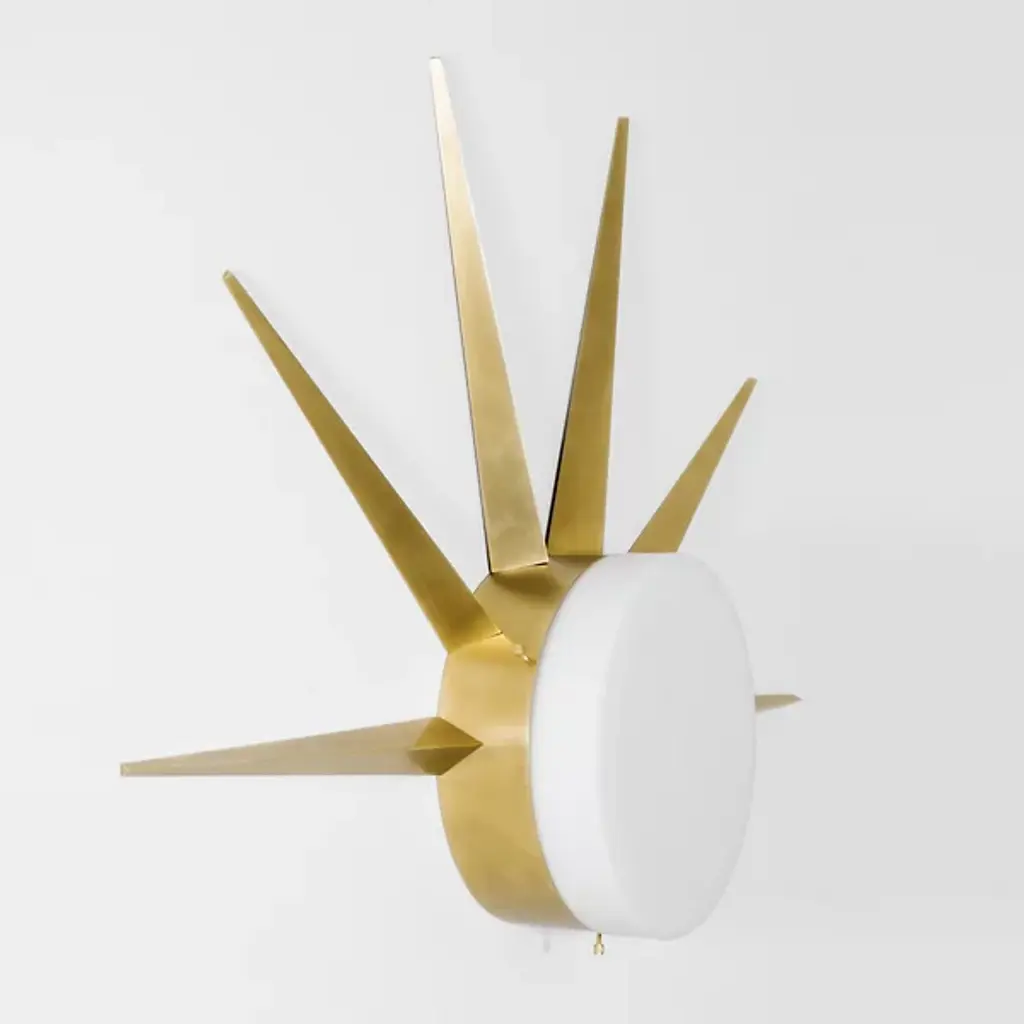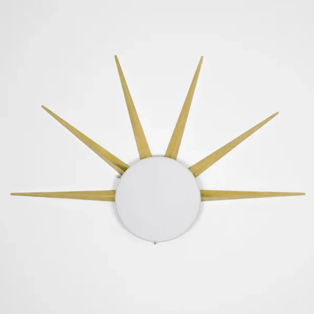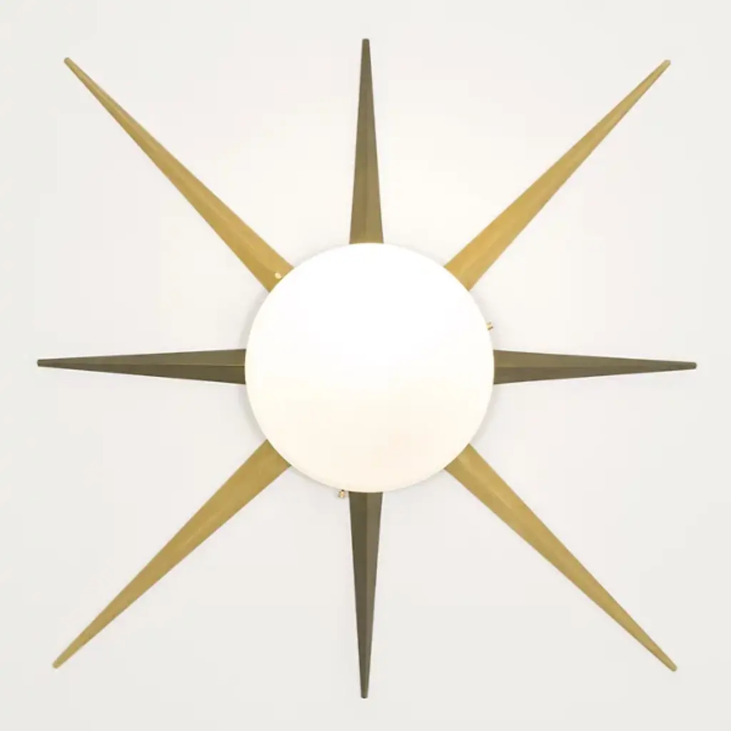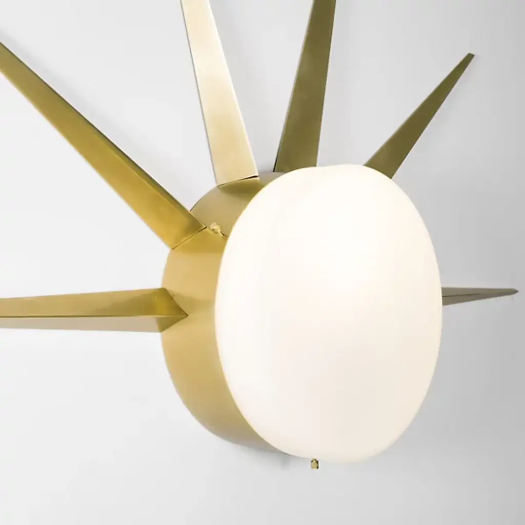 Set the tone for your day with the dawn-inspired rays and light of the Dawn Wall / Ceiling Light from Design for Macha. It's a tribute to the sun, carrying Design for Macha's crafted Italian sensibility. The piece welcomes placement on the ceiling or wall as a sculptural design. Faceted brass rays beam from a ring housing in a half-circle, evoking the image of an early sunrise. Light enters the eye comfortably as it mellows through an opaline Murano glass shade. This light ties together the 'dawn' motif with a generous warmth.
