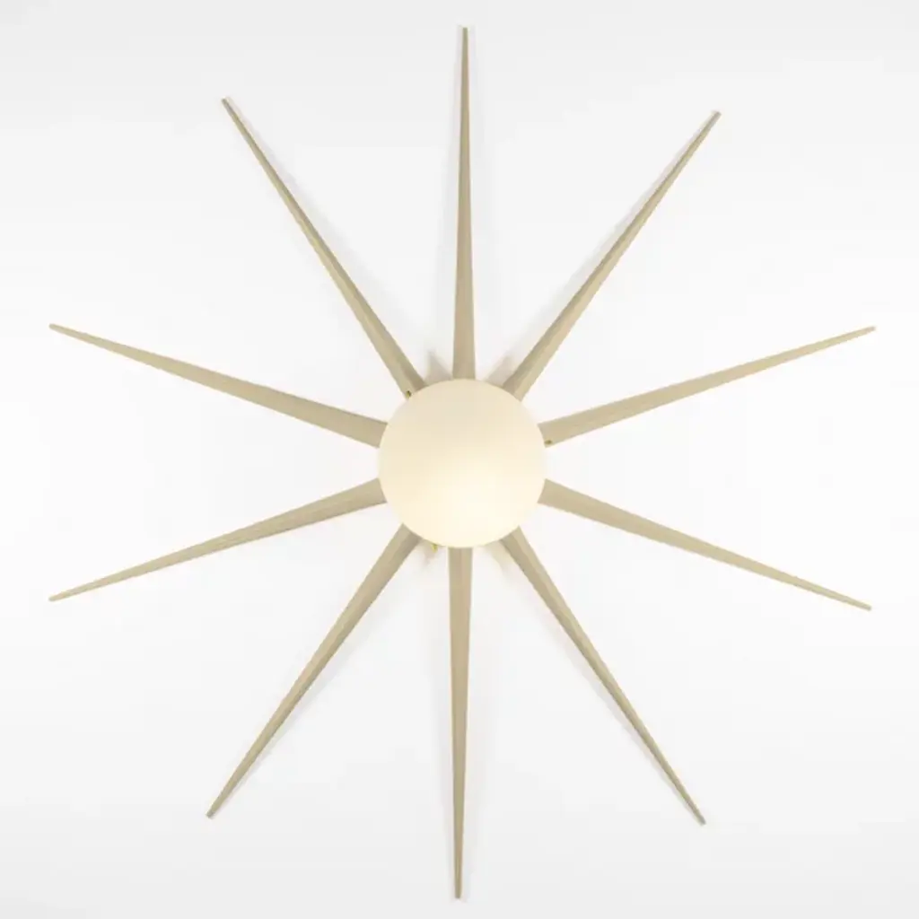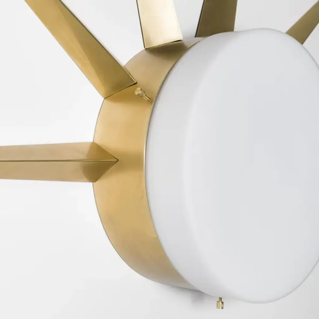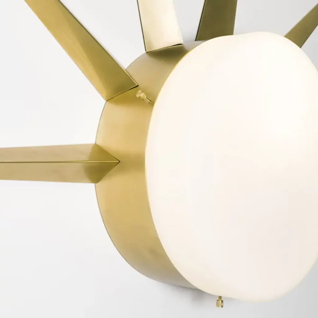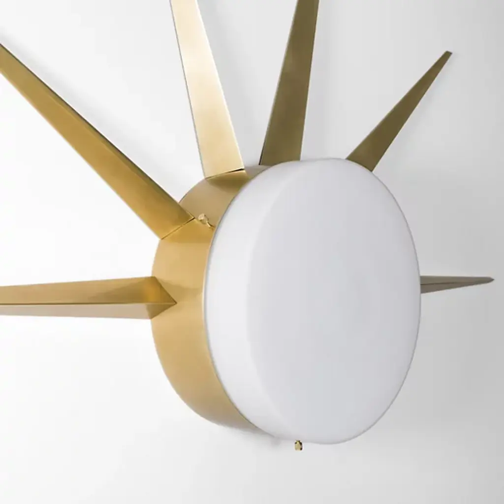 Set the tone for your day with the dawn-inspired rays and light of the Dawn Wall / Ceiling Light from Design for Macha. It's a tribute to the sun, carrying Design for Macha's crafted Italian sensibility. The piece welcomes placement on the ceiling or wall as a sculptural design. Faceted brass rays beam from a ring housing in a half-circle, evoking the image of an early sunrise. Light enters the eye comfortably as it mellows through an opaline Murano glass shade. This light ties together the 'dawn' motif with a generous warmth.