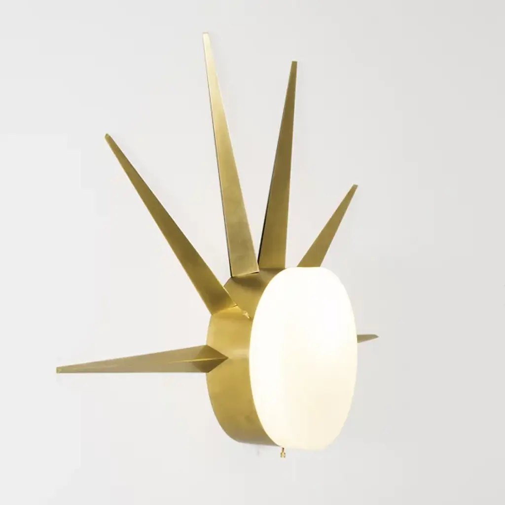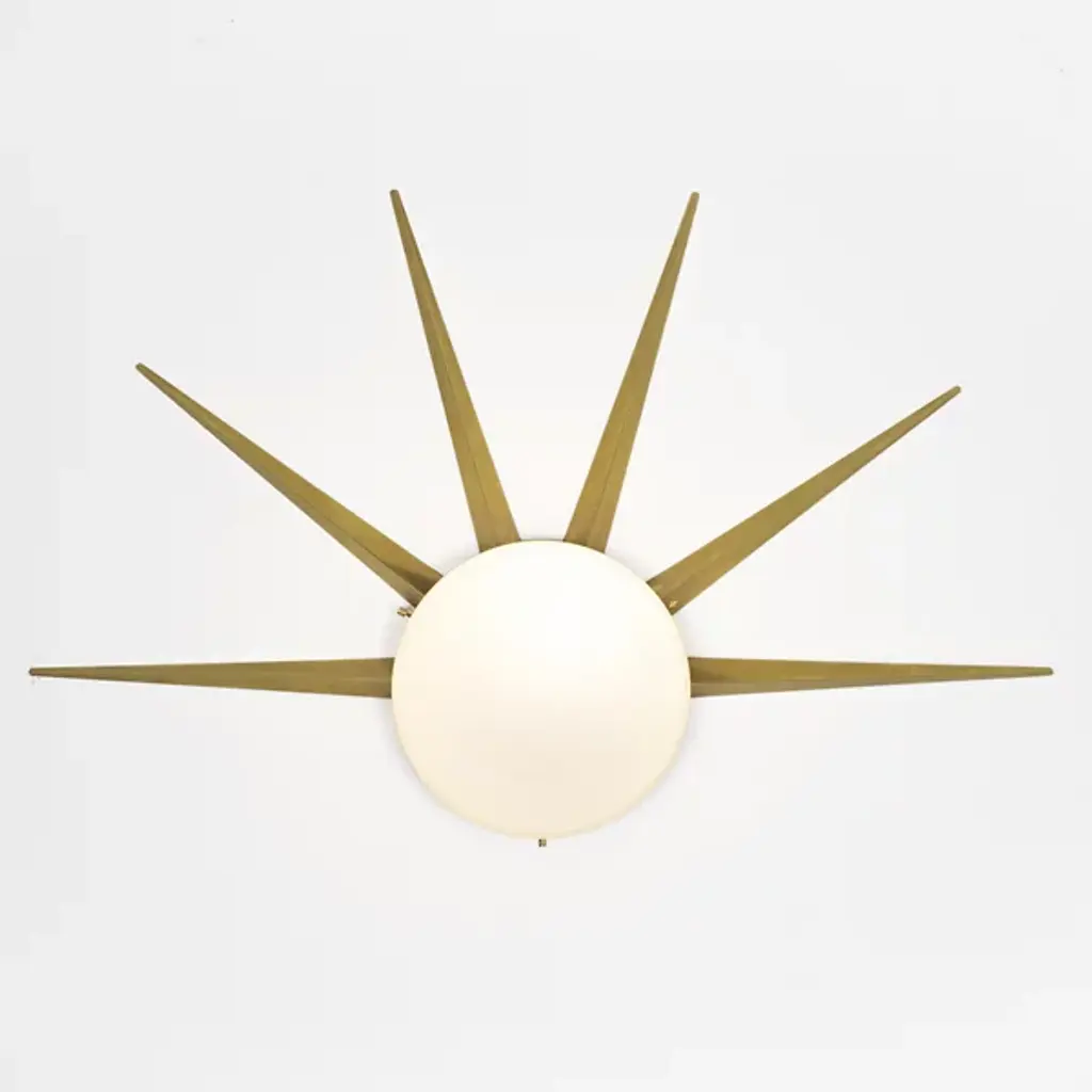 Set the tone for your day with the dawn-inspired rays and light of the Dawn Wall / Ceiling Light from Design for Macha. It's a tribute to the sun, carrying Design for Macha's crafted Italian sensibility. The piece welcomes placement on the ceiling or wall as a sculptural design. Faceted brass rays beam from a ring housing in a half-circle, evoking the image of an early sunrise. Light enters the eye comfortably as it mellows through an opaline Murano glass shade. This light ties together the 'dawn' motif with a generous warmth.