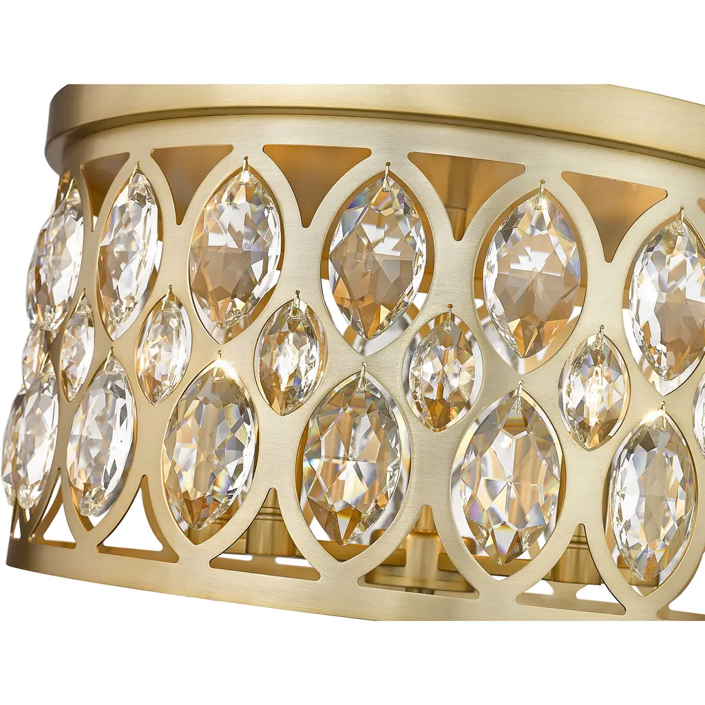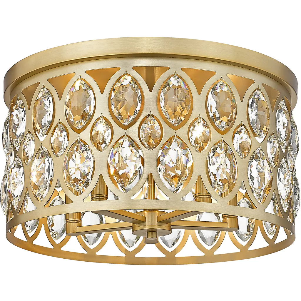 Change up the overall glam style of any space with this decadent five-light flush mount ceiling light. An extraordinary selection from the Dealey collection, this chic fixture is reserved for the most impactful of living spaces, adding the stunning look of crystal elements to an openwork metal frame with a warm heirloom brass finish. Five lights infuse suitable ambient lighting for a kitchen, dining room, or foyer, capturing the palatial feel of a classic.