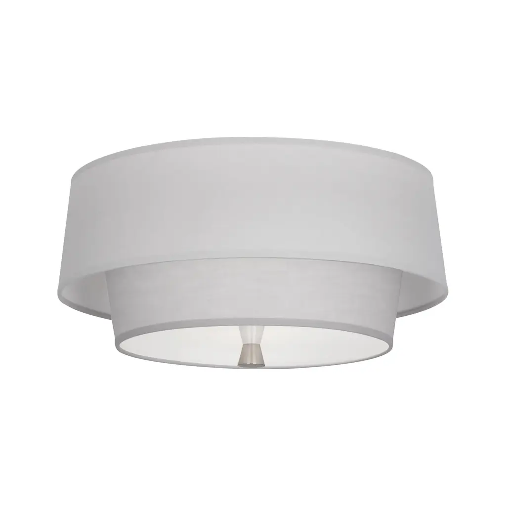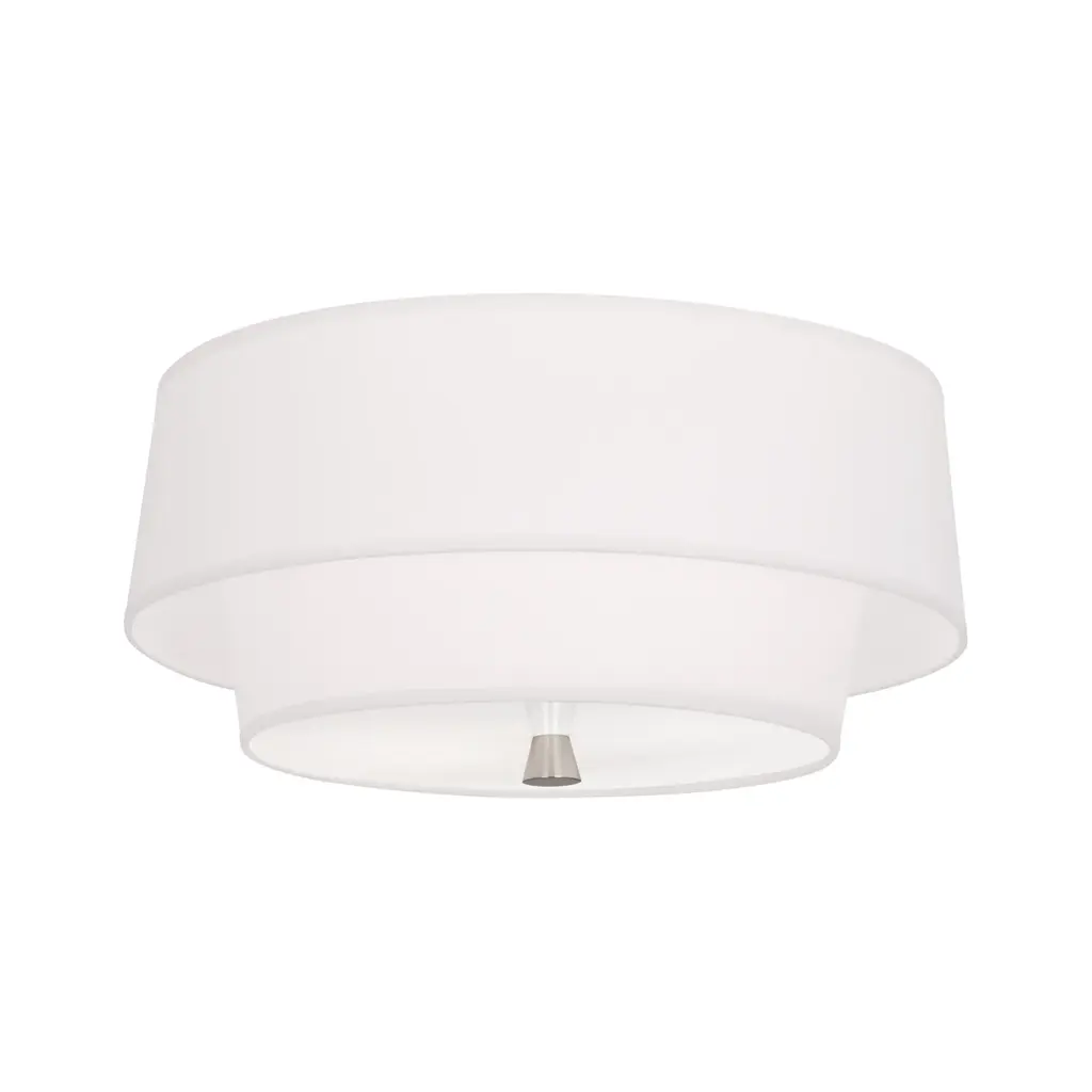 The Decker Flush Mount from Robert Abbey features a refined two-tier design with hardback fabric shades that soften light and reduce glare. Its sleek disc diffuser, secured by a flared metal finial, complements the outer shades while casting a warm, elegant glow. This self-contained fixture brings sophisticated style and gentle illumination to any hallway or room. Highlights