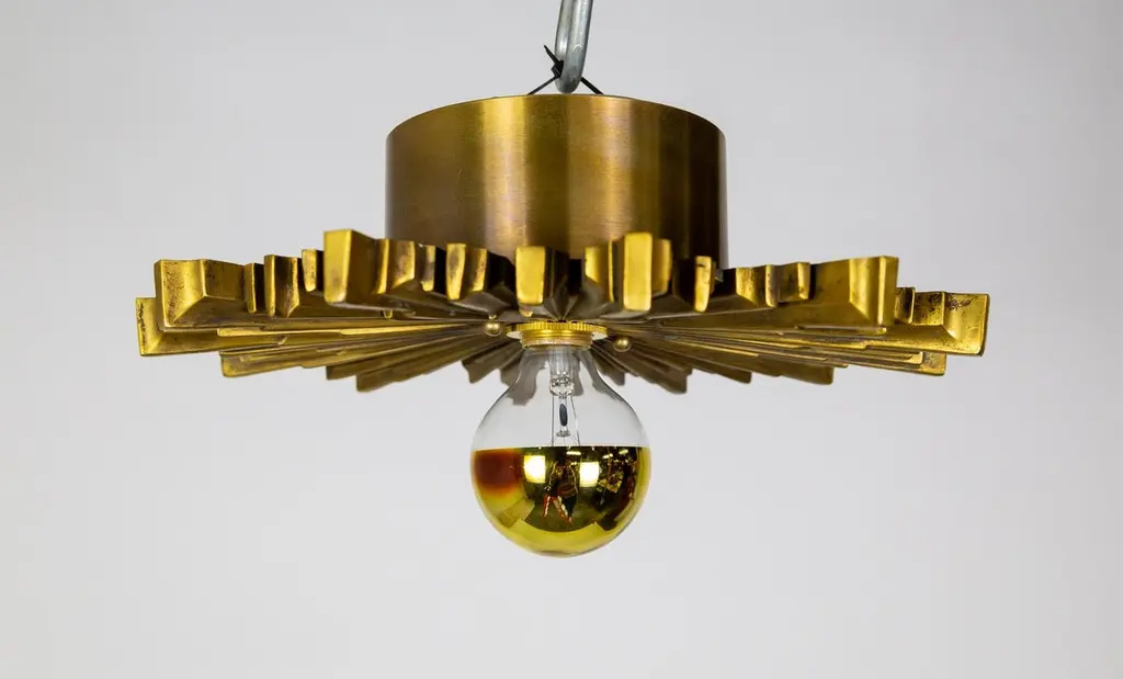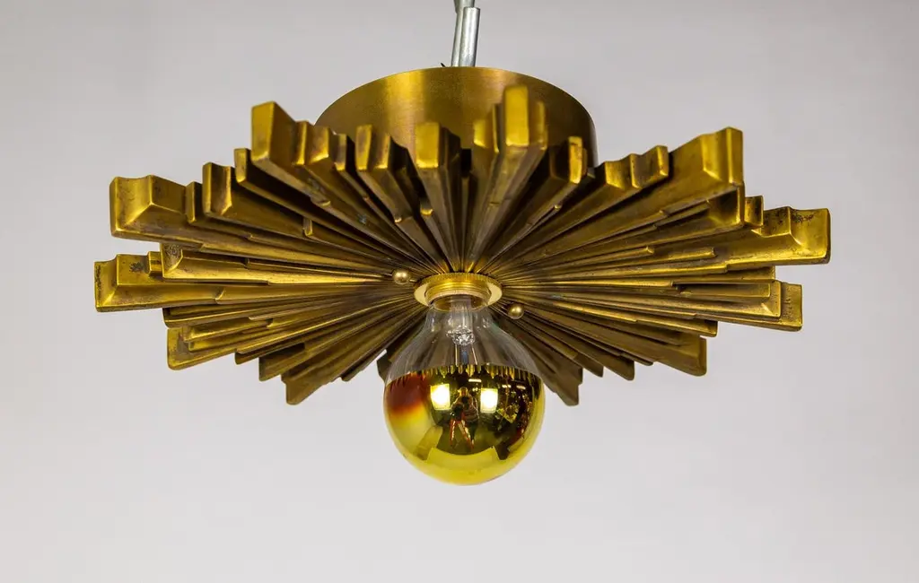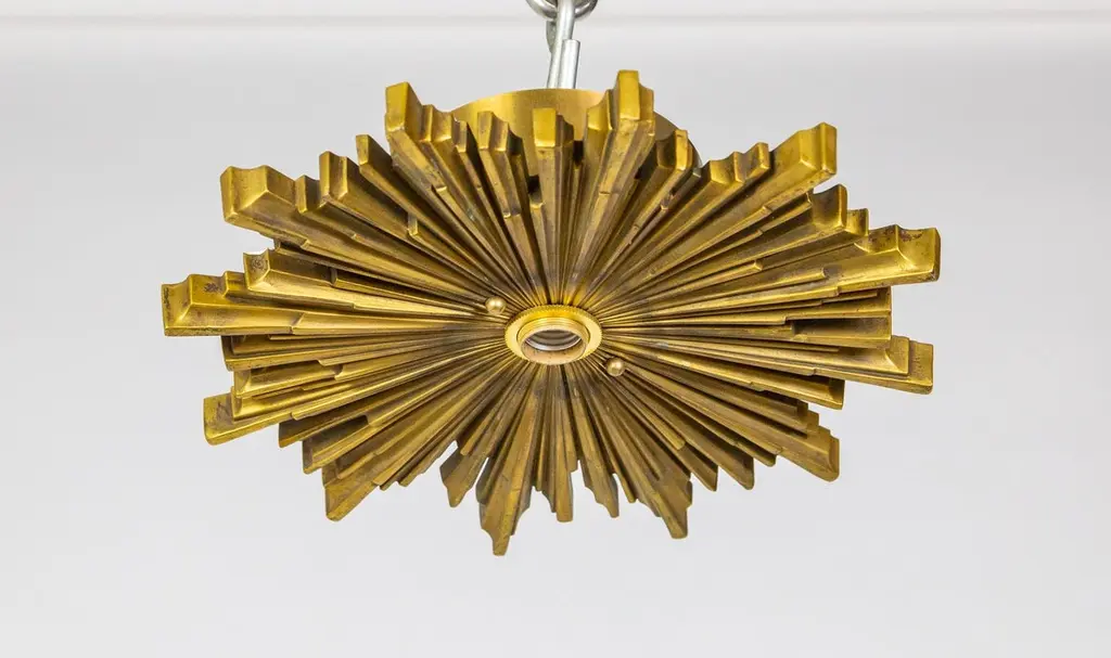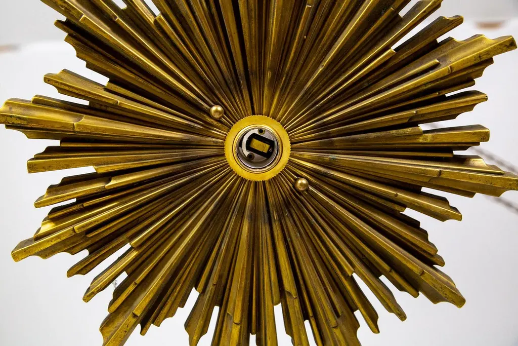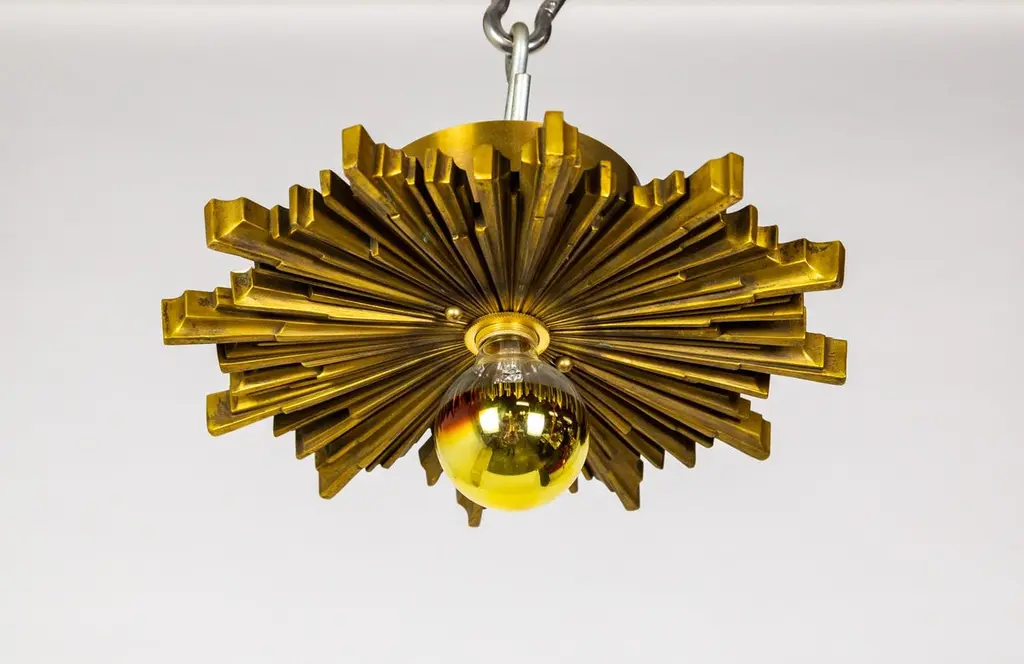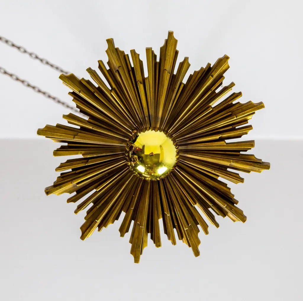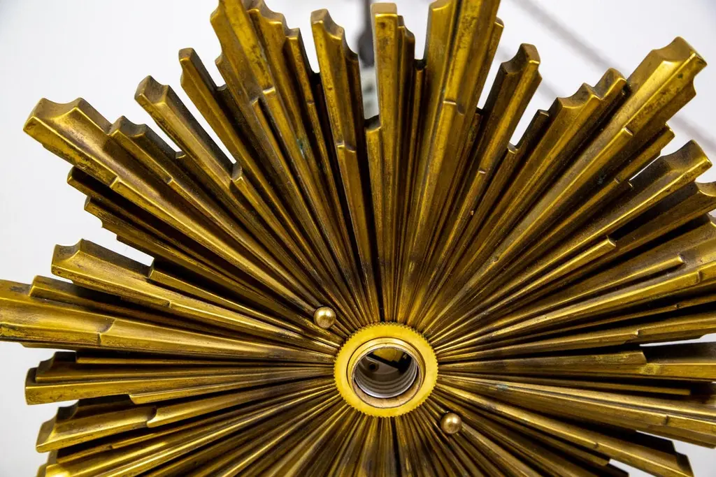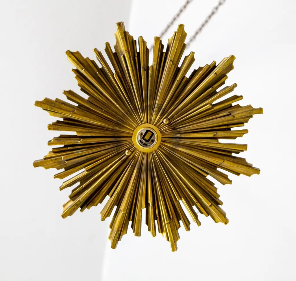 A finely cast metal starburst light fixture in deep gold tone from the early 20th century. The radial shape mimics sun beams in Art Deco style. Newly rewired with a high relief mount so it floats off the ceiling adding depth to the design. 14" diameter x 4.25" height.