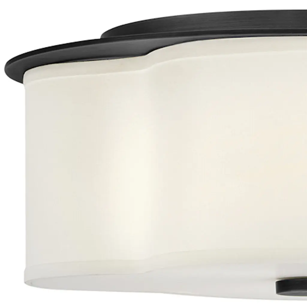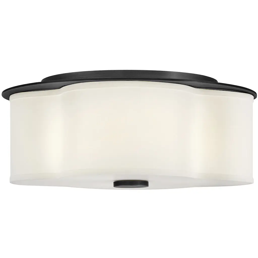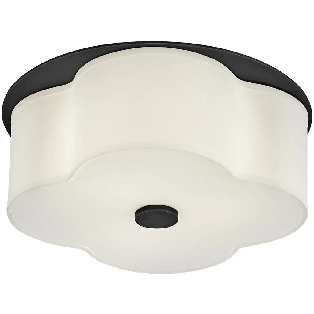 The curved quatrefoil silhouette of Delaney’s off-white linen shade elegantly complements traditional aesthetics. Etched glass softly diffuses light, while an oversized decorative canopy in Heritage Brass or Black provides a subtle contrast.