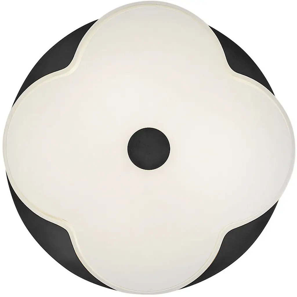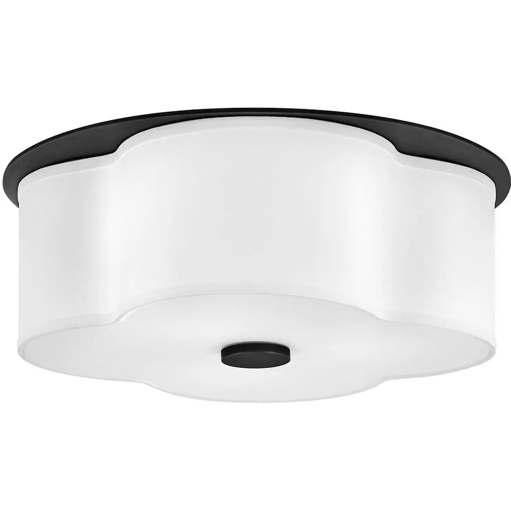 The curved quatrefoil silhouette of Delaney’s off-white linen shade elegantly complements traditional aesthetics. Etched glass softly diffuses light, while an oversized decorative canopy in Heritage Brass or Black provides a subtle contrast.