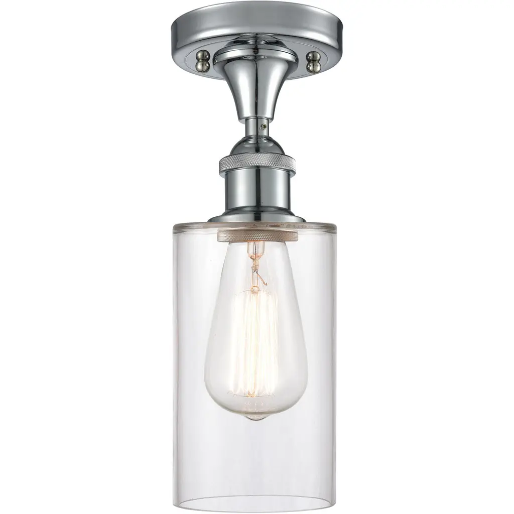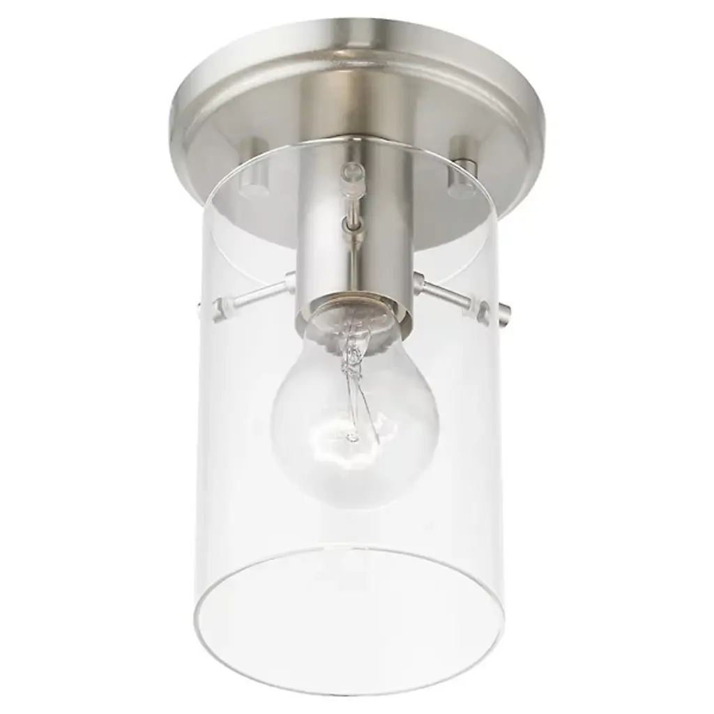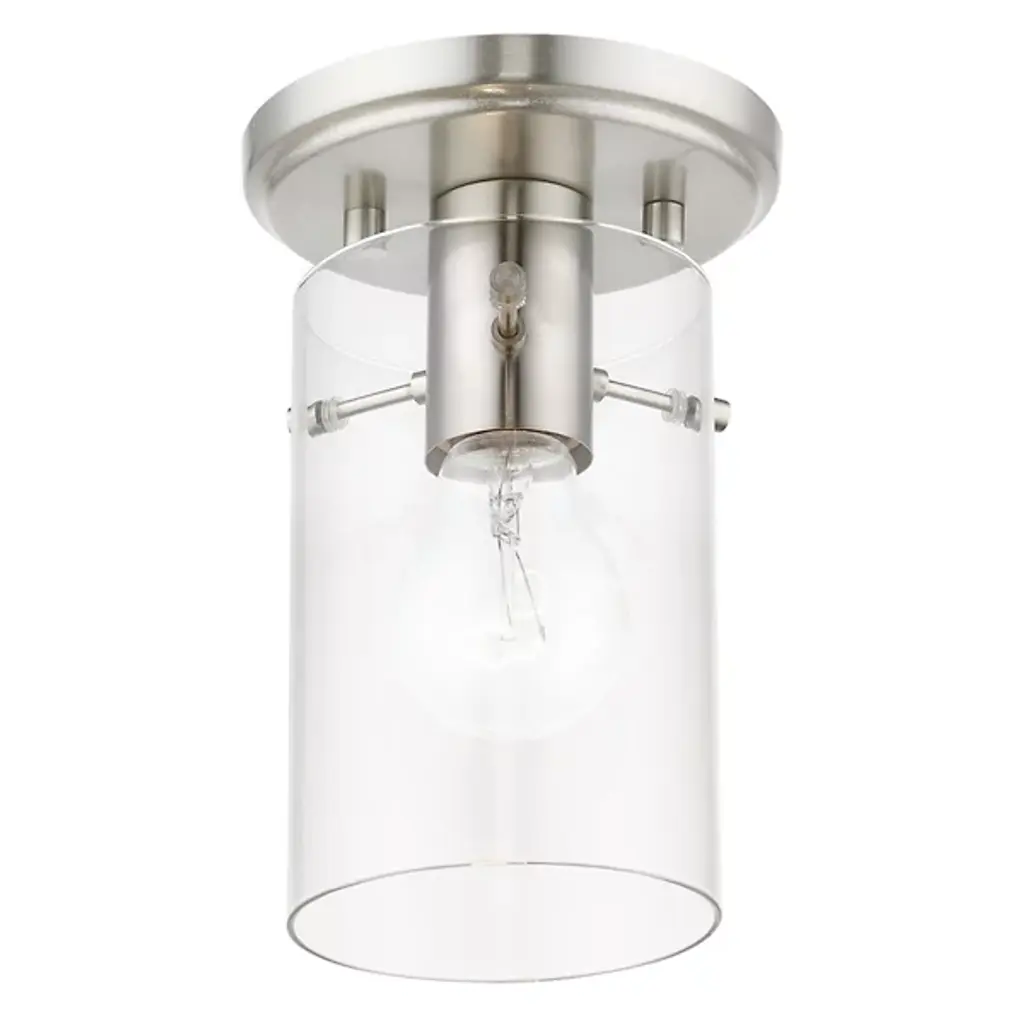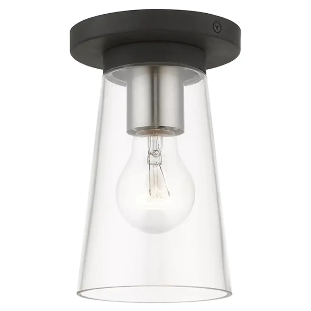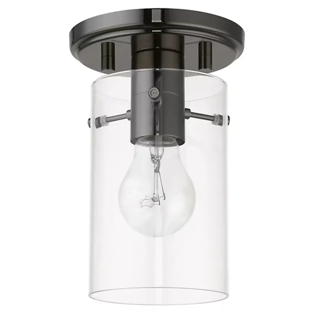 Enhance ceiling spaces with the inspired simplicity of the Delilah Flushmount from Alder & Ore. A striking cylindrical fixture halfway between transitional grace and industrial strength, it sends down a single damp-listed socket from a stepped circular canopy, using slender arms to support a cylinder shade of clear glass around it. This layered arrangement mellows glare to the sides, spilling out a mix of even warmth and focused downlight below.