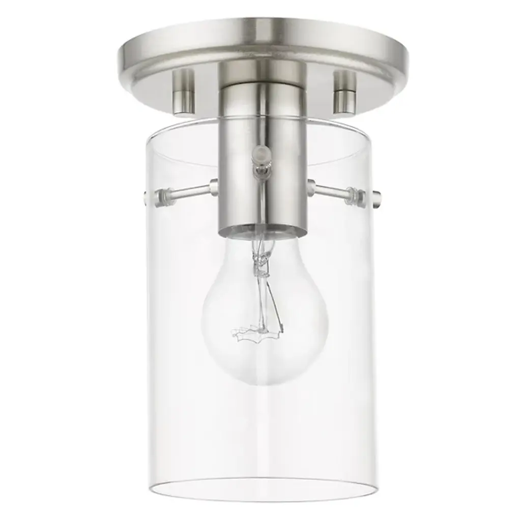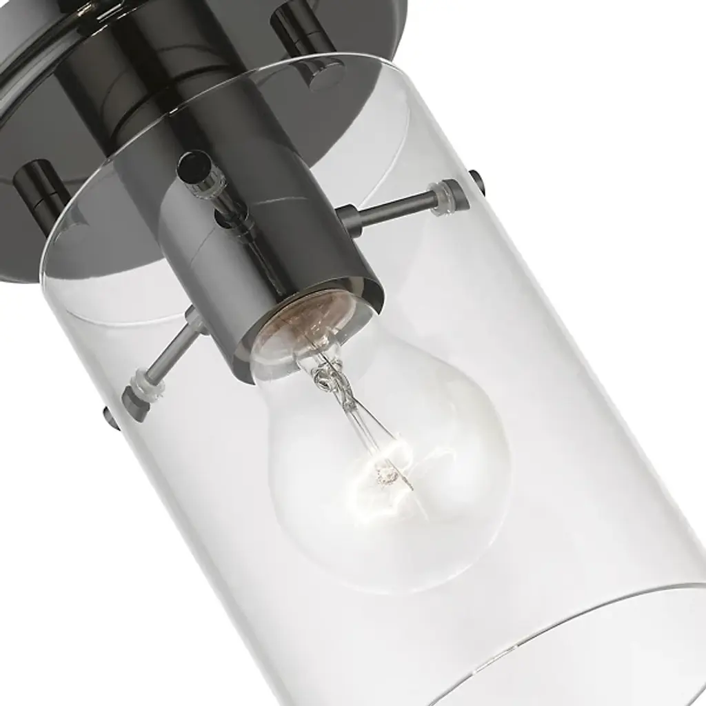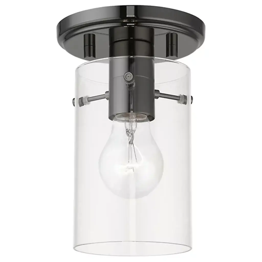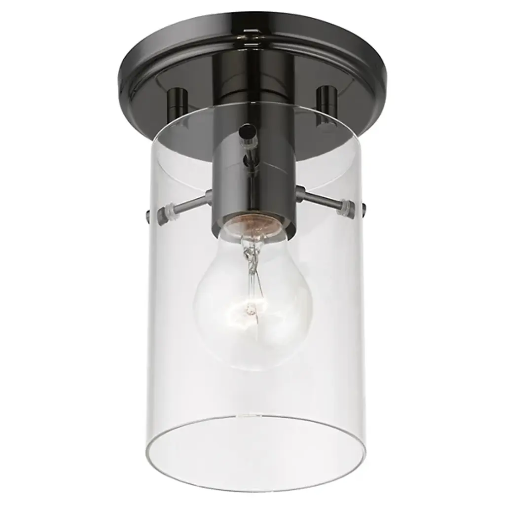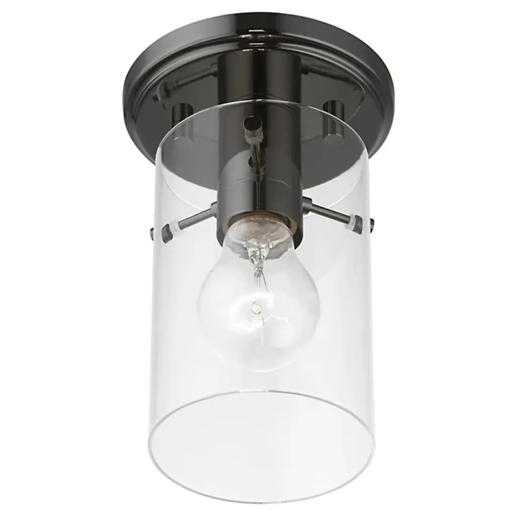 Enhance ceiling spaces with the inspired simplicity of the Delilah Flushmount from Alder & Ore. A striking cylindrical fixture halfway between transitional grace and industrial strength, it sends down a single damp-listed socket from a stepped circular canopy, using slender arms to support a cylinder shade of clear glass around it. This layered arrangement mellows glare to the sides, spilling out a mix of even warmth and focused downlight below.