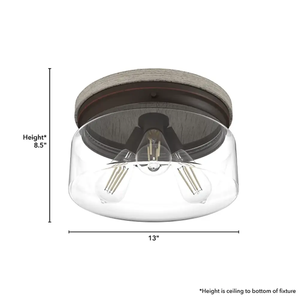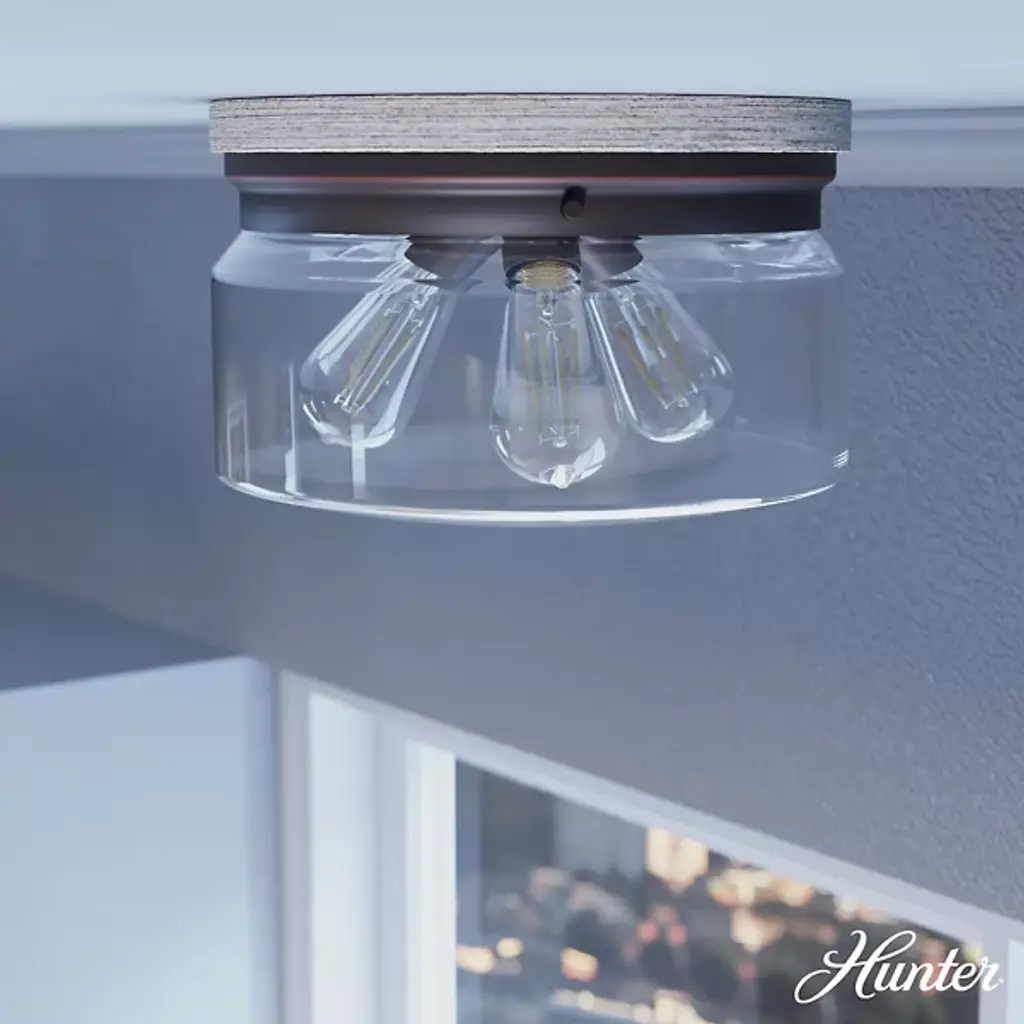Make a rustic addition to your inside spaces with the Devon Park Flush Mount from Hunter Fans. Well-suited to tight locations, it starts with a wood-grained round canopy that anchors three transitionally styled sockets angling down and out inside a clear glass diffuser with beveled accents. This barrier blunts a bright glare from the lamping, mellowing it into an even and all-encompassing glow that suffuses its surroundings while offering a welcome note of visual intrigue.