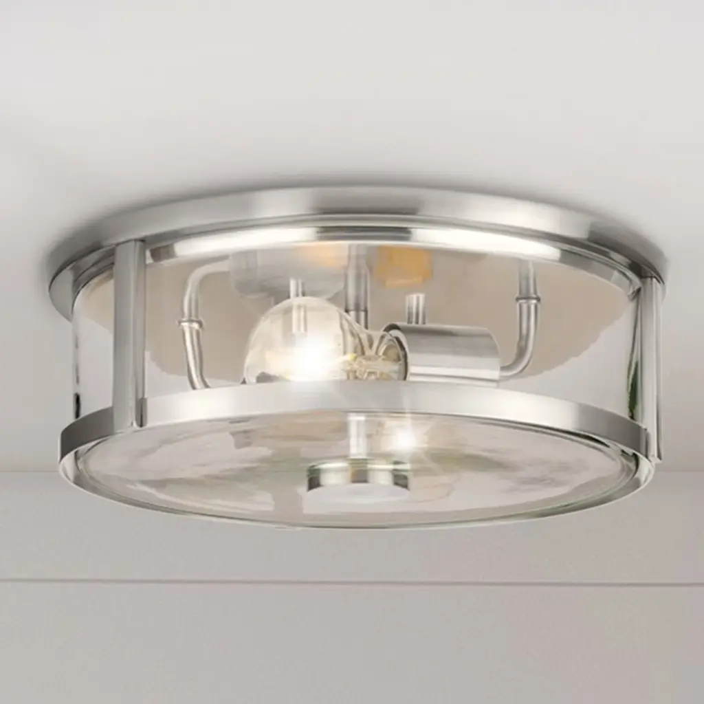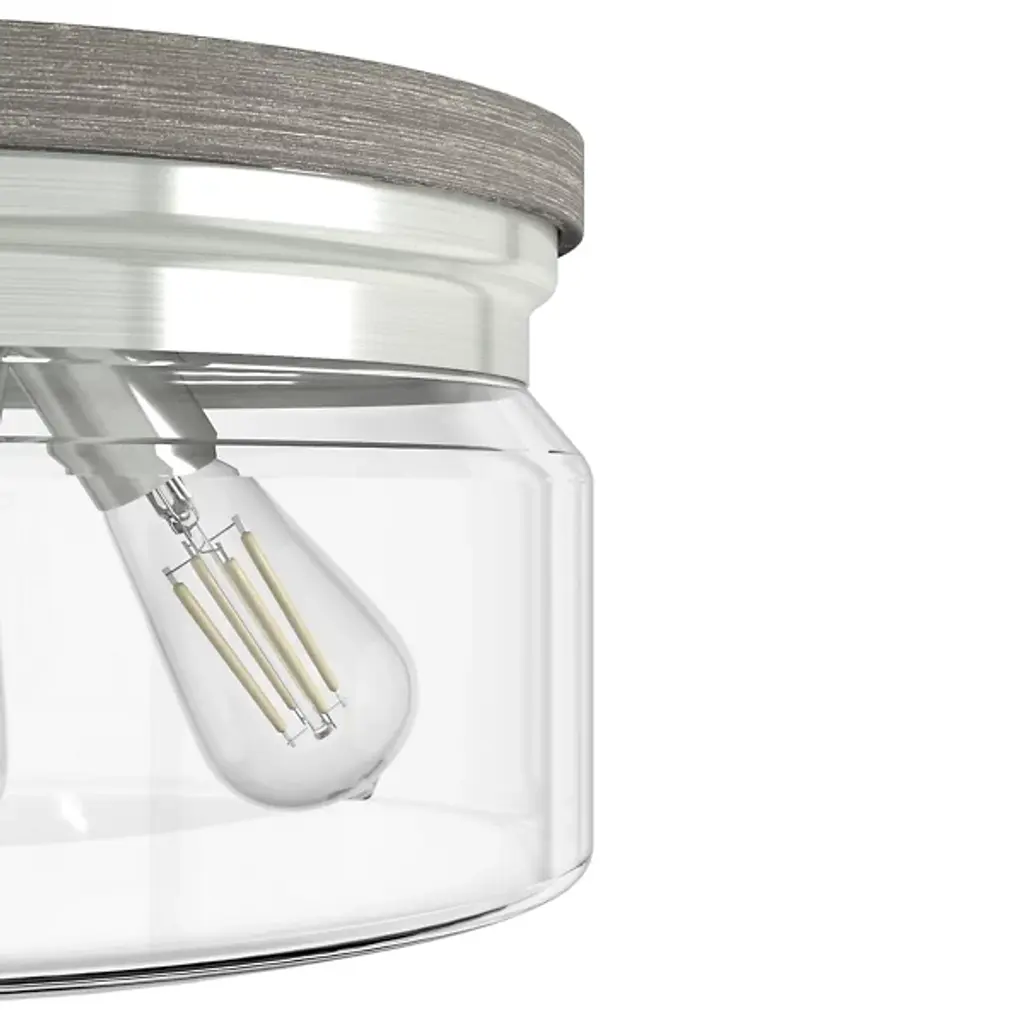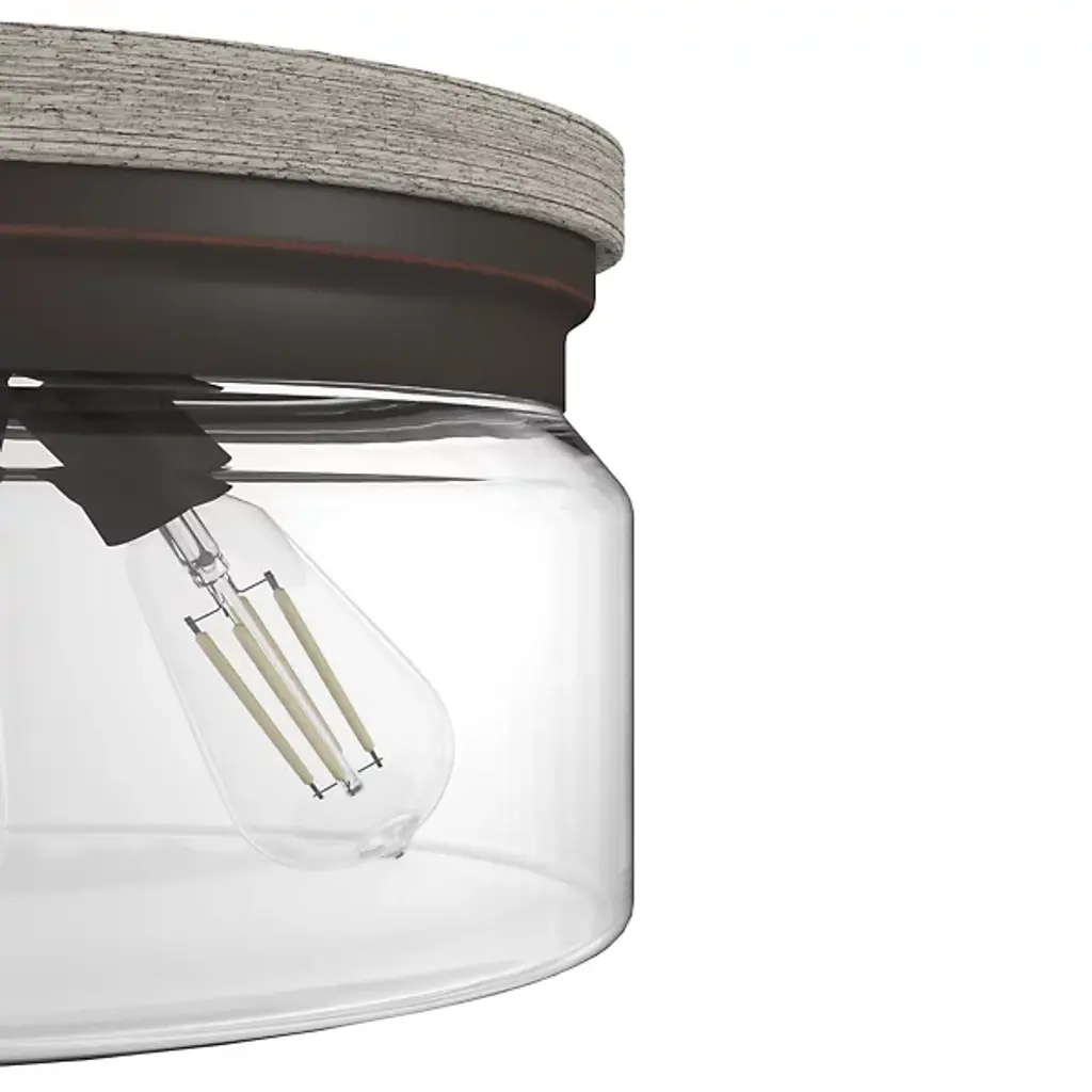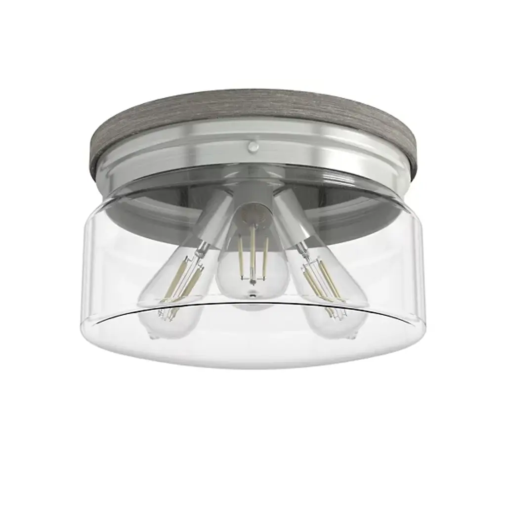 Make a rustic addition to your inside spaces with the Devon Park Flush Mount from Hunter Fans. Well-suited to tight locations, it starts with a wood-grained round canopy that anchors three transitionally styled sockets angling down and out inside a clear glass diffuser with beveled accents. This barrier blunts a bright glare from the lamping, mellowing it into an even and all-encompassing glow that suffuses its surroundings while offering a welcome note of visual intrigue.