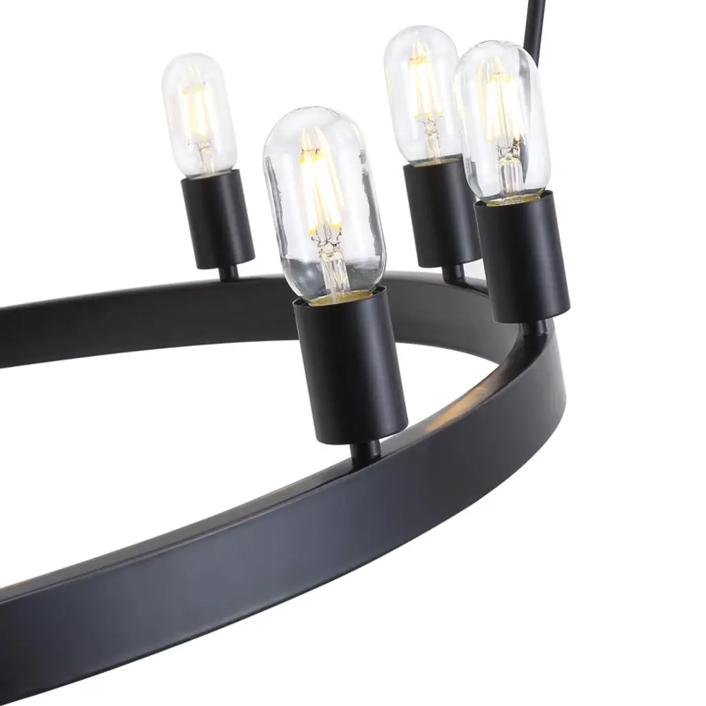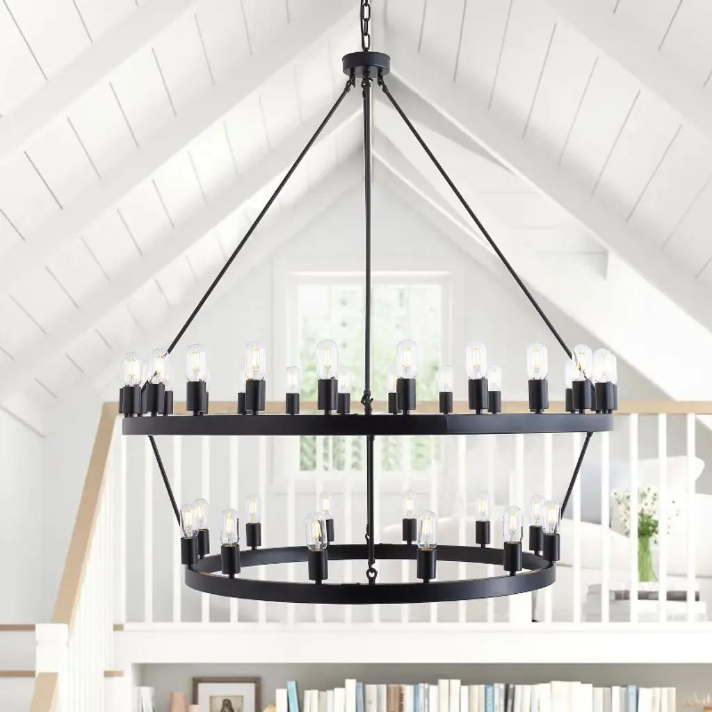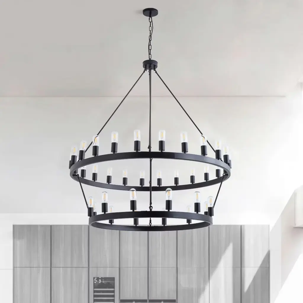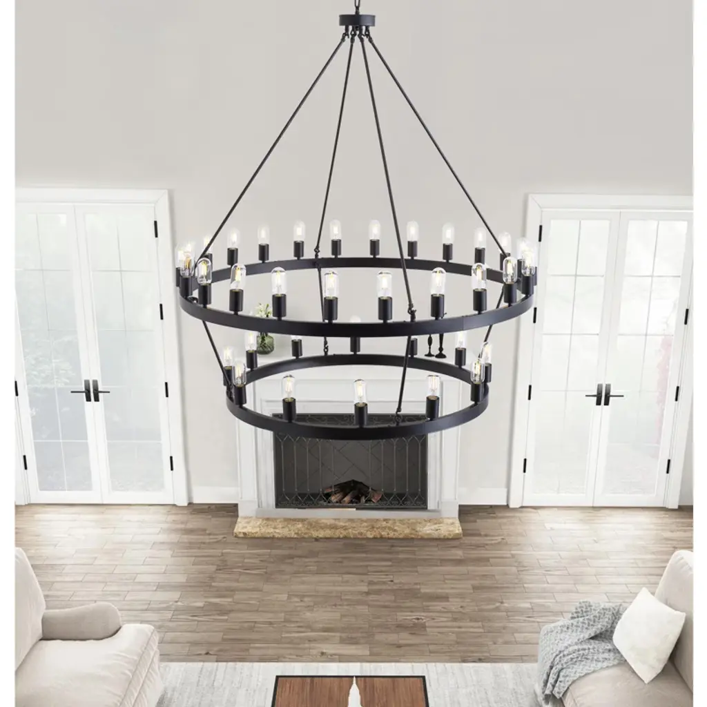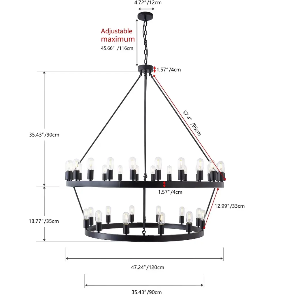 Specifications: Type: Industrial ChandelierMaterials: IronFinish: Painted Color: BlackNumber of Tiers: 2 Tier Number of Lights: 36 Light Direction: Multi-directional Wattage: 15W Voltage: 110V Base: E26 (bulbs not included)Dimensions: 2 Rounds Diameter: 35.43"+ 47.24"Chain/Cord/Rod Length: 45.66"Adjustable or Not: Yes Features: Industrial Retro Industrial Style: This 36-light farmhouse pendant light features an open, geometric frame with a matte black finish. Unique line design will make your house look stylish. Great for any kitchen island, living room, or dining room. Quality Assurance: High-quality iron craft with painted finish. All products in the factory have to undergo rigorous safety monitoring, to ensure quality and safety. Easy Assembly: With our installation guidelines, you can assemble the wall light in less than ten minutes. Installation instructions and mounting hardware are included in the package. Variety of Choices: Provide the most abundant categories of lighting products, to meet your needs. Our main products include LED Chandeliers, Pendant lights, Flush mount lights, Crystal Ceiling lamps, and island lights. Multiple Uses: This kitchen island chandelier is specially designed to illuminate the center of your living room, foyer, ceiling, dining room, or farmhouse-styled places.