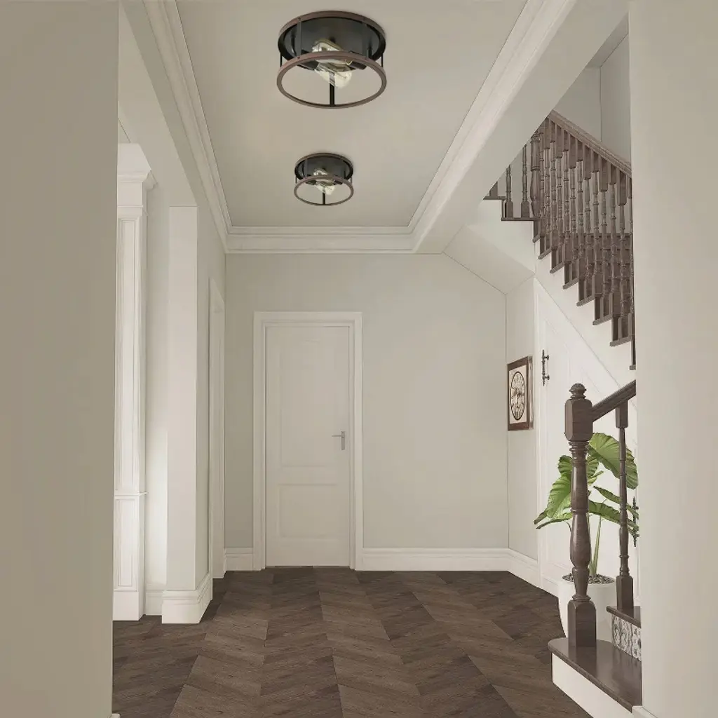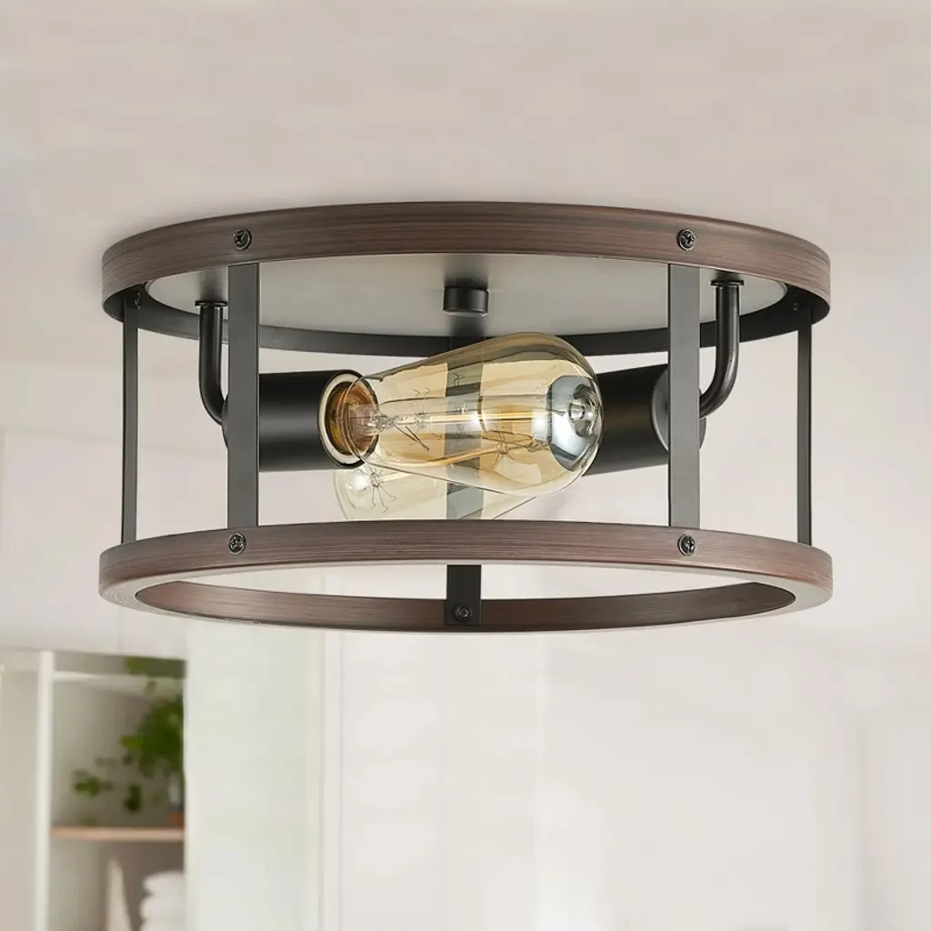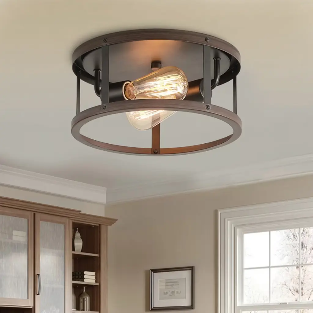 Specifications: Type: Farmhouse Flush Mount Ceiling LightMaterials: IronFinish: PaintedColor: BlackVoltage: 110VMax Wattage: 40WBulb Base: E26/Medium (Standard)Dimensions: 11.41 in. W x 11.41 in. D x 5.35 in. HNumber of Lights: 2 Lights (bulbs not included)Direction: Downlight Unique Openwork Design: The ceiling light has a metal frame and no glass, creating a modern industrial style. The light is finished with matte black, adding a touch of luxury that complements various interior designs and enhances your home decor. Quality Assurance: High-quality metal materials were used to craft the ceiling light. All products in the factory have to undergo rigorous safety monitoring, to ensure quality and safety, which is beautiful, corrosion-resistant, and durable for a long time. Easy to Install: Don't worry about the installation difficulty, we will attach the installation instructions to you, with clear installation instructions, the operation can be completed quickly. If you have any problems please feel freely to contact us. ETL Listed & Bulb Requirement: ETL Listed for your safety. The industrial ceiling light is a built-in standard E26 socket, suggest using a dimmable E26*2 base bulb (Max 40W, 110V), it could be fully dimmable and compatible dimmer switch. Bulbs and dimmer switch not included. Wide Application: The industrial and simple design of the ceiling makes it easily goes with your home. It is perfect for decorating your dining room, living room, bedroom, kitchen island, bathroom, hotel, hallway, foyer, office, loft, cafe, and so on.