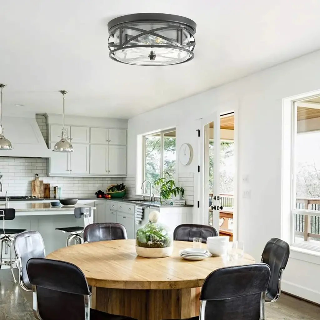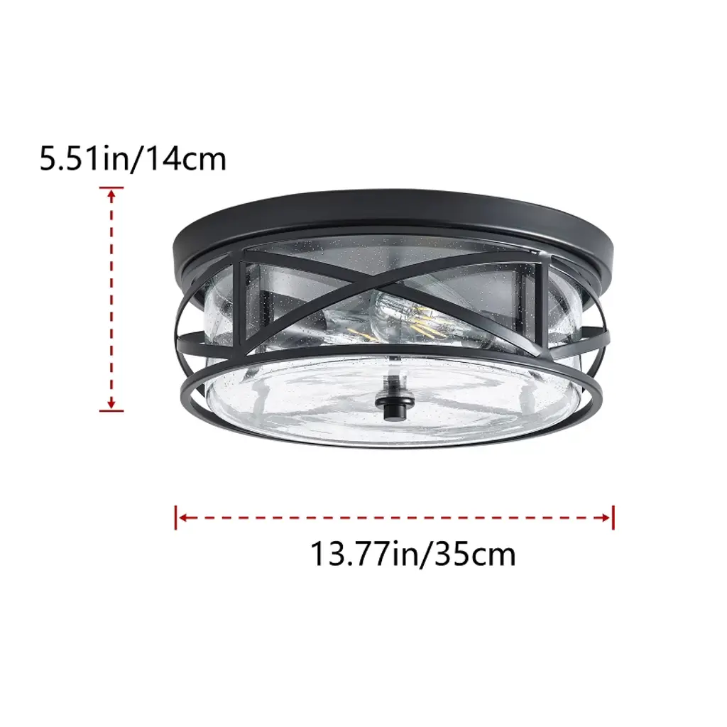 Enhance your home lighting with the Dewdrop Farmhouse Flush Mount Ceiling Light. Featuring a black iron frame and clear seeded glass shade, this 2-light fixture blends rustic farmhouse charm with industrial style. With two E26 sockets (40W max each, 120V), it works with LED, incandescent, or CFL bulbs for flexible lighting options. ETL certified for safety and durability, this flush mount light is ideal for bedrooms, hallways, kitchens, dining rooms, or entryways. Easy to install and built to last, it delivers both style and reliable illumination to any space.