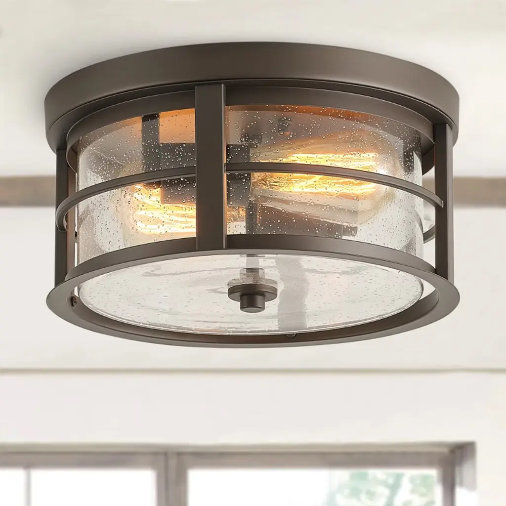 Enhance your home with the rustic charm of the Dewdrop flush mount ceiling light. Designed with an oil-rubbed bronze finish and a clear glass shade, this 2-light fixture blends farmhouse warmth with industrial style. Crafted from durable iron and glass, it is ETL certified for safety and long-lasting use. The fixture supports two E26 bulbs (max 40W, 110V, bulbs not included) and works with LED, incandescent, or dimmable bulbs to suit different lighting needs. Ideal for hallways, bedrooms, kitchens, and living rooms, this ceiling light adds character while delivering reliable illumination.