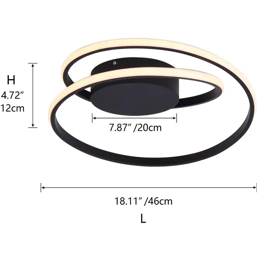 Specifications: Type: Modern Flush Mount Ceiling LightMaterials: Metal, AcrylicFinish: Painted Color: BlackNumber of Lights: 1 Light Base: LED Integrated Wattage: 34W Voltage: 110V Dimensions: 18.11 in. W x 18.11 in. D x 4.72 in. H Color Rendering Index: 80 Brightness (Lumens): 2700 Lm Color Temperature: 6500 K Features: Modern Modern Style: Modern classic modeling ceiling lamp, suitable for all kinds of decorative styles. Because of its unique shape, this lamp can not only provide sufficient lighting for the room but also make the room more distinctive and tasteful as a decorative supplement. Quality Assurance: High-quality metal and acrylic craft with painted finish. All products in the factory have to undergo rigorous safety monitoring, to ensure quality and safety. Easy to Install: The installation process is simple, and includes all mounting hardware and Accessories, if you have any problems please feel free to contact us. Dimmable Function: The black ceiling lights are designed with dimmable cool white (6500k), you could prepare a dimmable switch to achieve a dimmable function, we will not include a switch. Multiple Uses: With a modern and concise design, the ceiling light will be the centerpiece in your bedroom, living room, dining room, restaurant, foyer, and so on.