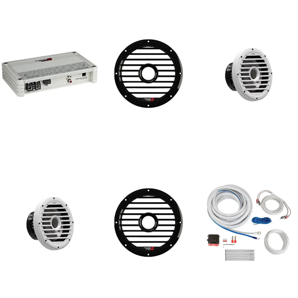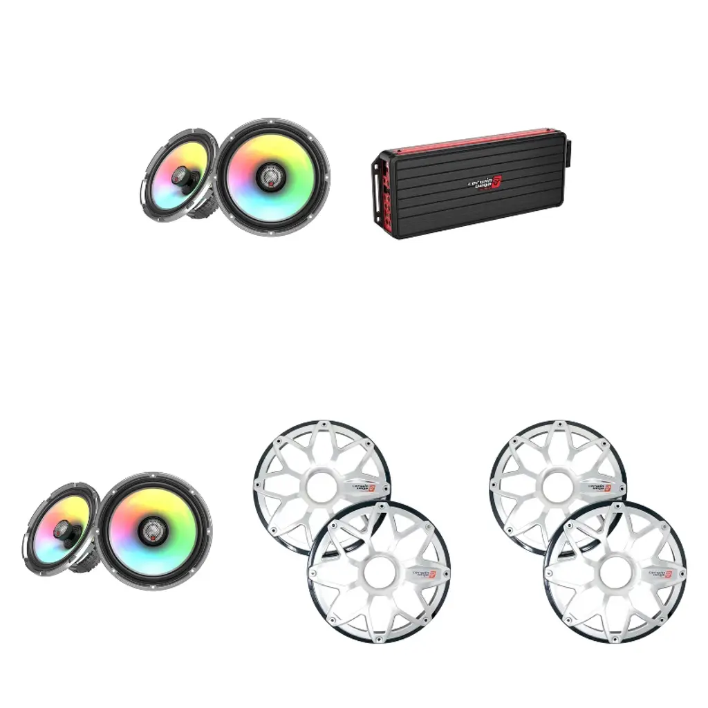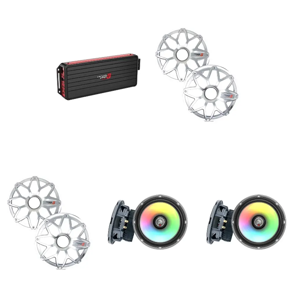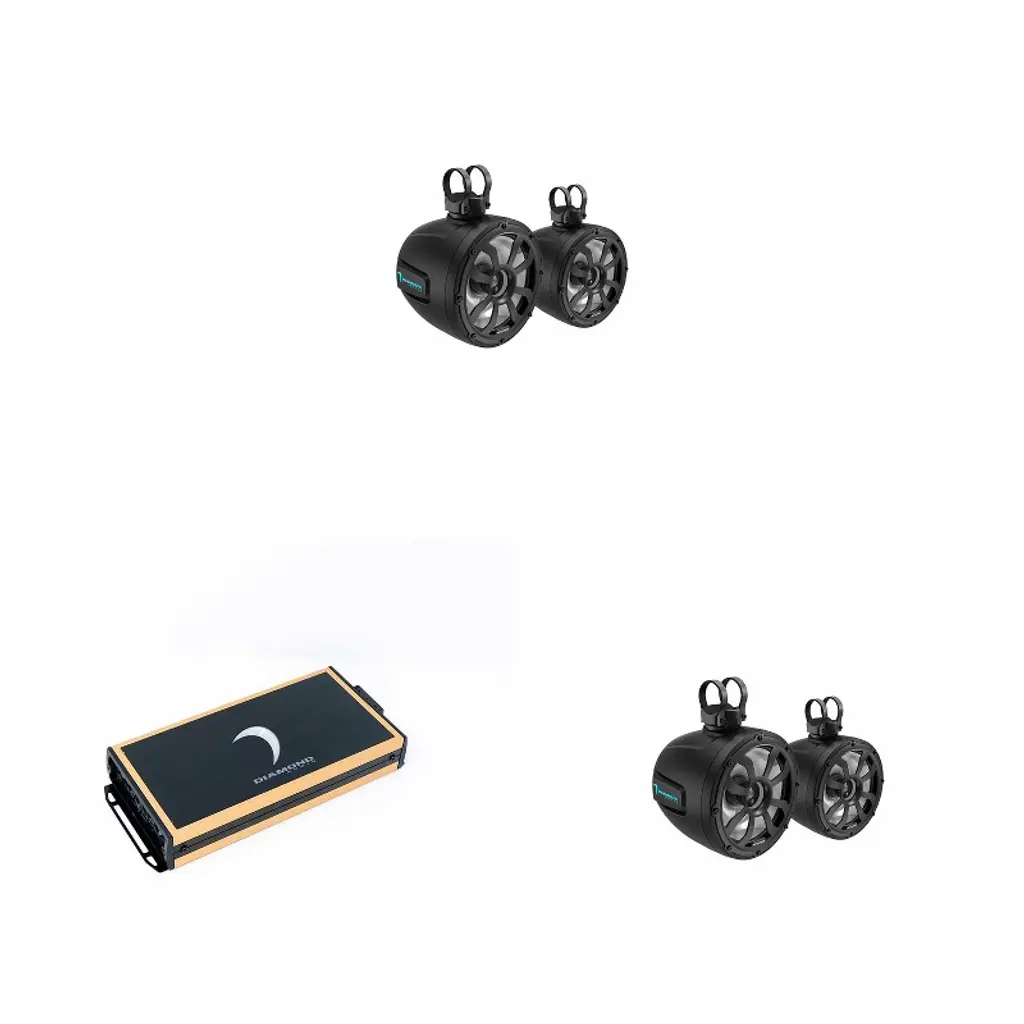 This bundle features a Diamond Microbu 4-Channel Amplifier, Polaris RZR Pro XP Door Speaker Pods, Diamond Motosport 6.5" Flush Mount Speakers, Speaker Grills, a Diamond Motorsport 8" Speaker Pod, and a Panel Rocker Switch Bluetooth Controller & Receiver. The MICRO84U amplifier offers 250W x 2 @ 4Ω RMS (bridged), 125W x 4 @ 2Ω, and 85W x 4 @ 4Ω, with dimensions of 9.1” x 4.1” x 1.46”. The RZR Pro XP Door Speaker Pods ensure optimal fit and durability in all weather conditions. The HXM65F4 Flush Mount Speakers deliver 450W Max/100W RMS power, with integrated RGB LED lighting. The HXM65FBB Speaker Grills come in a pair, black on black, while the POD8F4B Speaker Pod features a high-energy neo motor system and waterproof components. The BTR8 Bluetooth Controller & Receiver is water-resistant and ideal for various vehicles. Upgrade your audio system with this premium bundle, designed for durability and exceptional sound quality for marine and all-terrain applications. Experience the superior performance and sleek aesthetics of Diamond Audio products, perfect for elevating your outdoor adventures. Enjoy high-quality audio with features like all-weather durability, marine-grade compliance, UV stability, and integrated RGB LED lighting. Easily install these products and enhance your outdoor audio setup with top-notch technology and engineering. Elevate your sound experience with Diamond Audio and take your outdoor entertainment to the next level!