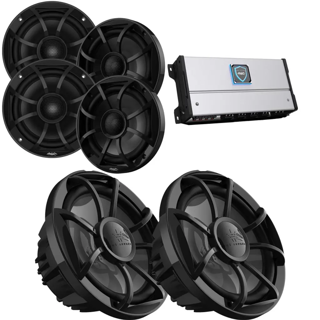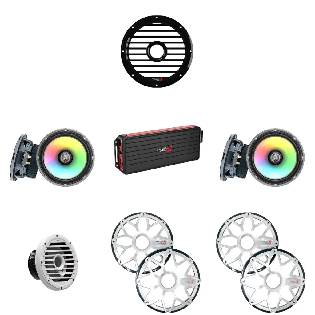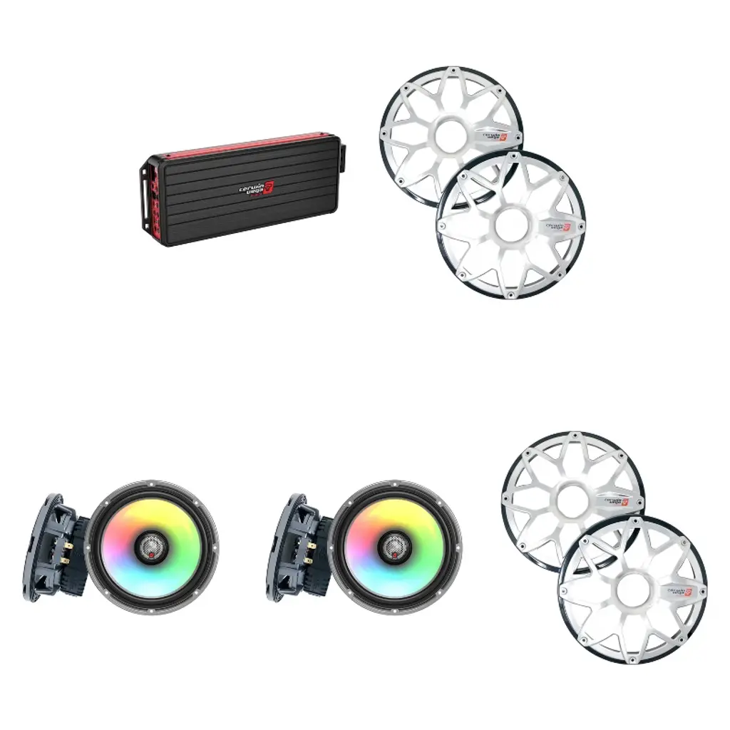 This bundle features a Diamond Audio MICRO84U Microbu 4-Channel Amplifier, a Polaris RZR Pro XP Door 6.5" Speaker Pods, Diamond Audio HXM65F4 6.5" Flush Mount Speaker, Diamond Audio HXM65FBB Flush Mount Speaker Grills, and a Diamond Audio POD10F4B 10" Marine Tower Speaker. The MICRO84U amplifier offers 125W x 4 @ 2Ω, 85W x 4 @ 4Ω, 250W x 2 @ 4Ω Bridged, with all-weather application and sleek design. The Polaris RZR Pro XP door 6.5" pods provide optimal sound quality and durability, fitting seamlessly with factory mounting locations. The HXM65F4 speaker boasts 450W Max/100W RMS power, UV stability, salt resistance, and titanium dome tweeter for clear audio. The HXM65FBB speaker grills offer a stylish black finish. The POD10F4B marine tower speaker features a titanium dome tweeter, high performance with 200W RMS/400W MAX power, IP65 marine grade compliance, UV stability, and RGB LED lighting for ambiance. These high-end components are designed for marine, all-terrain, and recreational activities, delivering exceptional audio performance in challenging outdoor conditions. Elevate your outdoor audio experience with this premium bundle from Diamond Audio.