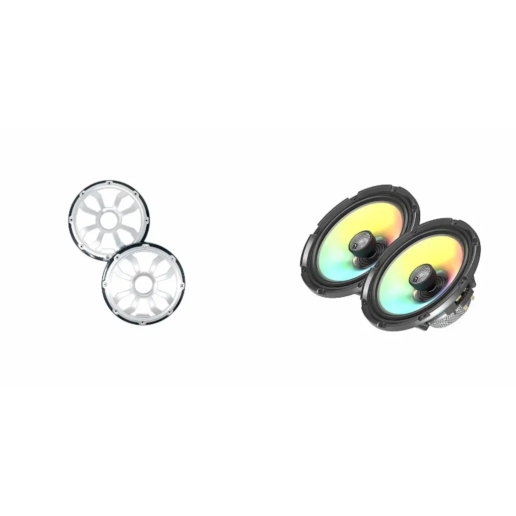 The Diamond Audio Marine Speaker Bundle combines top-tier audio performance with rugged durability for all your outdoor adventures. The bundle includes the Diamond Audio HXM8F4 8" 2-Way Marine Speaker with Titanium Dome Tweeter (4Ω) and a pair of HXM8FGB Motorsport 8" Flush Mount Speaker Grills in Black/Stainless. Diamond Audio's MOTORSPORT series speakers are built to excel in marine, all-terrain, and leisure environments, delivering exceptional audio quality even in harsh conditions. Crafted with high-tech aerospace materials, these speakers offer maximum durability and top-notch performance, ensuring a rich and powerful sound experience wherever you go. Specifications: - 150W RMS / 300W MAX Power Handling - Flush Mount Design - Water and Salt Water Resistant, 100% UV Stable - Ultra Small Neodymium Motor Structure - High Temp Injection Molded Basket - Molded, UV-Coated, Waterproof Cone - Integrated Dream RGB LED Lighting - Mounting Diameter: 7.13" / 181mm - Mounting Depth: 3.15" / 80mm Upgrade your outdoor audio system with Diamond Audio's marine speakers and enjoy crisp highs, detailed mids, and powerful bass, expertly balanced for an immersive listening experience. With precision craftsmanship and reliability, these speakers provide the ultimate sound performance for your boat, ATV, or recreational vehicle. Elevate your outdoor audio with Diamond Audio and embark on a journey of premium sound quality and rugged dependability.