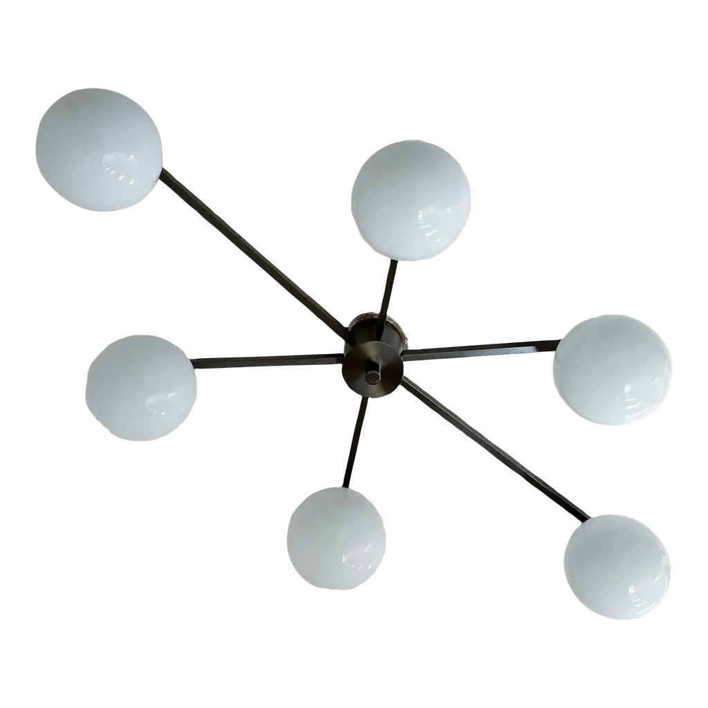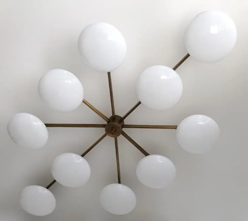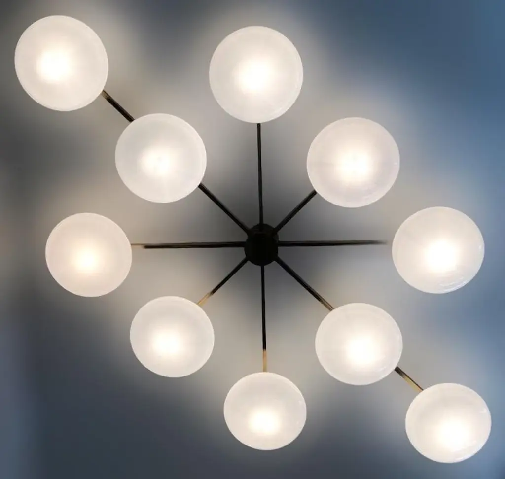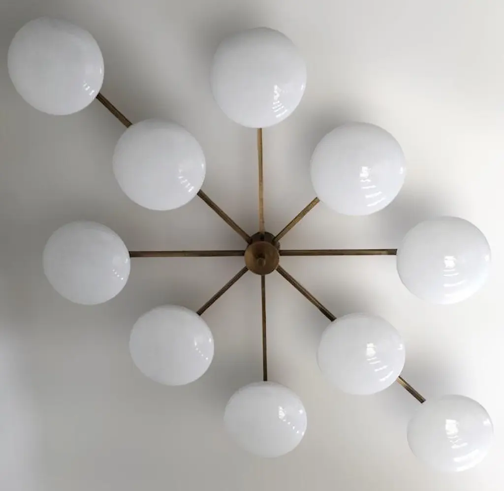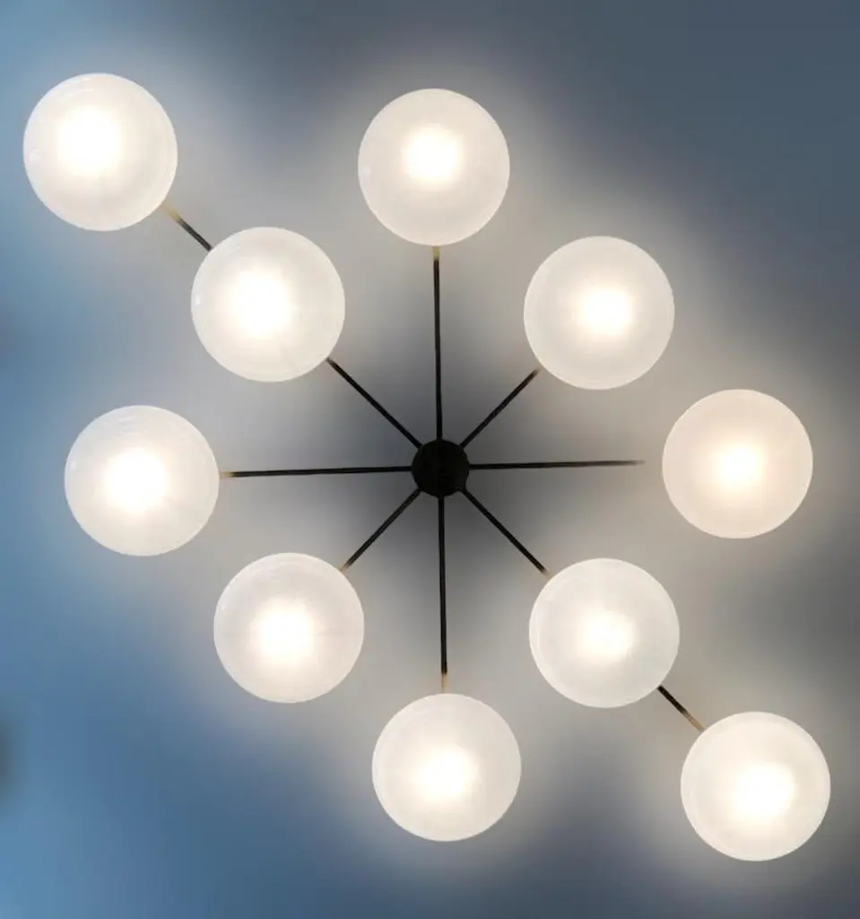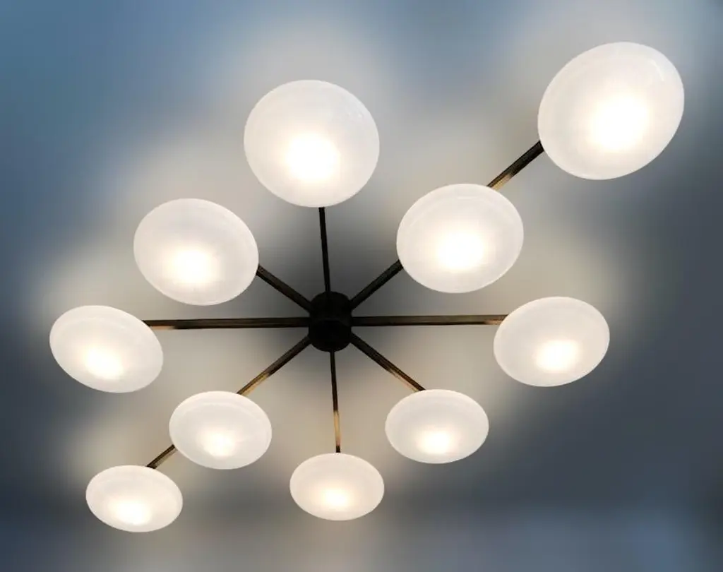 Italian flush mount with Murano glass shades mounted on solid brass frame / Designed by Fabio Bergomi by Fabio Ltd / Made in ItalyLength: 81 inches / Width: 44 inches / Height: 8 inches10 lights / E12 or E14 type / max 40W eachOrder only / This item ships from ItalyOrder Reference #: FABIOLTD DIECI SHADE FLUSH MOUNTThe listed price applies to all Brass finishes : Unlacquered Natural Brass, Unlacquered Polished Brass, Lacquered Polished Brass, Lacquered Satin BrassOther finishes available with upcharge of $700: Bronzed, Polished Chrome, Satin Chrome, Polished Nickel, Satin Nickel, Polished Black Nickel, Satin Black Nickel, Polished Copper, Satin Copper