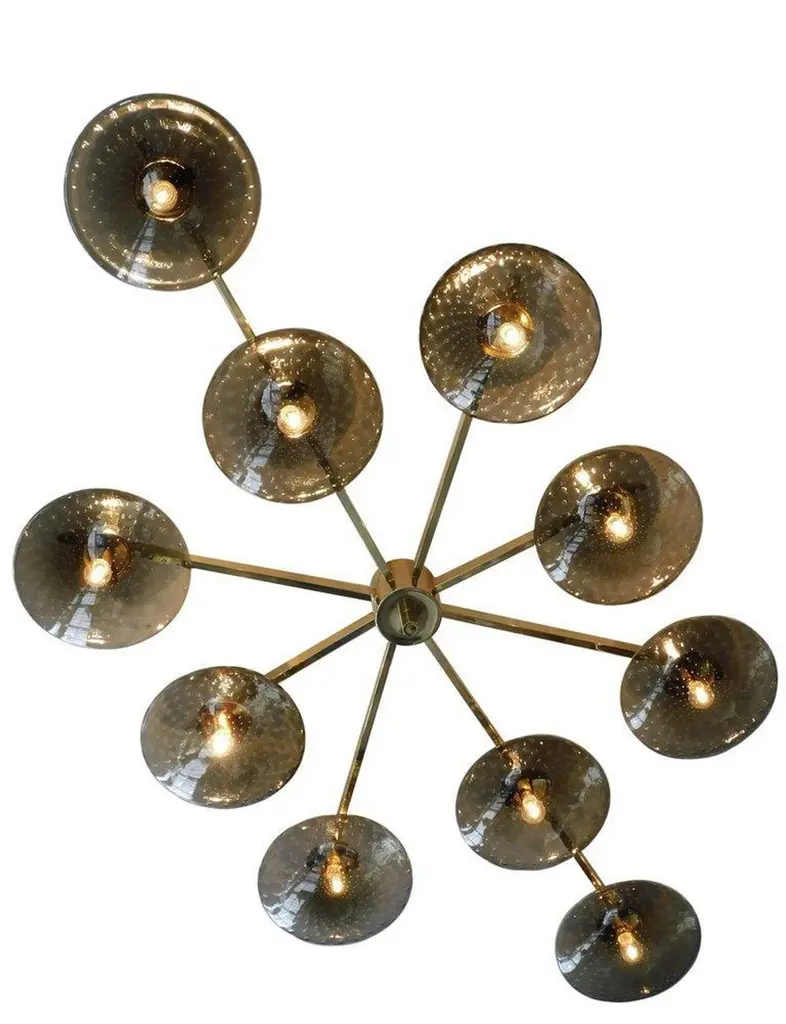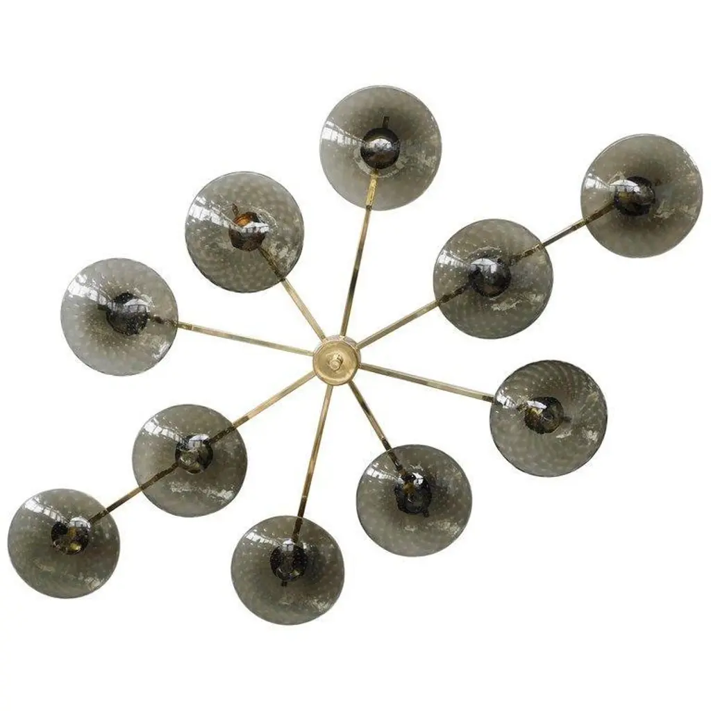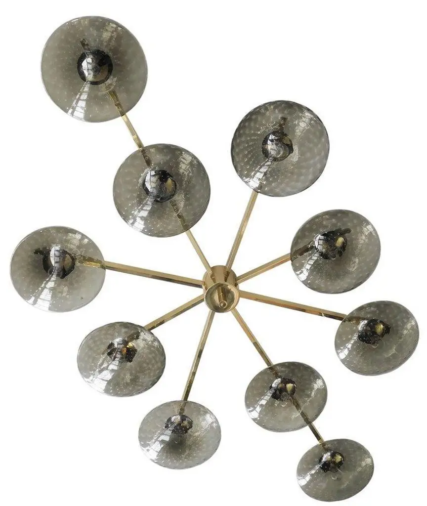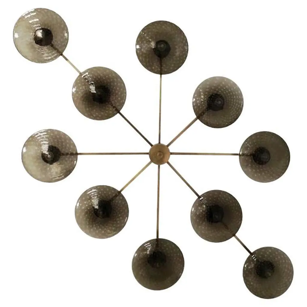 Italian flush mount with Murano glass shades mounted on solid brass frame / Designed by Fabio Bergomi by Fabio Ltd / Made in ItalyLength: 81 inches / Width: 44 inches / Height: 8 inches10 lights / E12 or E14 type / max 40W eachOrder only / This item ships from ItalyOrder Reference #: FABIOLTD DIECI SHADE FLUSH MOUNTThe listed price applies to all Brass finishes : Unlacquered Natural Brass, Unlacquered Polished Brass, Lacquered Polished Brass, Lacquered Satin BrassOther finishes available with upcharge of $700: Bronzed, Polished Chrome, Satin Chrome, Polished Nickel, Satin Nickel, Polished Black Nickel, Satin Black Nickel, Polished Copper, Satin Copper