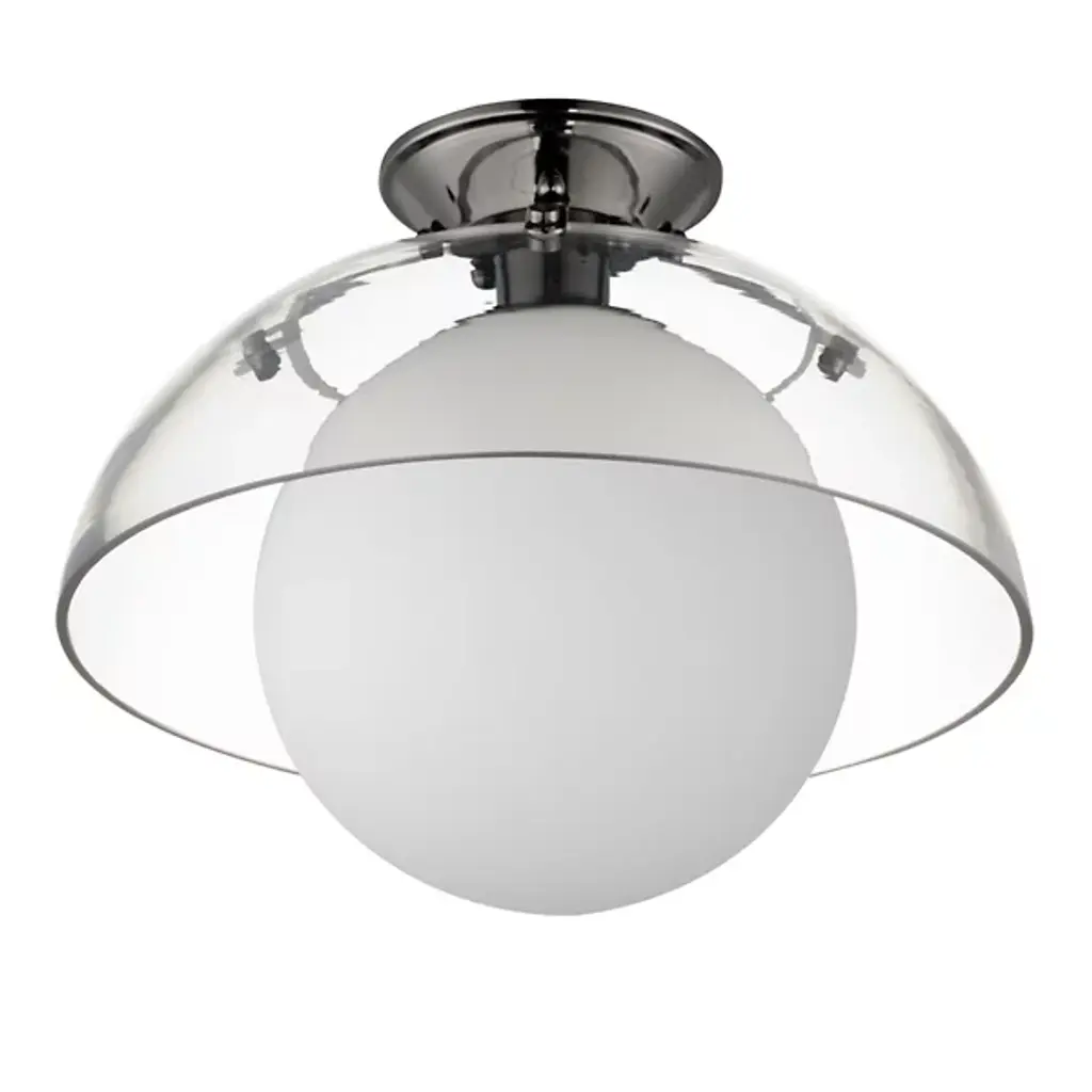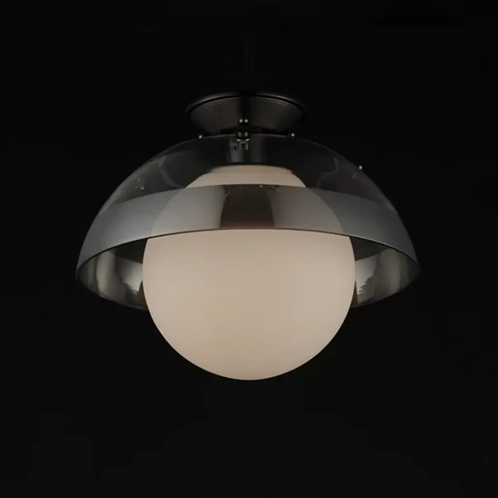 The Domain Flushmount from Studio M exudes casual sophistication and presents a versatile array of applications and finishes. Its design showcases a truncated sphere with open top and bottom, which allows Opal White glass shades within to emit ample LED lighting. The outer glass, suspended by stitched leather, harmonizes with the metal finish. Crafted by Mat Sanders, this fixture offers flexibility for various interior spaces, marrying style with functionality effortlessly.