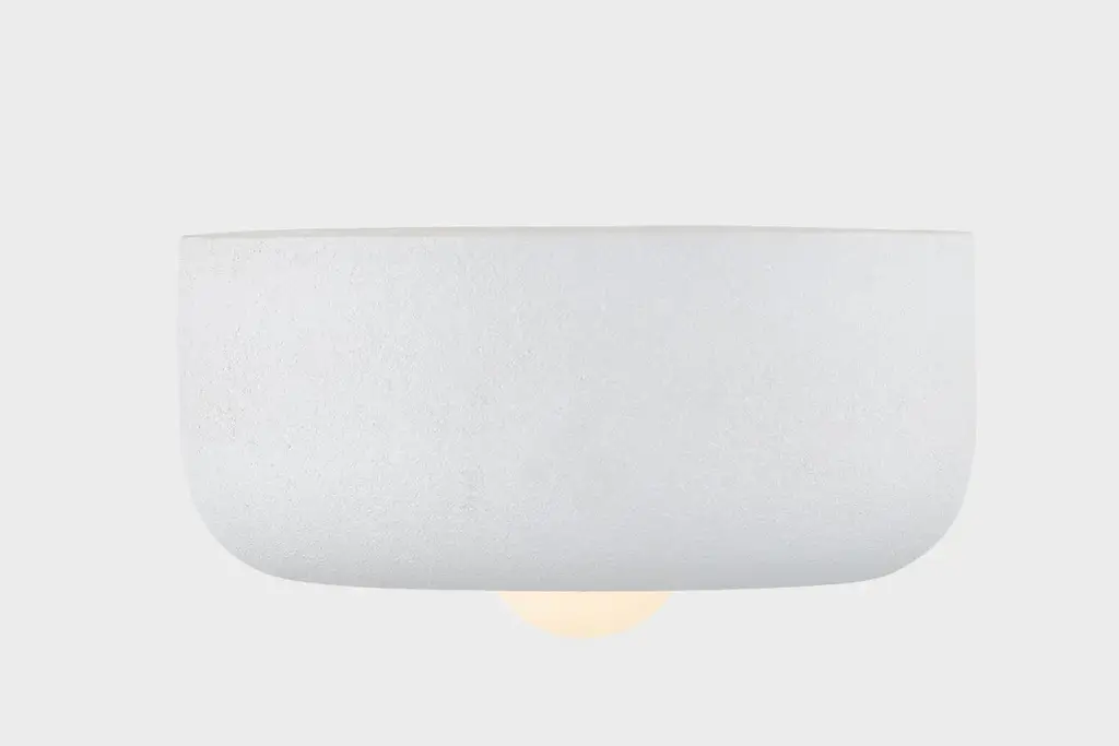A rounded, cloud-like form in Textured White ceramic brings both the tactile minimalism and chubby comfort trends close to the ceiling. The partially exposed bulb sits in a "pocket" at the center filling the space with a warm glow. This low-profile flush mount makes a chic, earthy statement overhead in bedrooms, hallways, and other ceilings throughout the home.