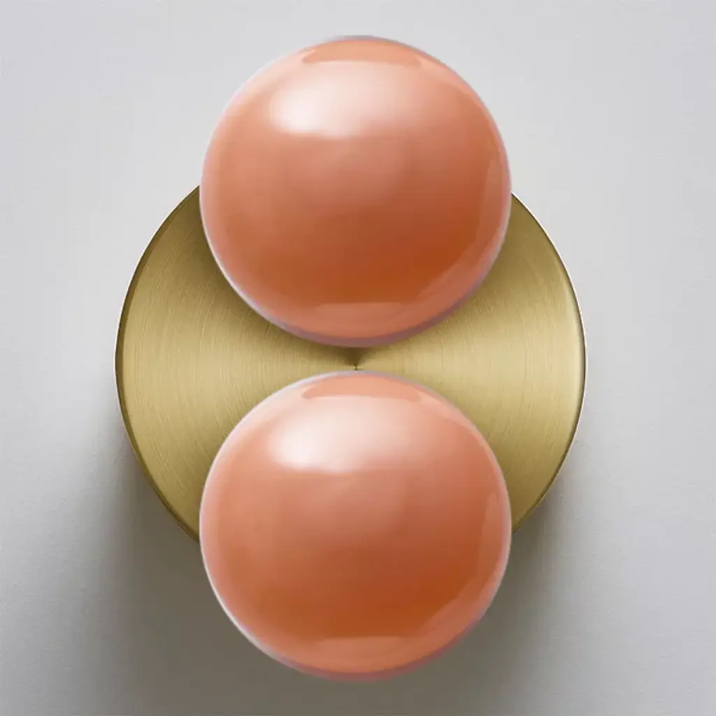 The Dot 2X Wall / Flushmount from SkLO pairs a clean silhouette with a joyful sense of color. A smooth design created to spark a happy emotional response, its circular form supports two rounded, hand-blown glass diffusers made in the Czech Republic, each with the rich color and depth reminiscent of hard candy. These vibrant diffusers emit a soft, inviting glow, providing a warm contrast to the polished brass mounting plate. The fixture is ADA compliant if installed on walls, while its compact size makes it great for even low ceilings, bringing a playful, refined touch to interiors.