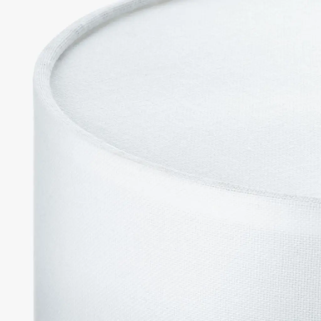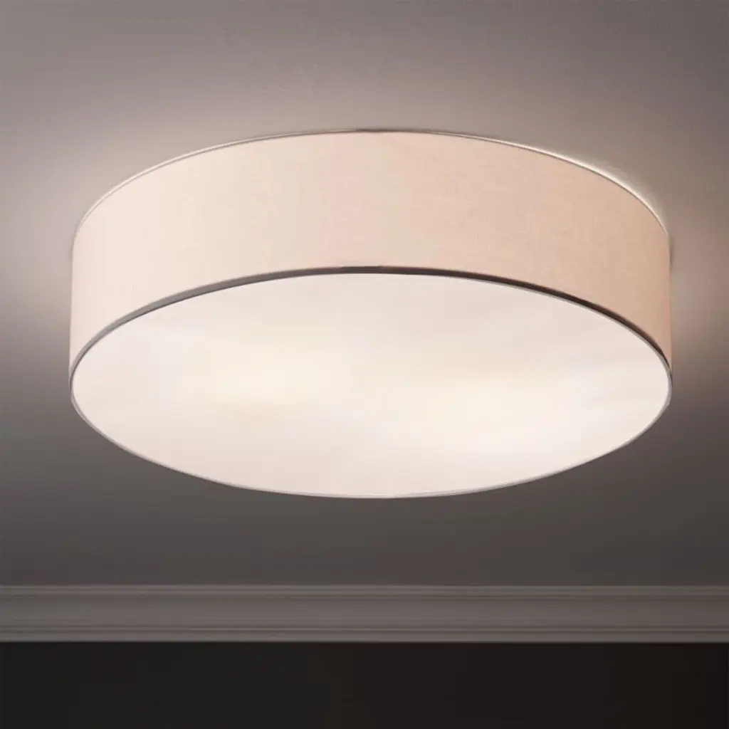 Elevate the standard lighting down the hall and or center of the ceiling with this understated light that spans nearly three feet. Broad, low-slung circle diffuses a soft glow in clean, white linen. Simple, shallow profile is a perfect fit for lower ceilings.