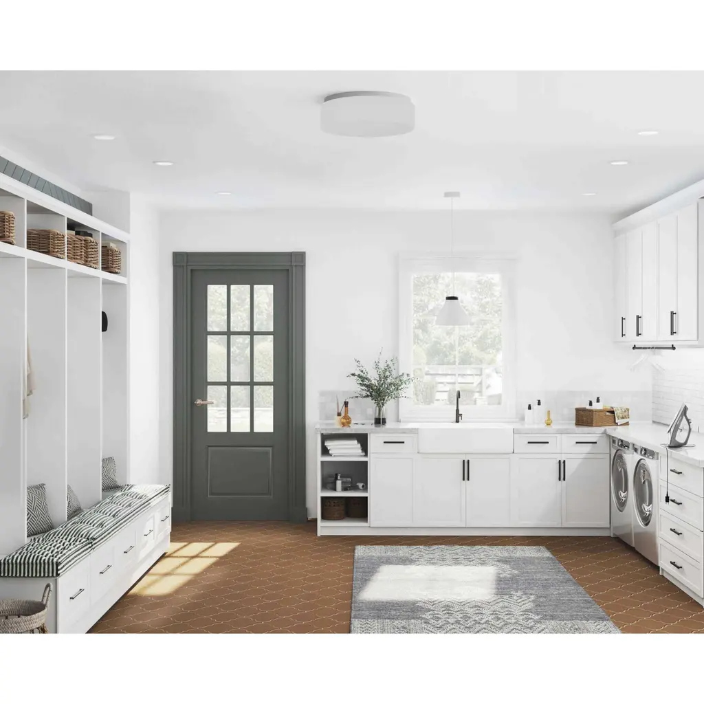 LED flush mount with white acrylic diffuser mounts to baked enamel ceiling pan. Twist on installation with a single locking thumb screw. ETL approved for damp locations. Ceiling or wall mount. 1680 lumens, 80 lumens/watt (delivered), 3000K and 90CRI. ENERGY STAR and Title 24. White finish.
