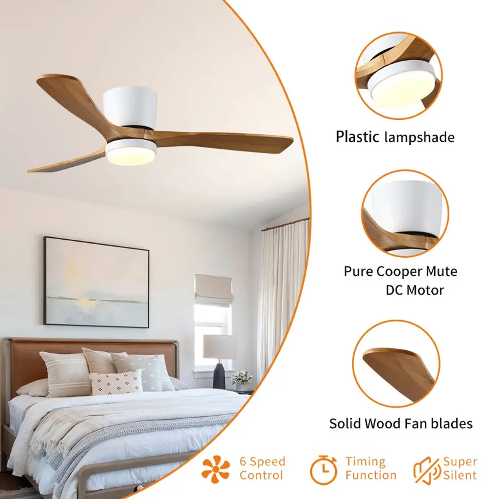 Enhance your space with Duclsaty’s 42-inch ceiling fan with light, featuring real solid wood blades and a white alloy steel body for a stylish rustic touch. Designed for indoor use and covered outdoor areas like patios or gazebos (not waterproof), this fan delivers powerful airflow and operates quietly with a reversible DC motor (<35dB)—perfect for 15x15 ft rooms, bedrooms, or other peaceful environments. The 18W LED light offers 3 color temperatures (3000K–6500K) with 10–100% dimming for flexible ambiance, while the 6-speed fan, 2/4/8-hour timer, and reversible function provide year-round comfort. Control everything using the included remote or through a dedicated mobile app (note: not compatible with smart systems like Alexa or Google Home). The low-profile 9.8" flush mount design is ideal for standard flat ceilings—this model does not support sloped ceilings and is not height adjustable. The wall-mountable remote holder keeps controls handy (batteries not included). For troubleshooting: ensure wiring and battery placement are correct. To re-pair the remote, cut power at the breaker, wait 10 seconds, restore power, then press and hold the FAN/OFF button for 6 seconds until the light flashes. This fan combines natural beauty with modern convenience, making it a perfect choice for stylish, functional living.