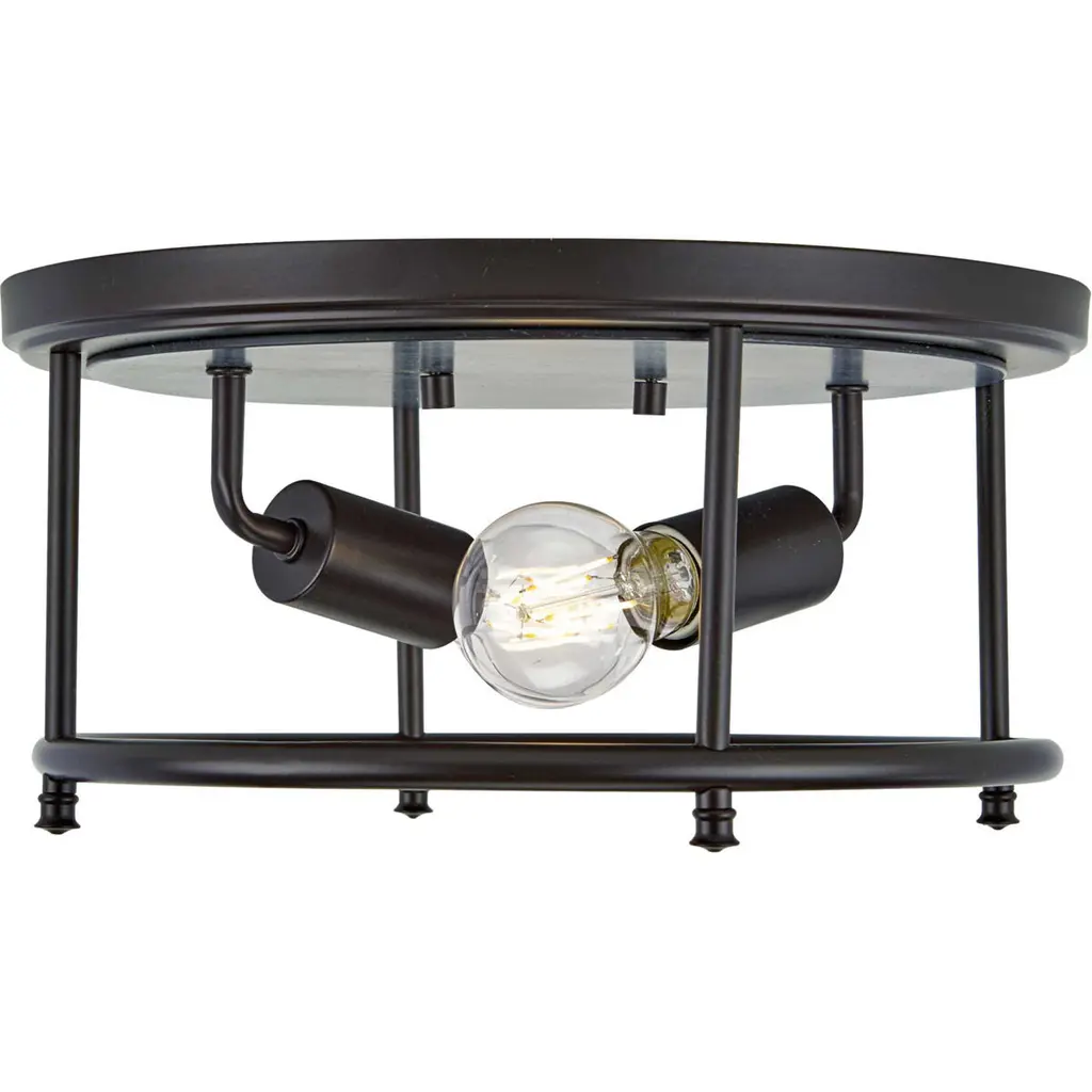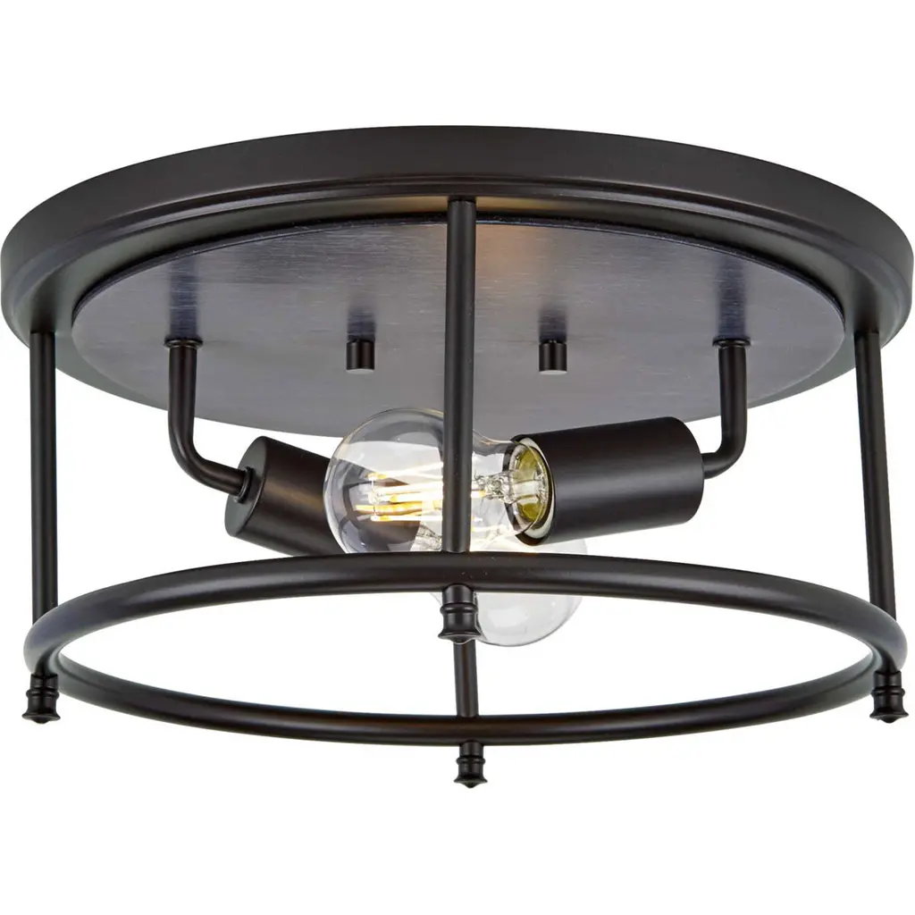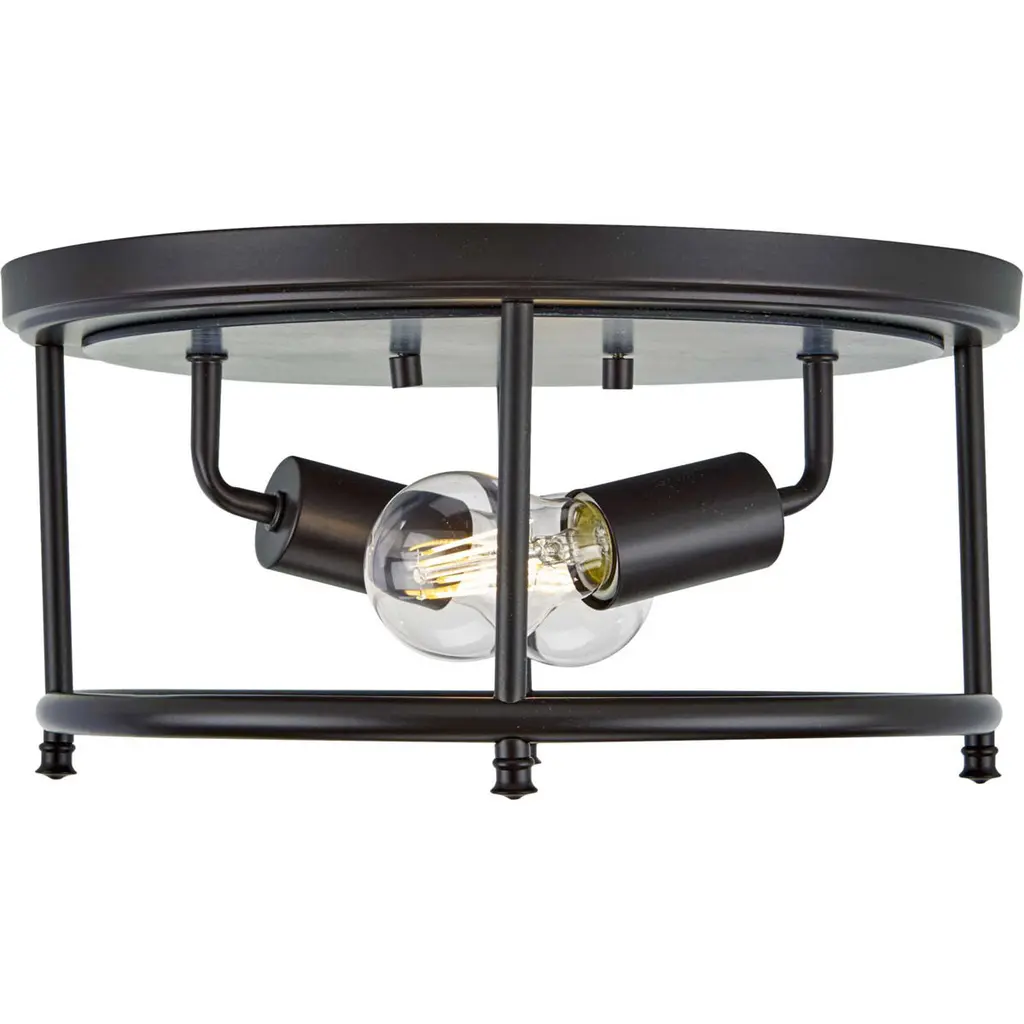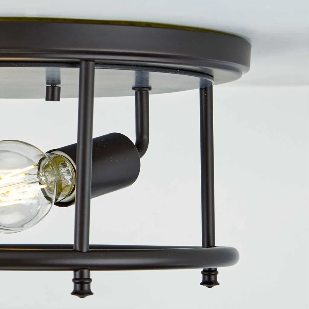 This versatile flush mount from the Durrell Collection will easily find a home in a variety of settings in need of generous illumination. A round open-cage frame coated in a farmhouse-style black finish highlights the light fixture’s rustic demeanor. Inside the frame nestle two juxtaposed metal light bases. The light fixture is topped by a round metal ceiling plate with a faux-hand painted wooden center coated in a cerused black finish.
