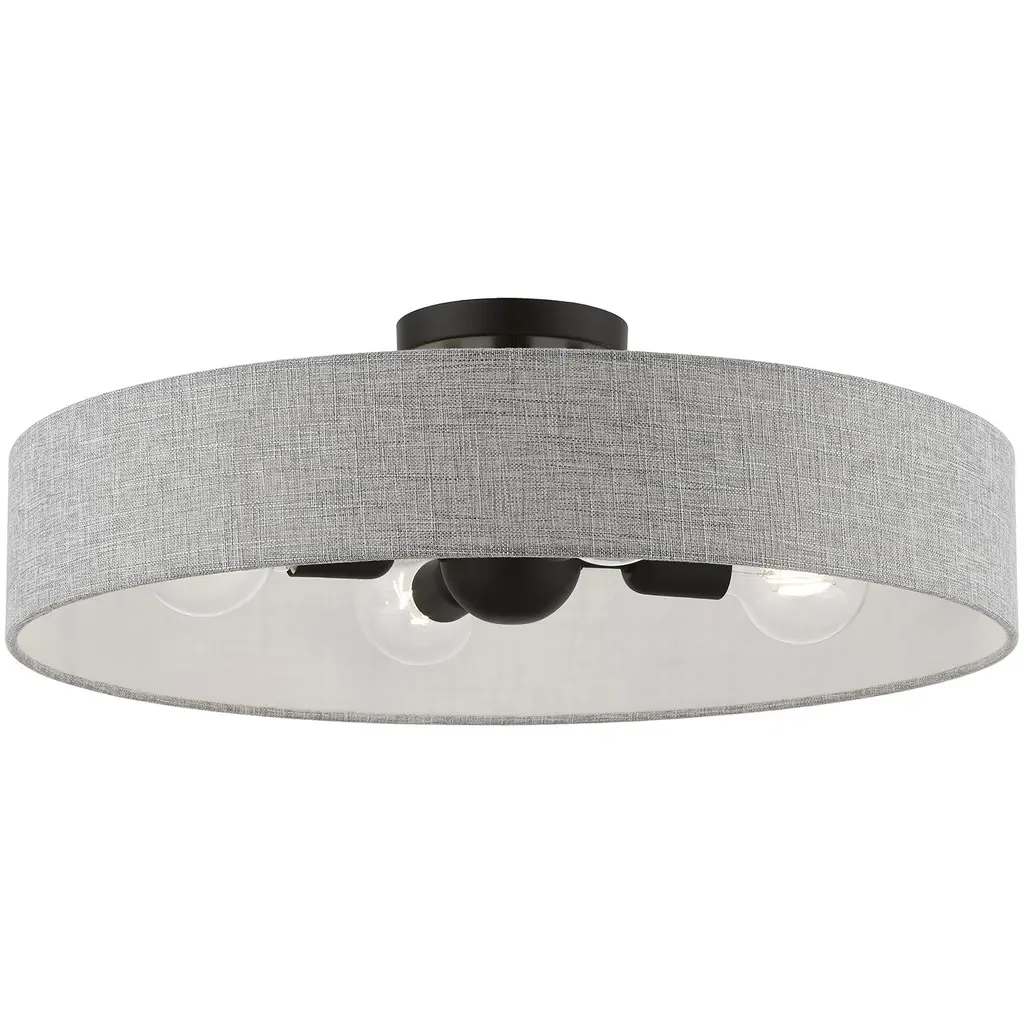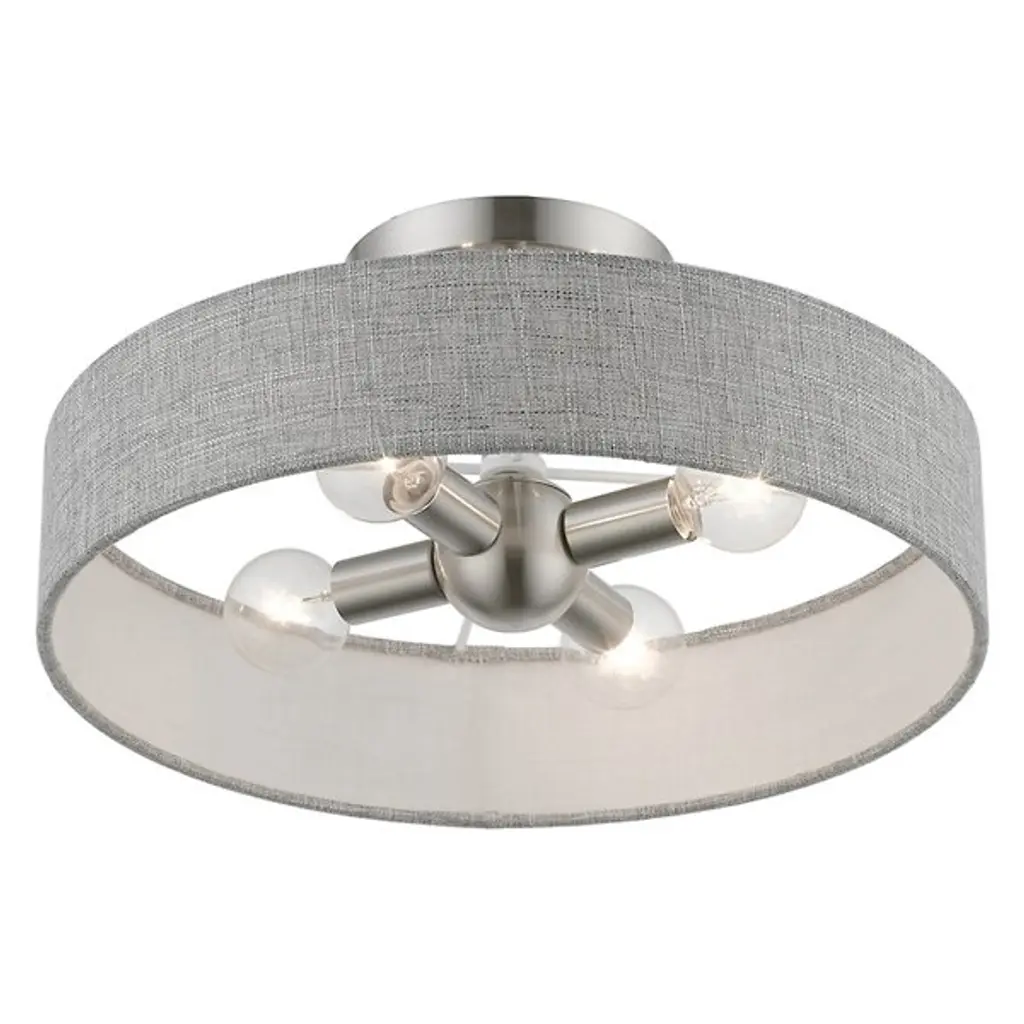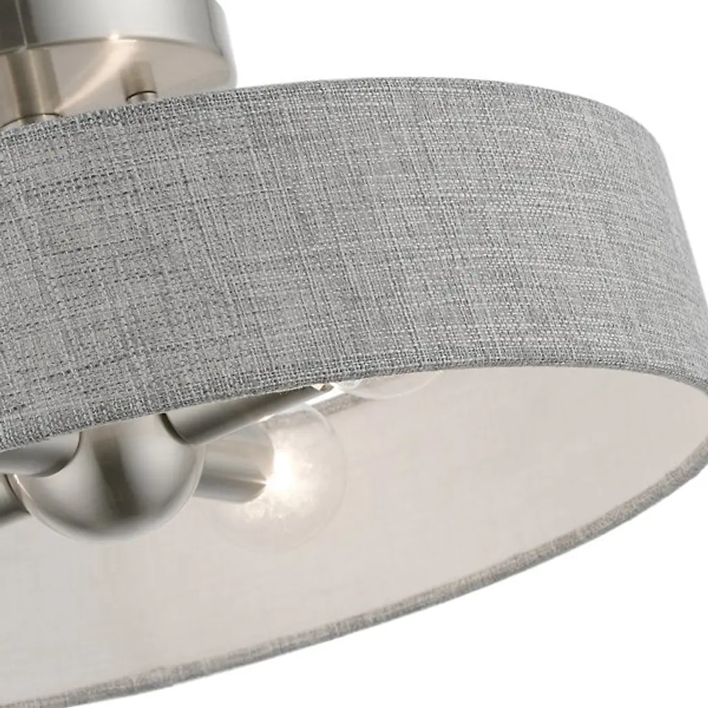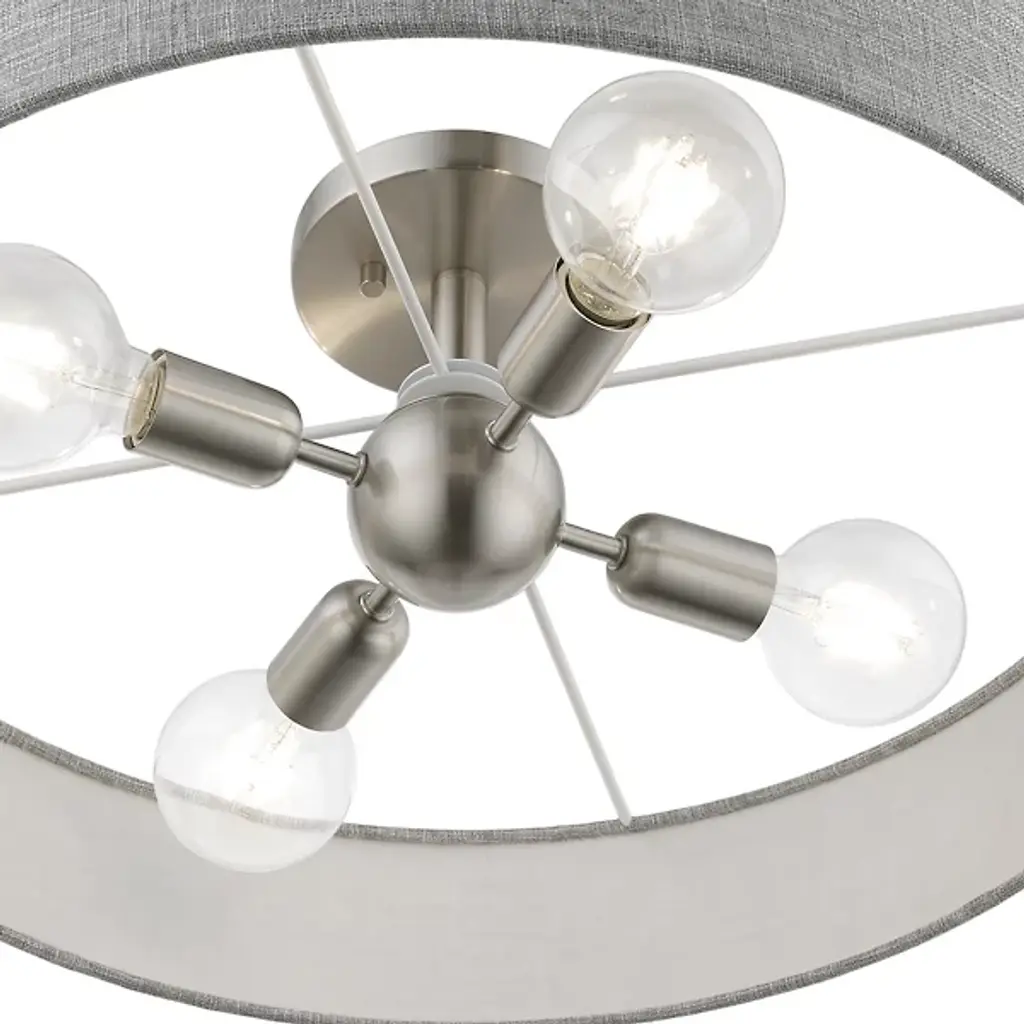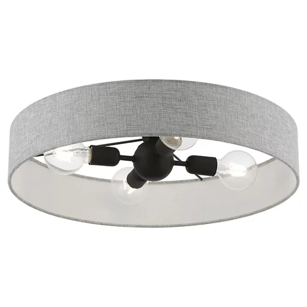 The Ellis Flushmount from Alder & Ore presents a restrained, appealing design with effortless ease. Smooth, modern, and versatile, it transmits a short downrod from a disc canopy, adding an array of single socket lamping. Each lamp emerges at even intervals from a round hub, encircled by a fabric shade of handcrafted hardback that splashes out a focused wash of uplight and downlight, accented by a band of ambient warmth.