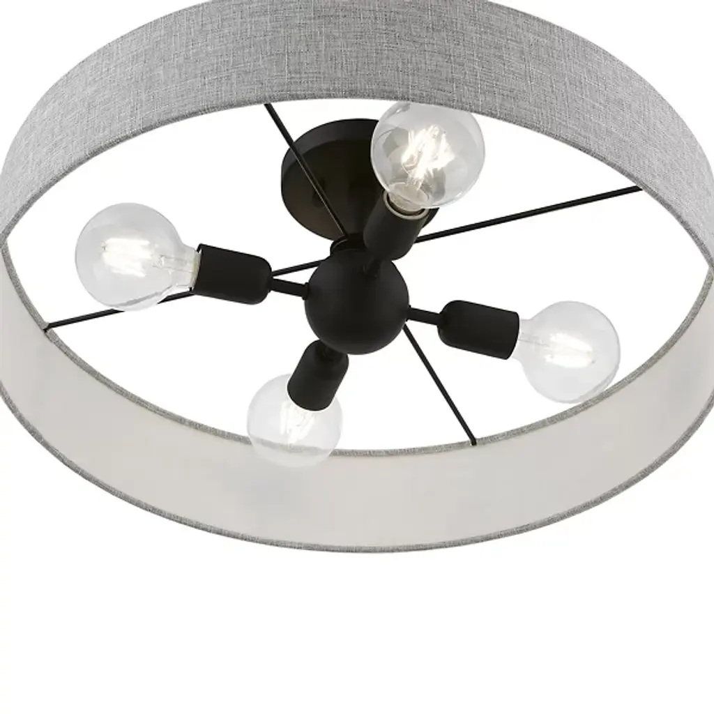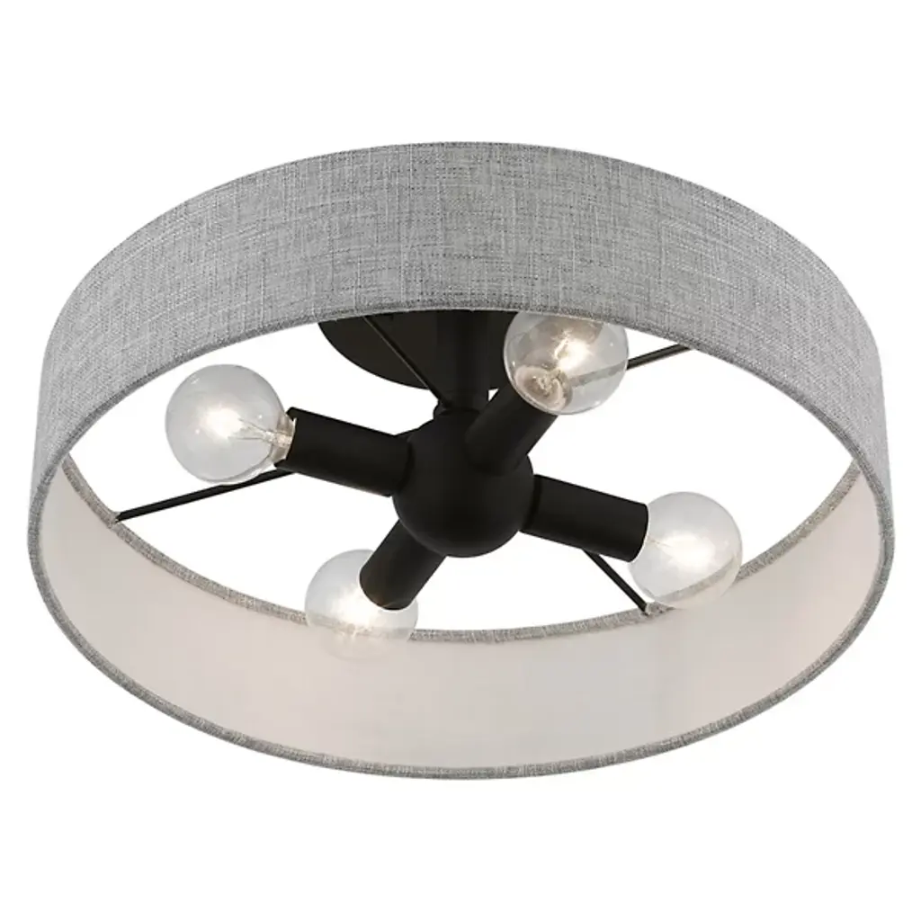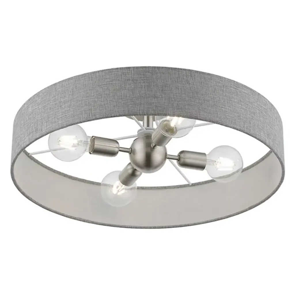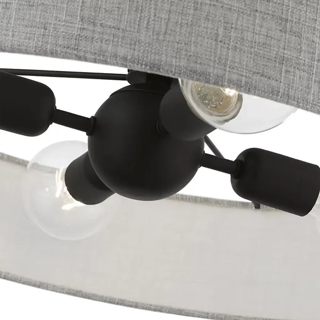 The Ellis Flushmount from Alder & Ore presents a restrained, appealing design with effortless ease. Smooth, modern, and versatile, it transmits a short downrod from a disc canopy, adding an array of single socket lamping. Each lamp emerges at even intervals from a round hub, encircled by a fabric shade of handcrafted hardback that splashes out a focused wash of uplight and downlight, accented by a band of ambient warmth.