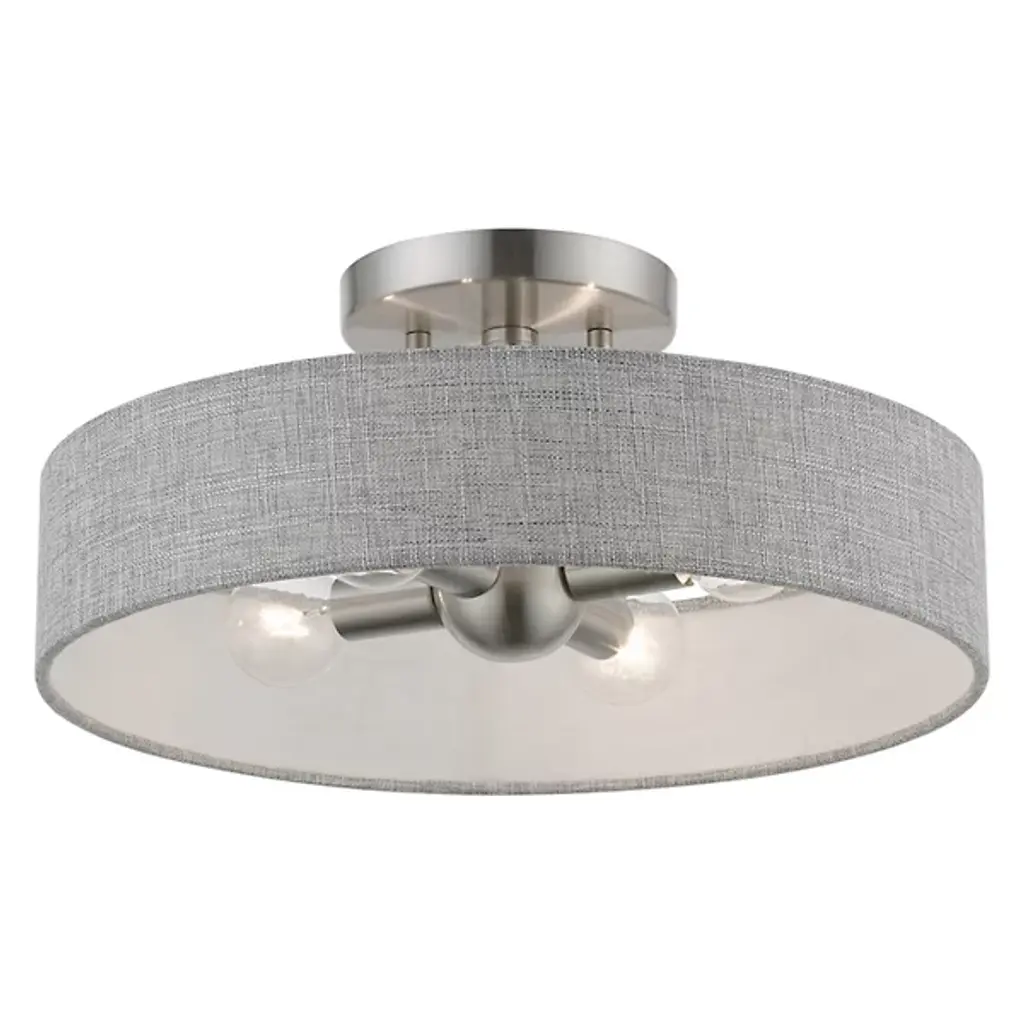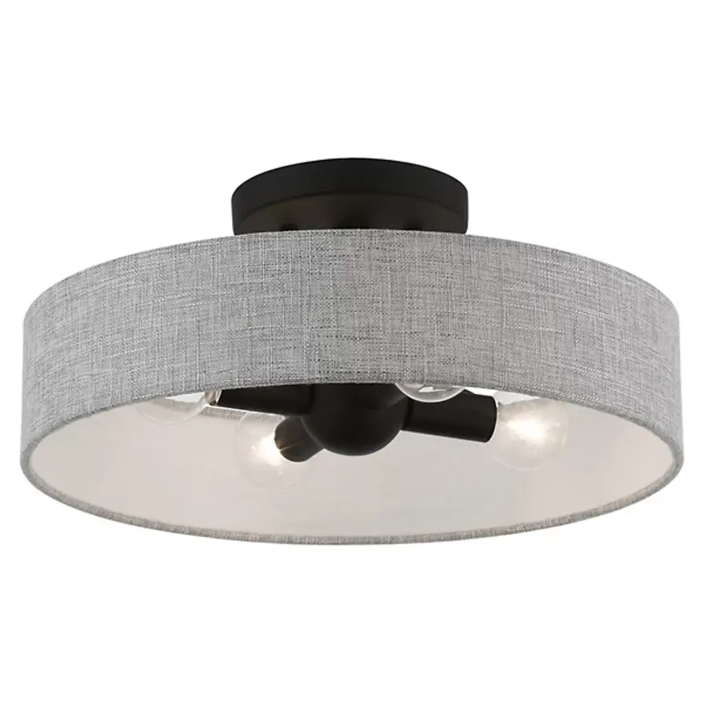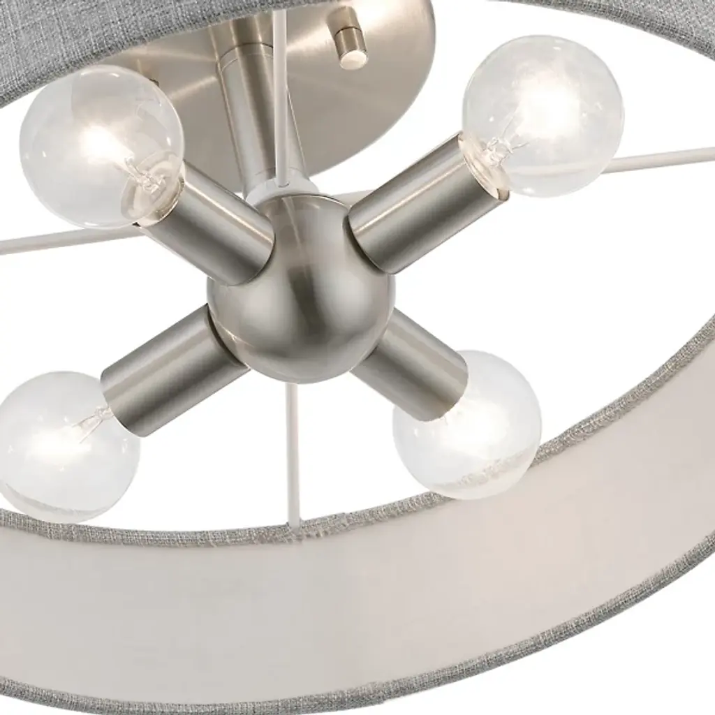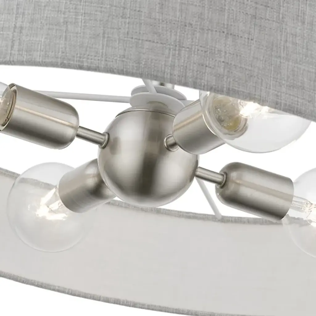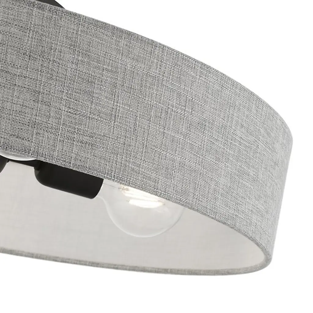 The Ellis Flushmount from Alder & Ore presents a restrained, appealing design with effortless ease. Smooth, modern, and versatile, it transmits a short downrod from a disc canopy, adding an array of single socket lamping. Each lamp emerges at even intervals from a round hub, encircled by a fabric shade of handcrafted hardback that splashes out a focused wash of uplight and downlight, accented by a band of ambient warmth.