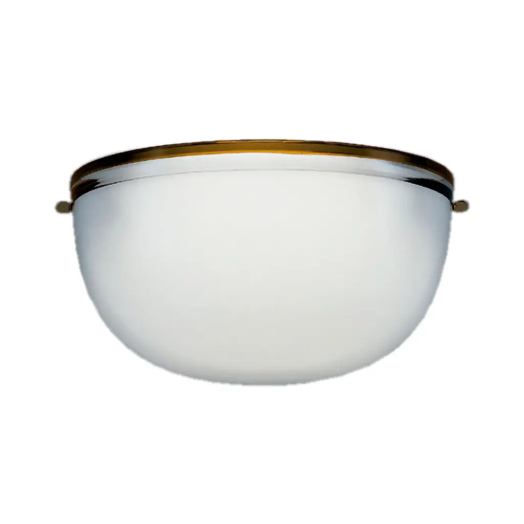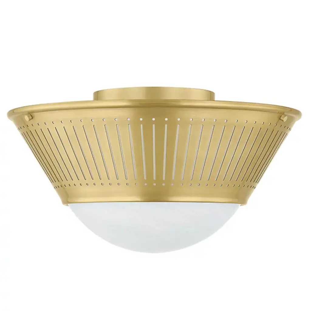 Inspired by the architecture of the Art Deco period, Elsmere makes the case for replacing can lights with a more elevated ceiling fixture. This beautiful flush mount is finished in Aged Brass with decorative perforations that allow light to escape. Even with the metalwork's edge, the rounded cloud glass shade forms a sun-like visual, with the perforations mimicking rays of light.
