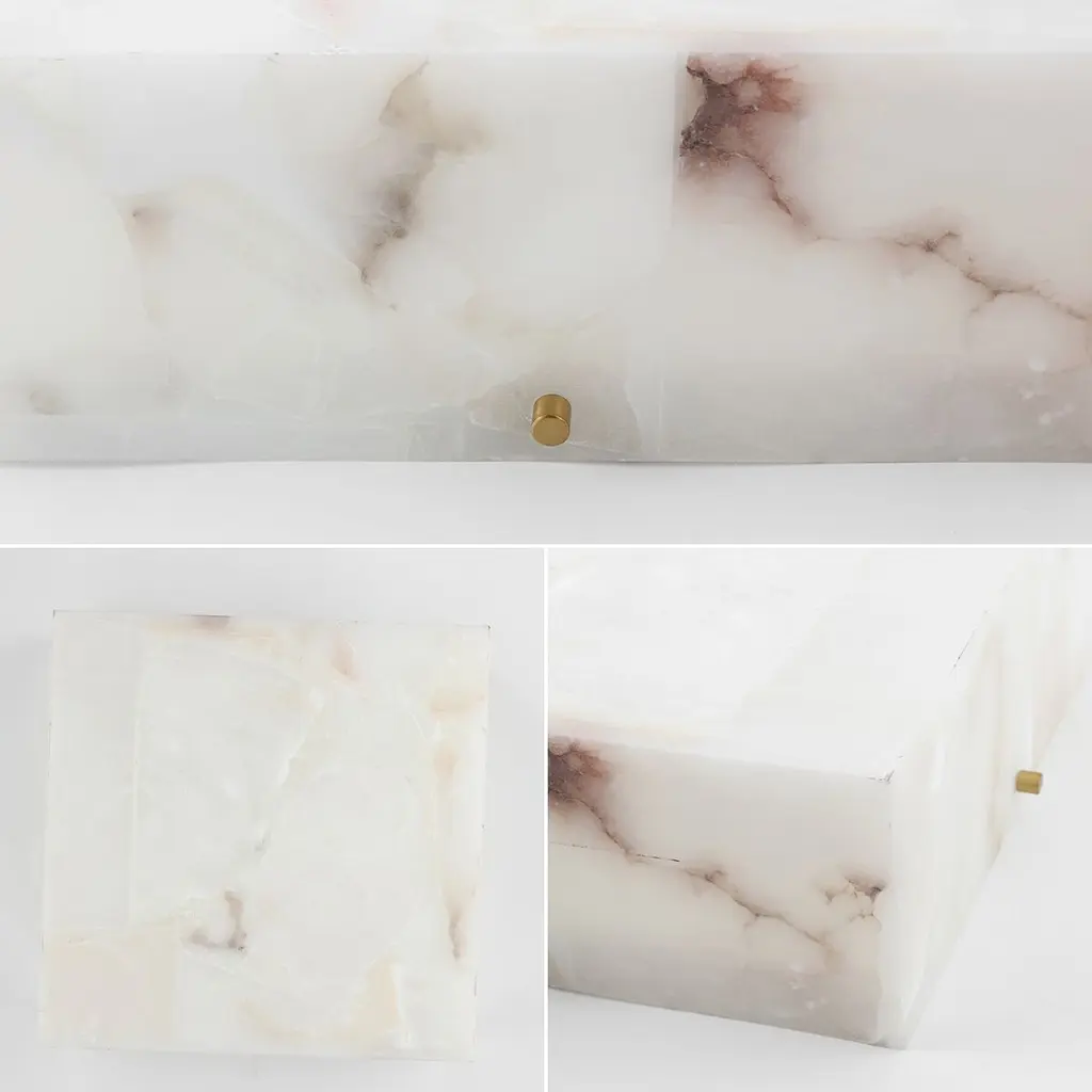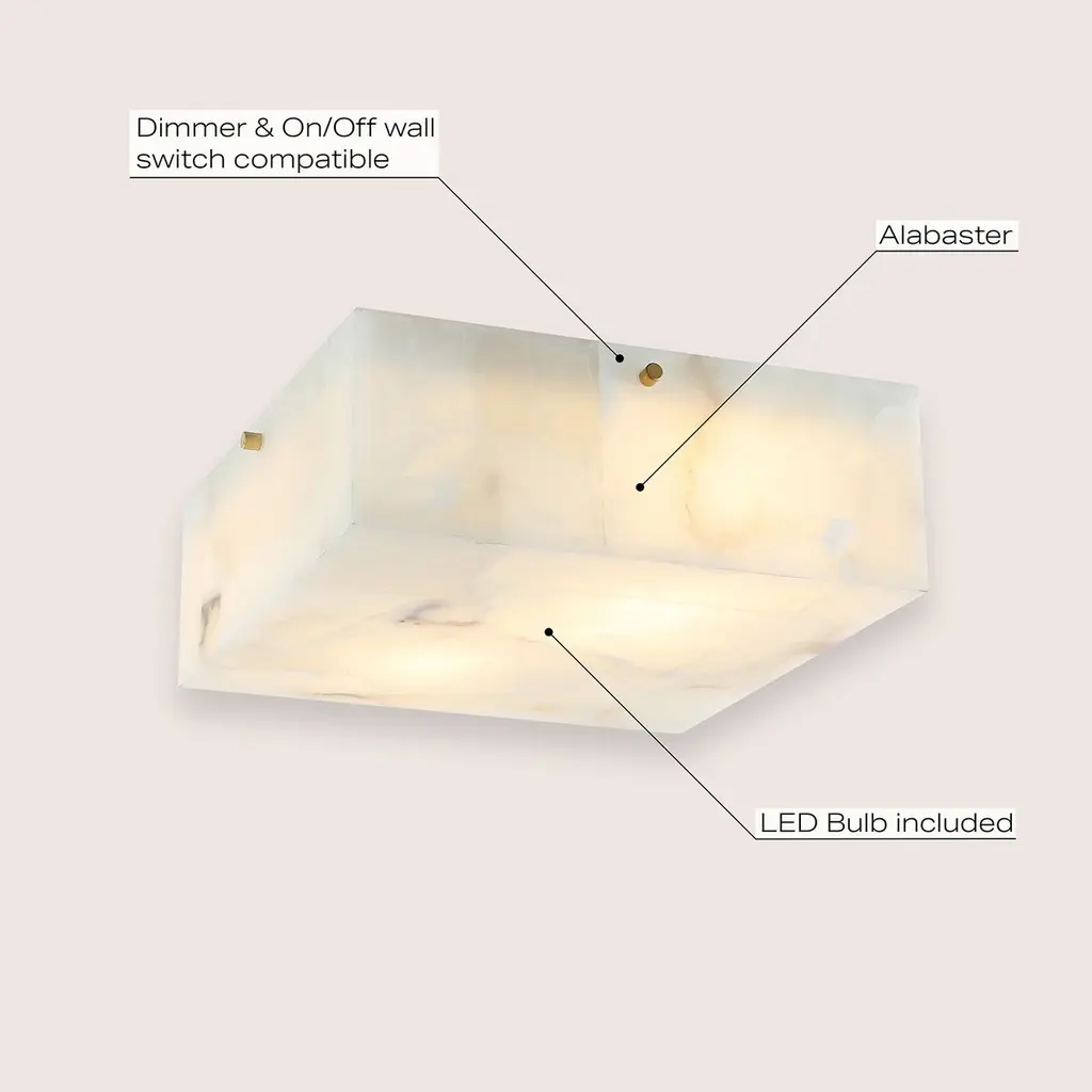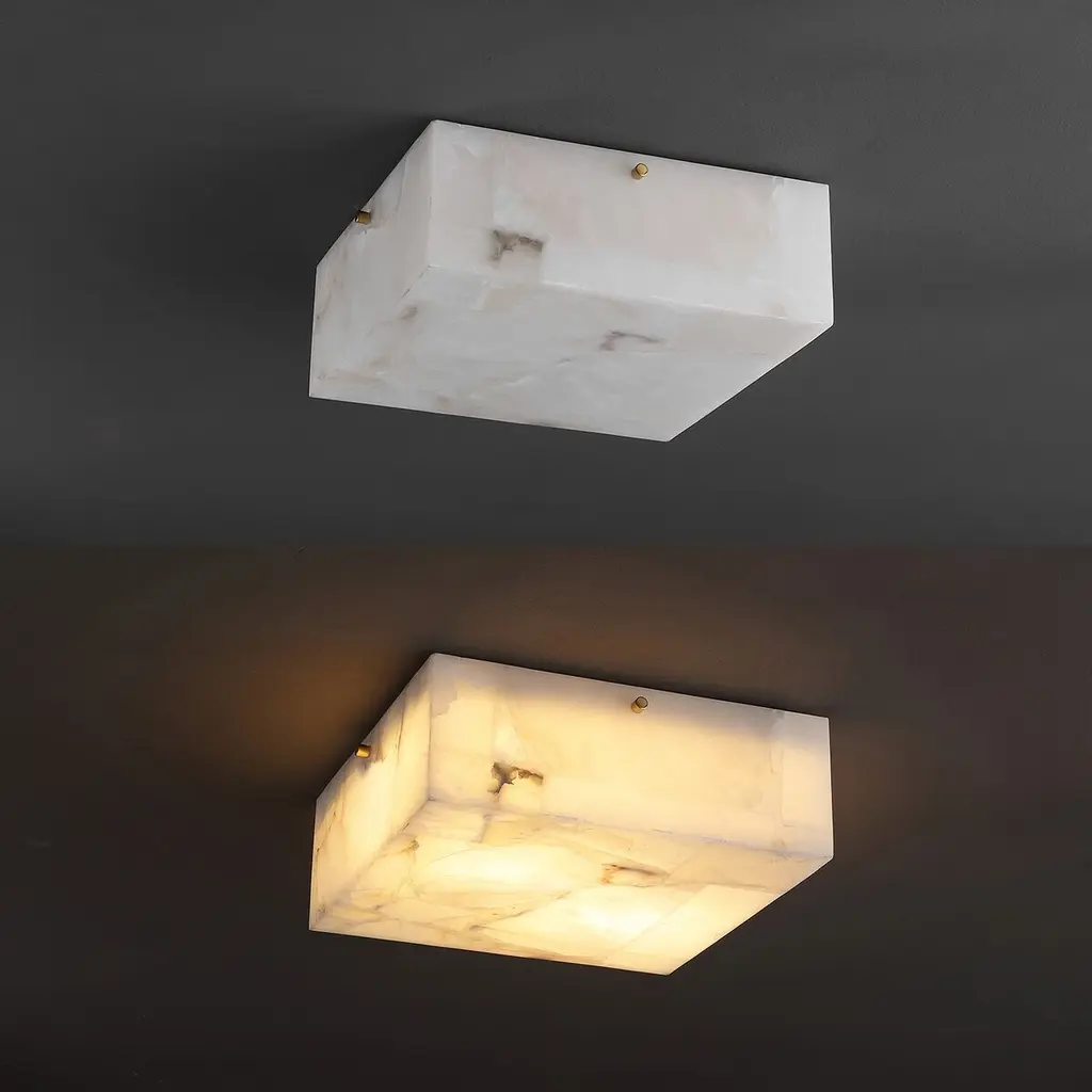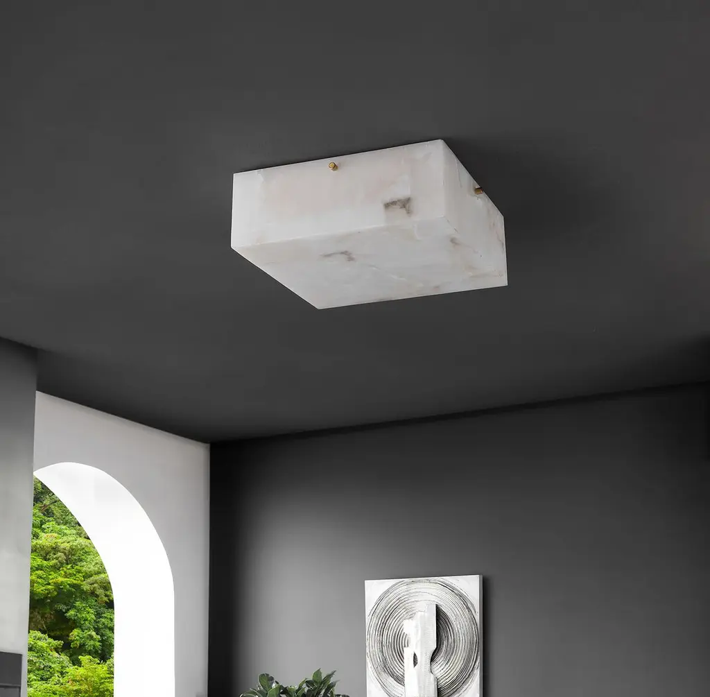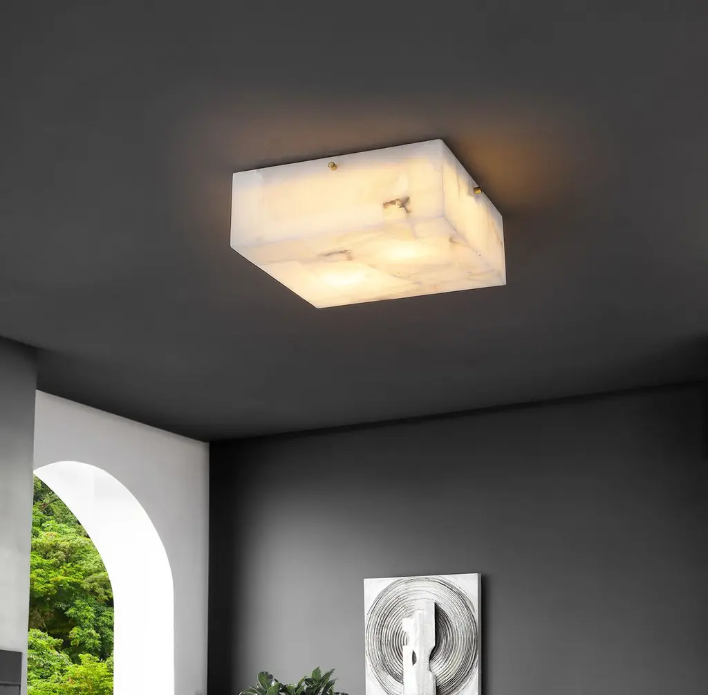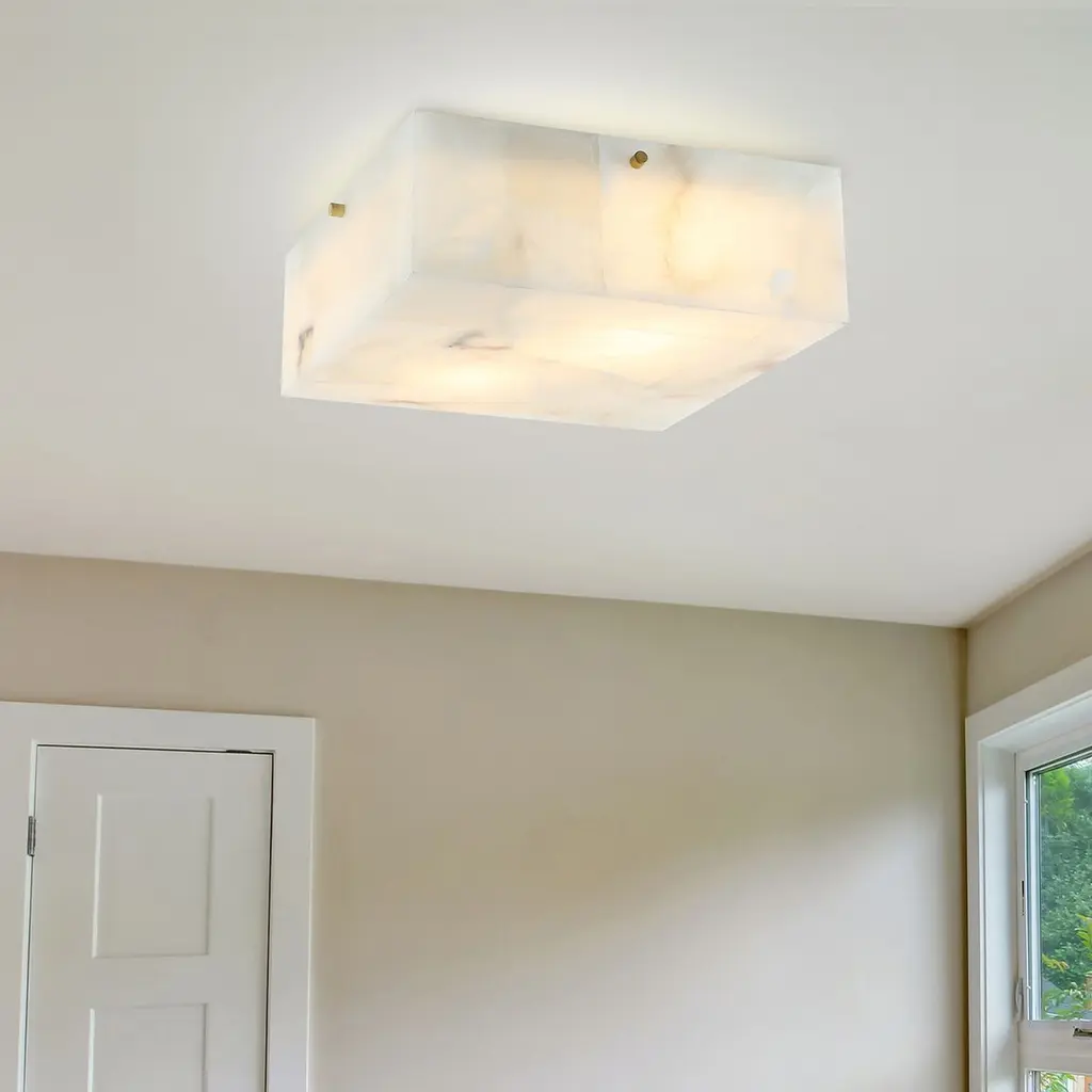 Give your low ceilings a warm glow with our modern, flush-mount light fixture. Carefully crafted alabaster panels are fixed in place with metal accents. This light fixture adds low-key elegance to your hallway, bedroom, bathroom, or even a closet.