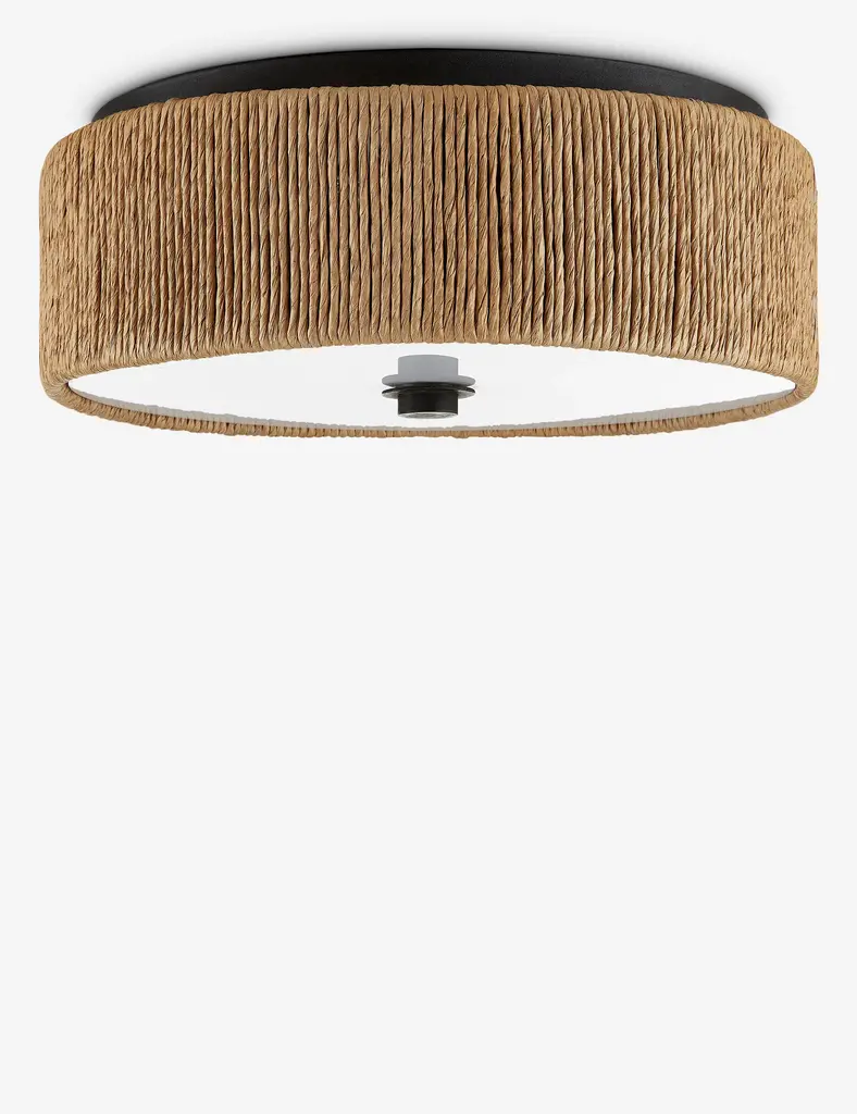 A ring of woven rope creates rich texture and depth in this flush mount ceiling light. Great in a thoughtfully grounded living area or bedroom, it offers ambient light diffused with a white glass orb shade and includes a smooth bronze finish canopy for a touch of contrasting color and texture.