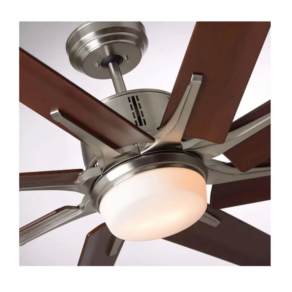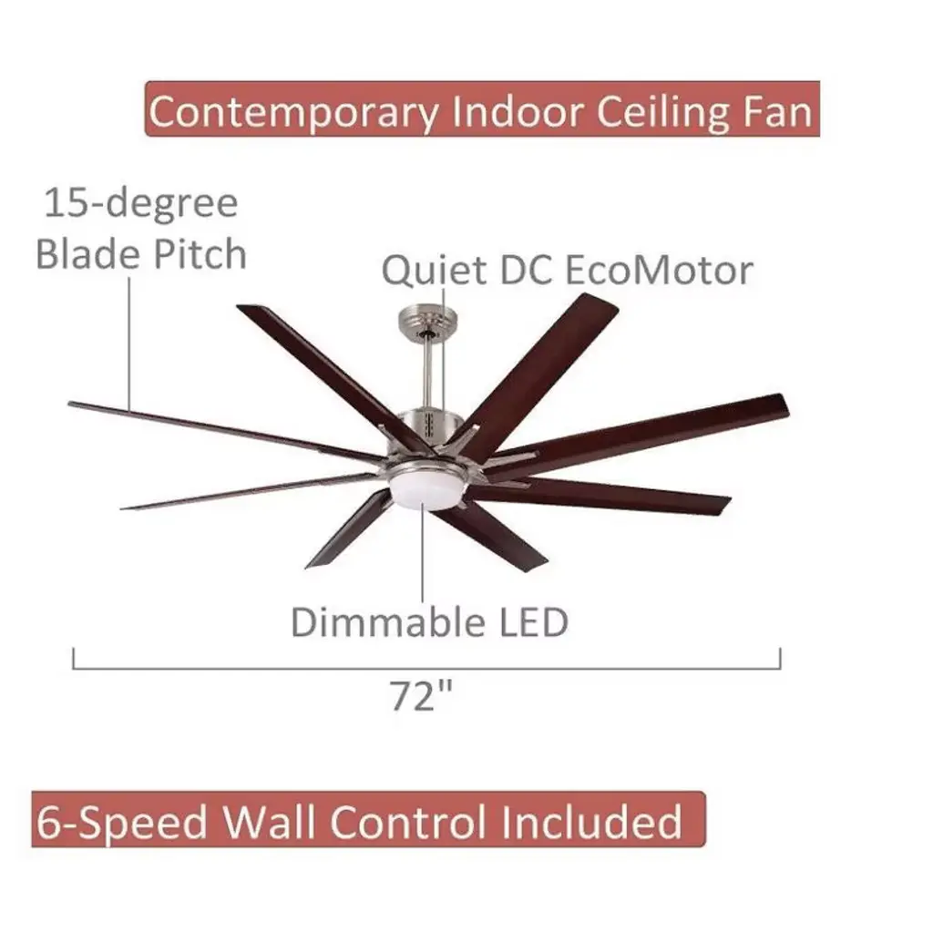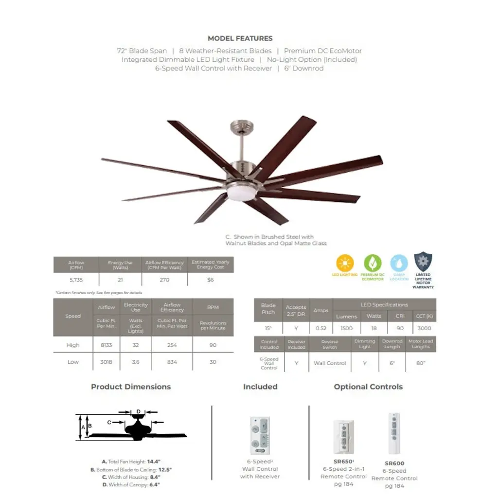 Emerson Aira Eco 72-inch Modern Ceiling Fan, 8-Blade Ceiling Fan with LED Lighting and 6-Speed Wall Control This 72-inch Aira Eco ceiling fan delivers powerful airflow with a modern aesthetic. Featuring a brushed steel finish, eight walnut ABS blades, and an integrated LED light, it's ideal for spacious indoor areas like living rooms or great rooms. Key Features: • 72-inch blade span with 15° blade pitch • 8 All-Weather ABS Plastic Walnut blades • Integrated dimmable LED light with opal matte glass • Includes 6-speed wall control with reverse function • Quiet and energy-efficient EcoMotor • Includes 6" downrod for ceiling mount • UL Listed for indoor use Specifications: • Motor: Super Efficient DC EcoMotor • Blade Span: 72 Inches • RPM Range: 30 to 100 RPM • Speeds: 6 • Light Output: 1 x 18W LED, 1500 Lumens, 3000K, 90+ CRI • Voltage: 110V • Mounting: Downrod (Flushmount not supported) • Leadwire Length: 80" • Finish: Brushed Steel • Indoor Use Only