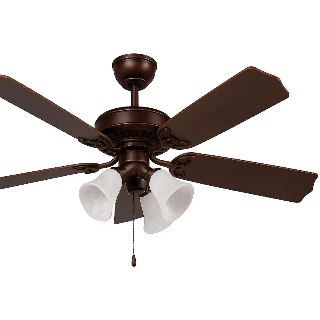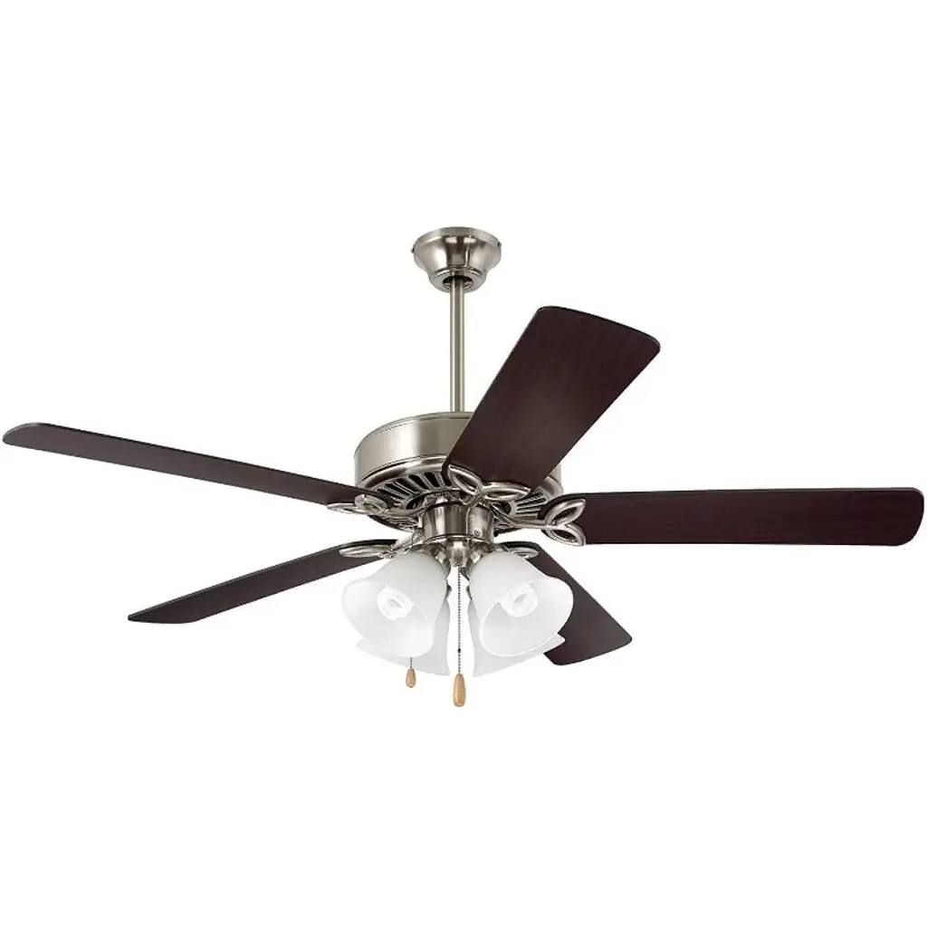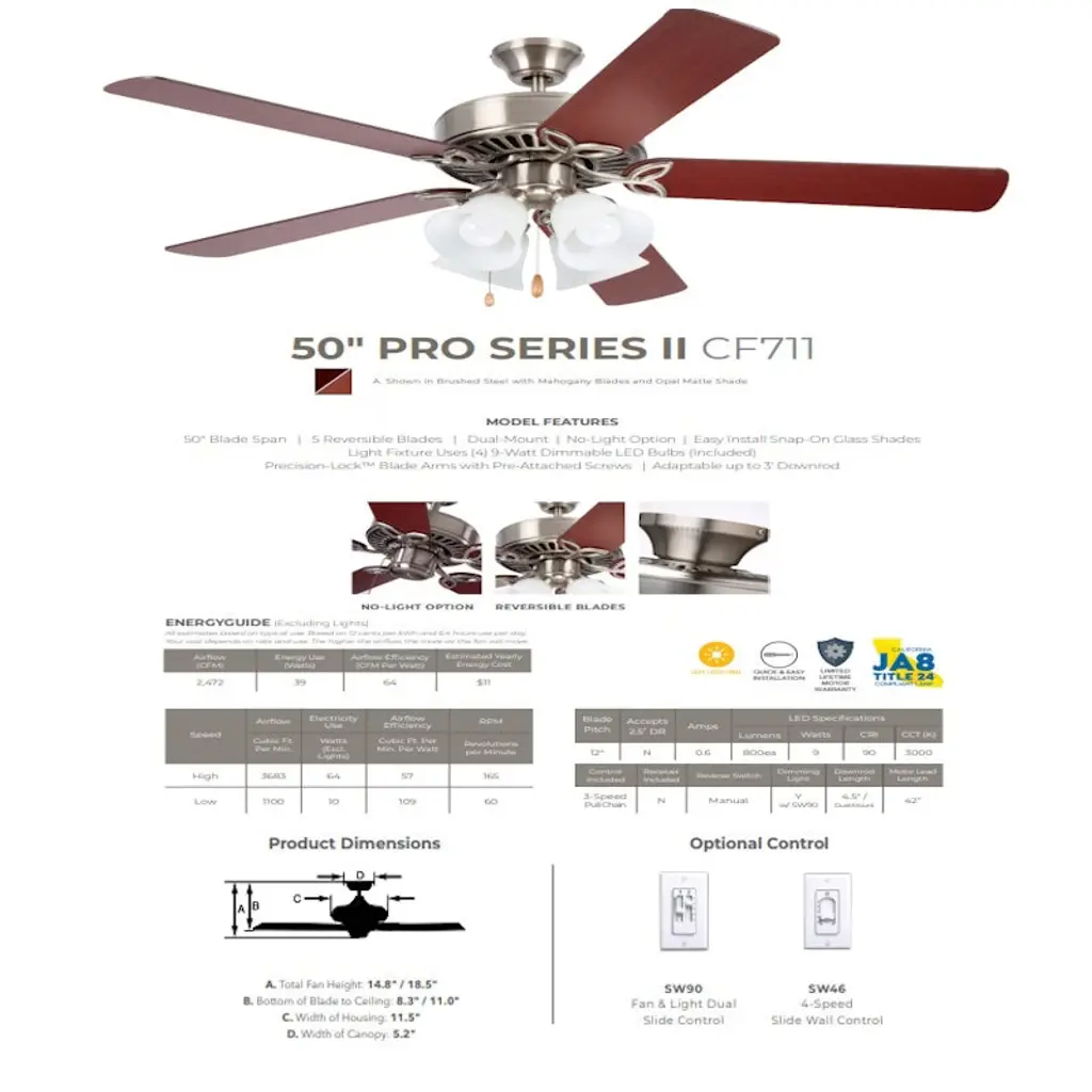 Emerson Kathy Ireland Home Pro Series II 50" Indoor Ceiling Fan with LED Light Kit, Brushed Steel The Emerson Pro Series II ceiling fan combines traditional style with efficient performance. This 50-inch fan features a brushed steel finish and five reversible Dark Cherry/Mahogany blades for versatile decor pairing. It includes a four-light LED fixture with snap-on opal matte glass for simple installation and offers both style and airflow for bedrooms, offices, and medium-sized living spaces. Key Features: • 50" blade span with 5 reversible Dark Cherry/Mahogany MDF blades • Dual-mount installation with 4.5" downrod included • Integrated 4-light LED fixture with snap-on opal matte glass shades • Four 9-watt A19 LED bulbs included (800 lumens, 3000K color temp) • Pull chain operation with 3-speed reversible motor • Compatible with sloped ceilings (adapter sold separately) • Traditional style ideal for indoor settings Specifications: • Model: CF711BS • Motor: 153mm x 15mm Direct Drive AC Motor • Blade Pitch: 12° • RPM Range: 75 to 175 • Speeds: 3-speed motor with manual reverse switch • Control: Pull chain (wall/remote controls sold separately – compatible with EMSW46) • Hanging Weight: 19.8 lbs • Voltage: 120V • Lighting: 4-light downlight fixture with standard 2-1/4" glass shades • Total Light Wattage: 52W (non-dimming CFLs or 4x13W medium base) • Indoor Rated: UL Listed for indoor use only • Cannot be flush mounted • Includes bottom cap for installation with or without light fixture