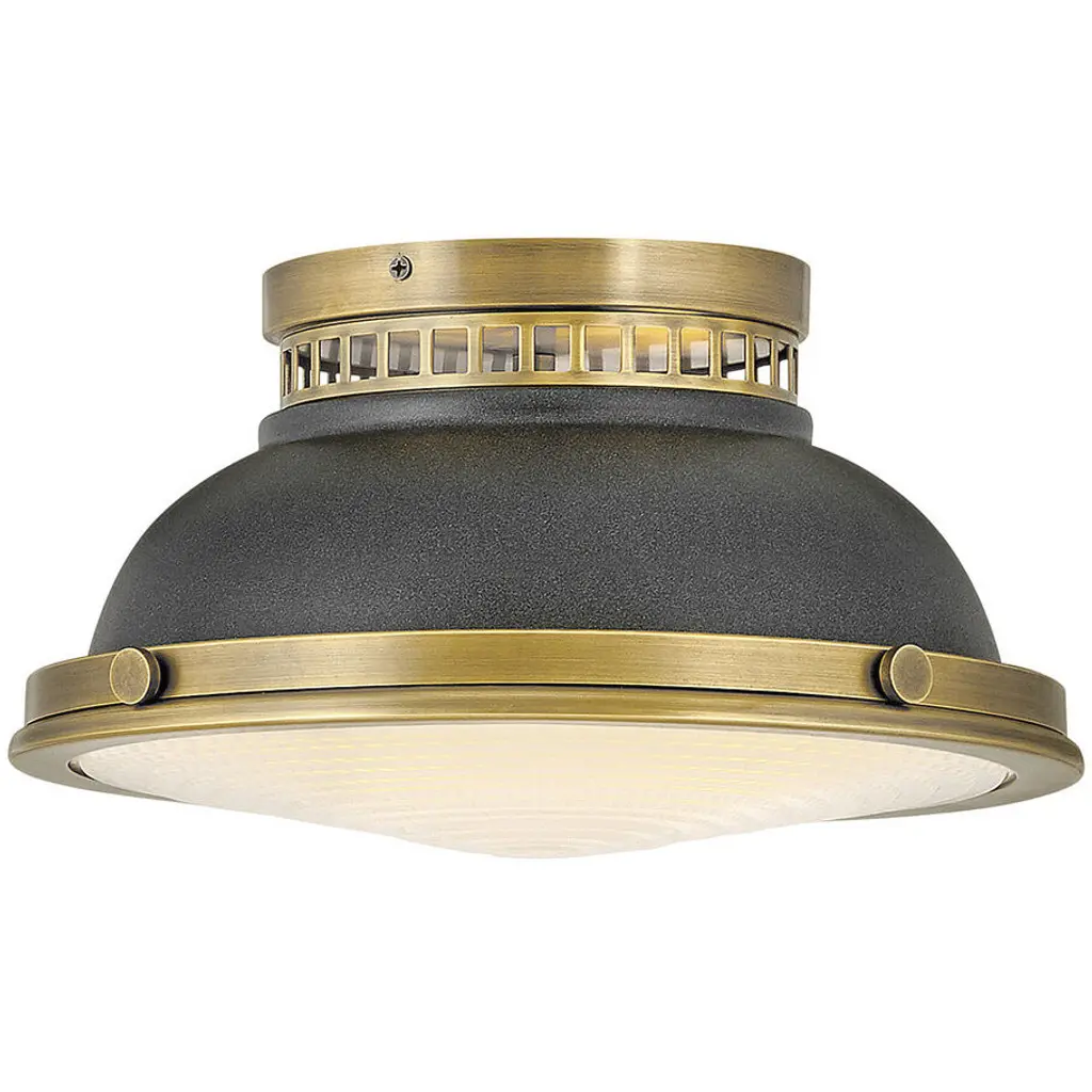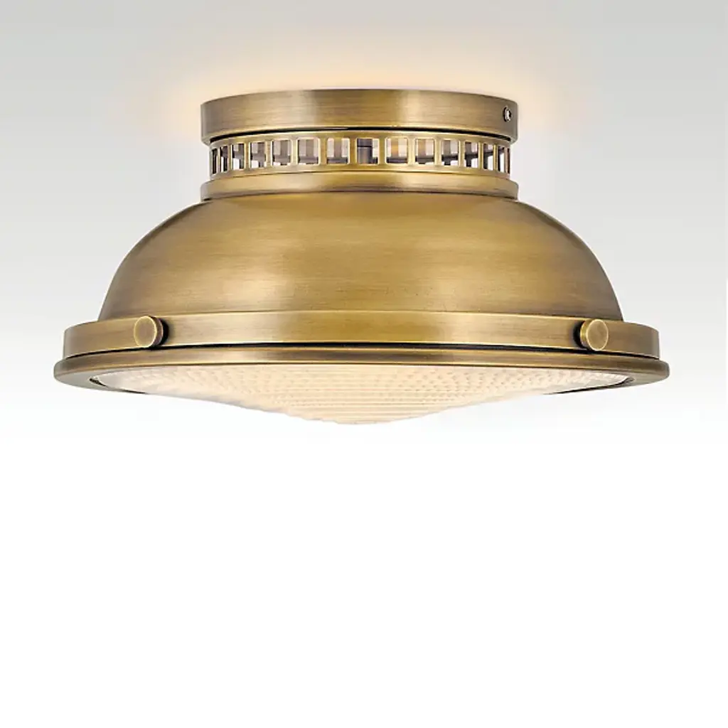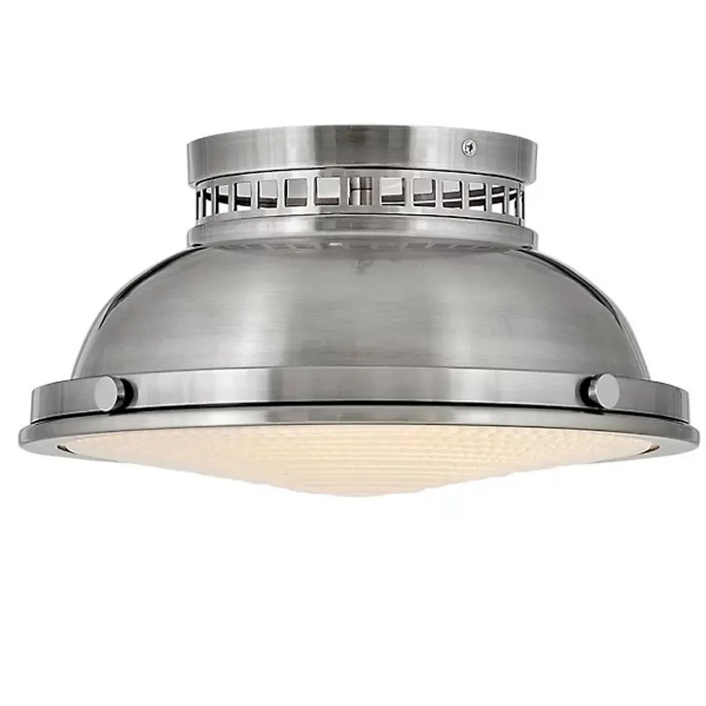 The Emery Flushmount by Hinkley Lighting is a modern take on a vintage look. With noted industrial stylings like a turn-of-the-century factory, this fixture features a compact design that deftly illuminates your space without drawing too much attention to itself. The top of the piece includes metal cutouts that allow the light to graze the ceiling. The main downlight is enclosed behind holophane glass which removes dark spots and glare