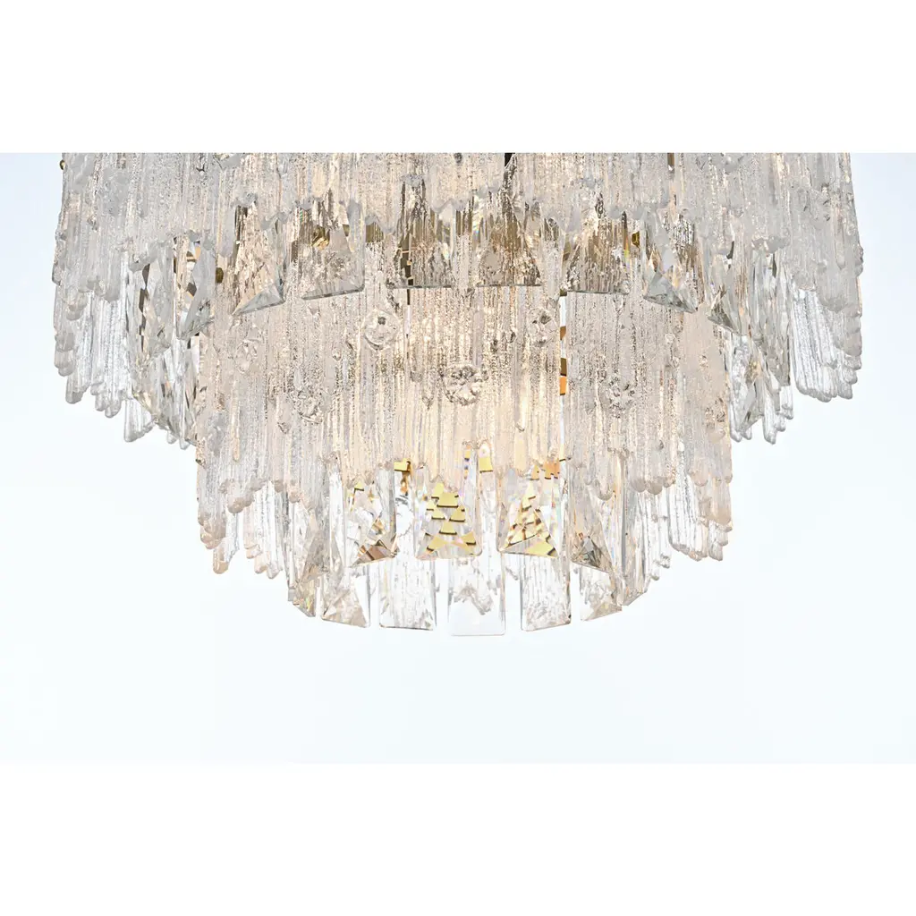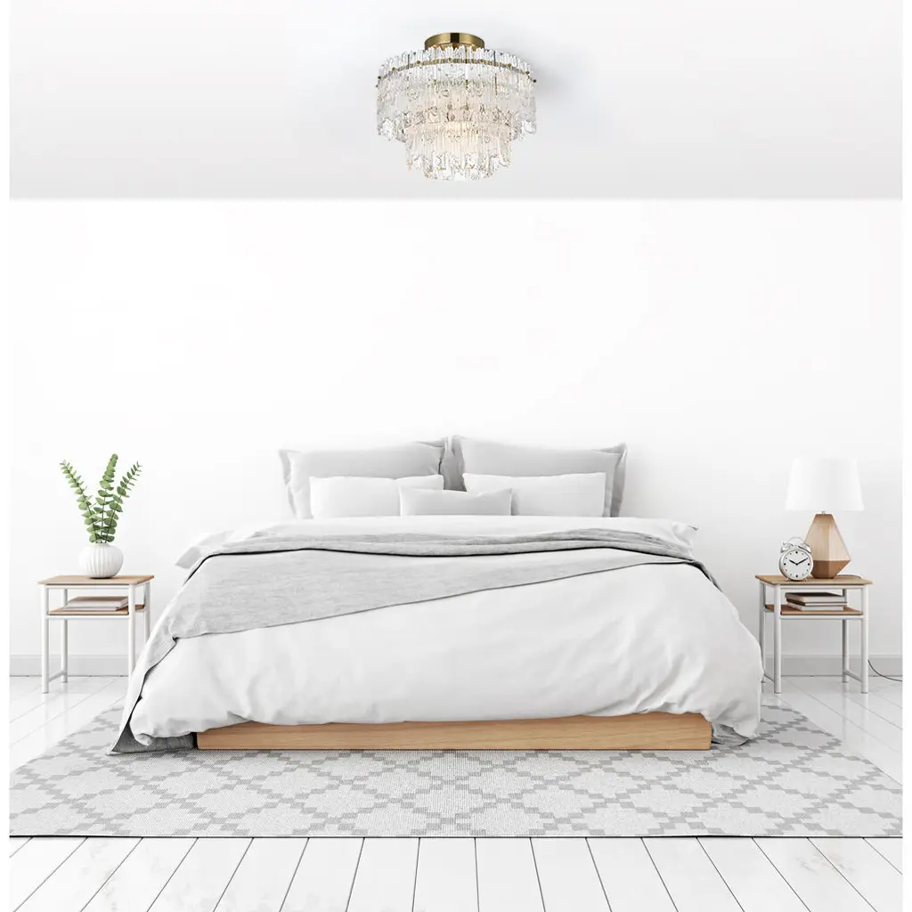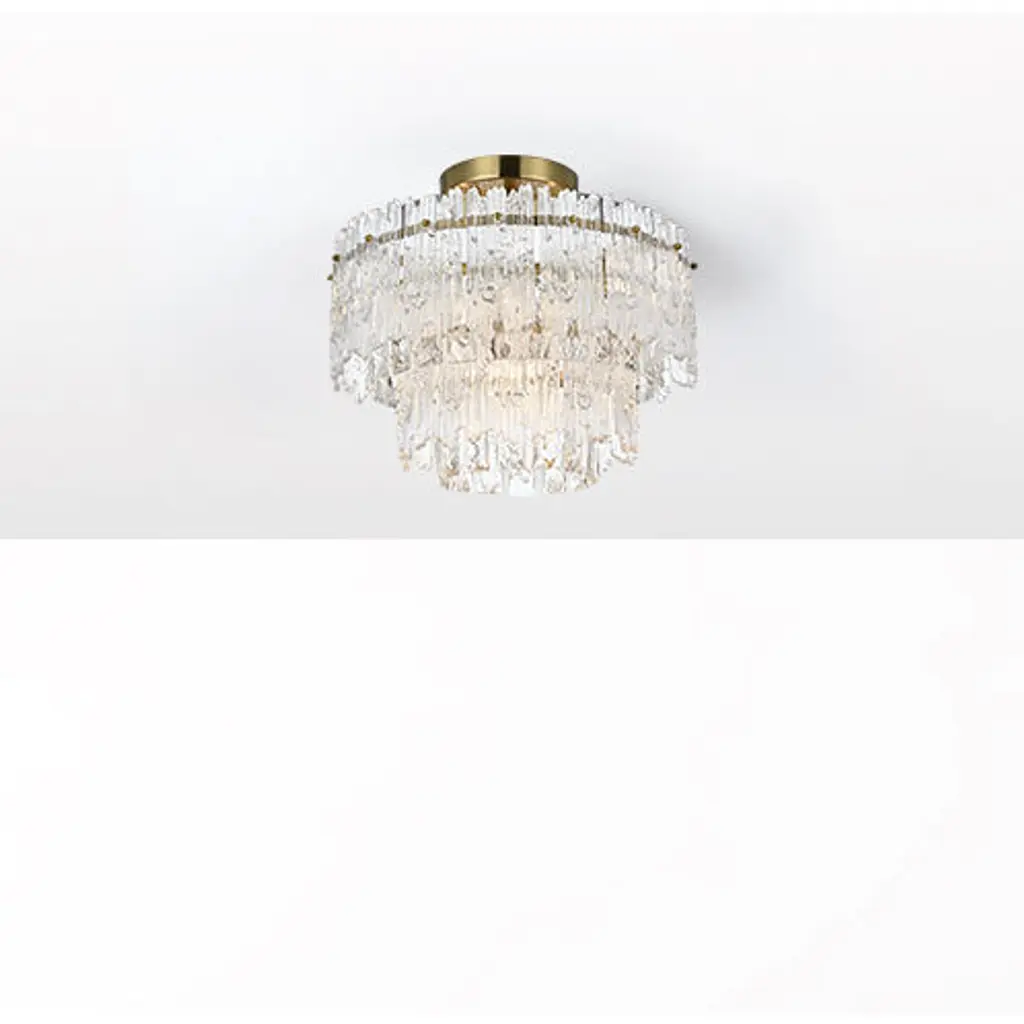 Elevate your space with our 15-inch crystal flush mount, a dazzling blend of strength and sophistication. Crafted with four tiers and adorned with a captivating snow flower glass overlay, this lighting masterpiece delivers both refined aesthetics and practical illumination. The durable iron construction ensures enduring elegance, complemented by intricate floral detailing for a touch of natural beauty. With a UL rating, our fixture not only guarantees an elegant ambiance but also upholds stringent safety standards for your peace of mind. Illuminate your surroundings with enduring style and opulent brilliance, making every moment a showcase of sophistication.