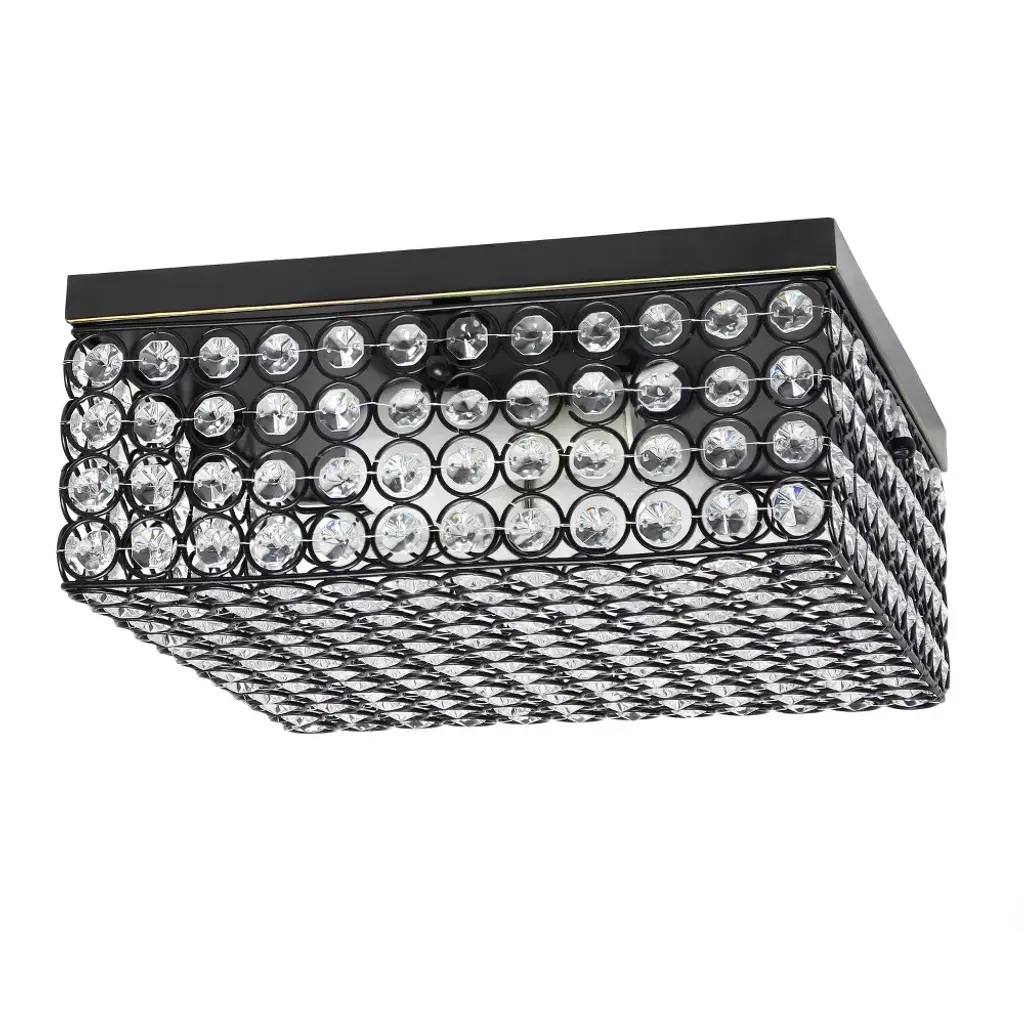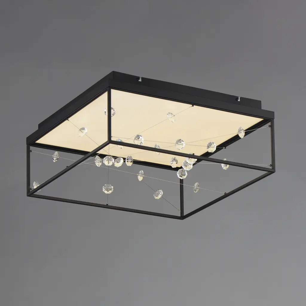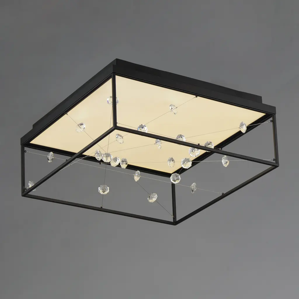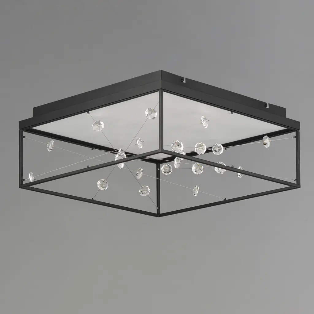 A network of wire and crystal are suspended within a box frame illuminated from above. The light panel above highlights the iridescence of the crystal while providing ample illumination to the space below.