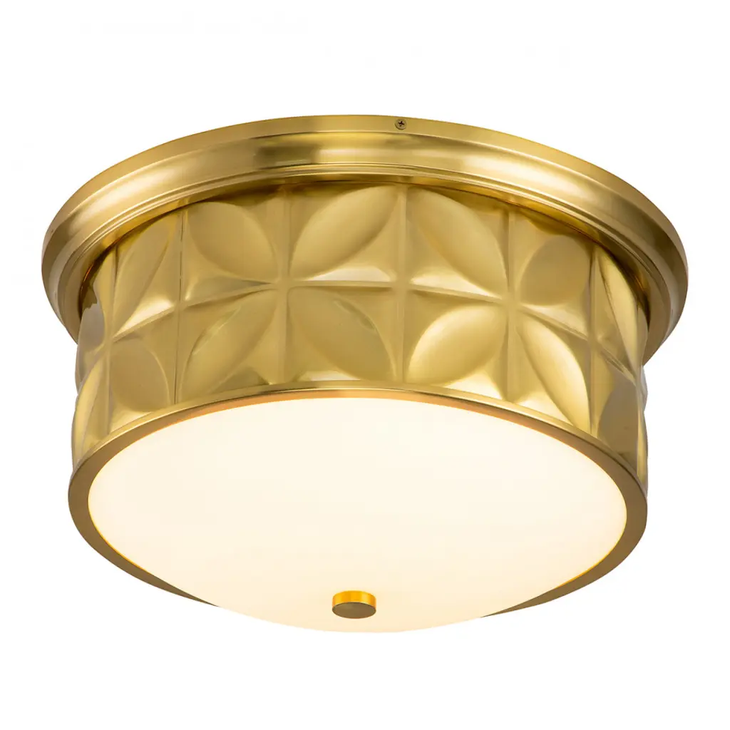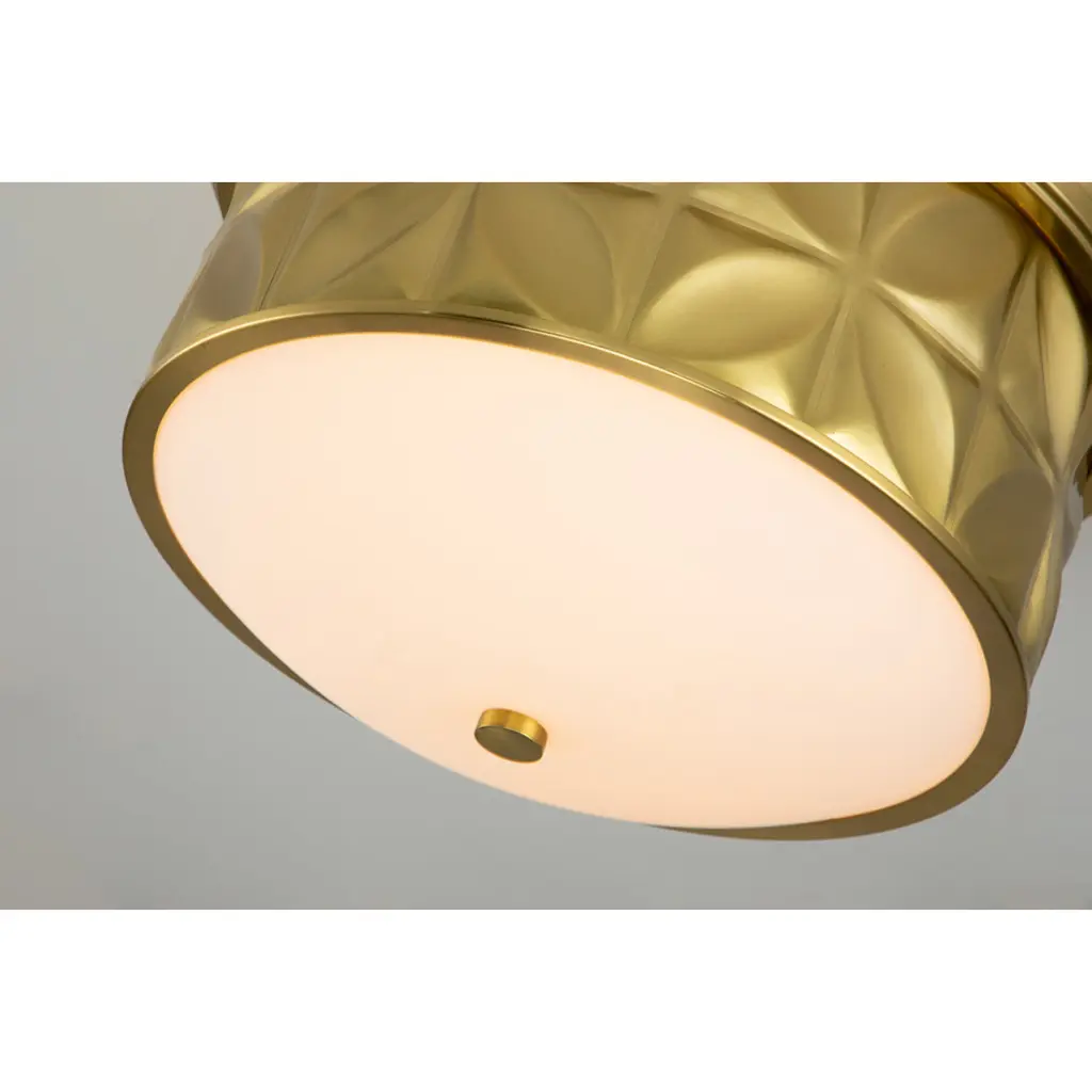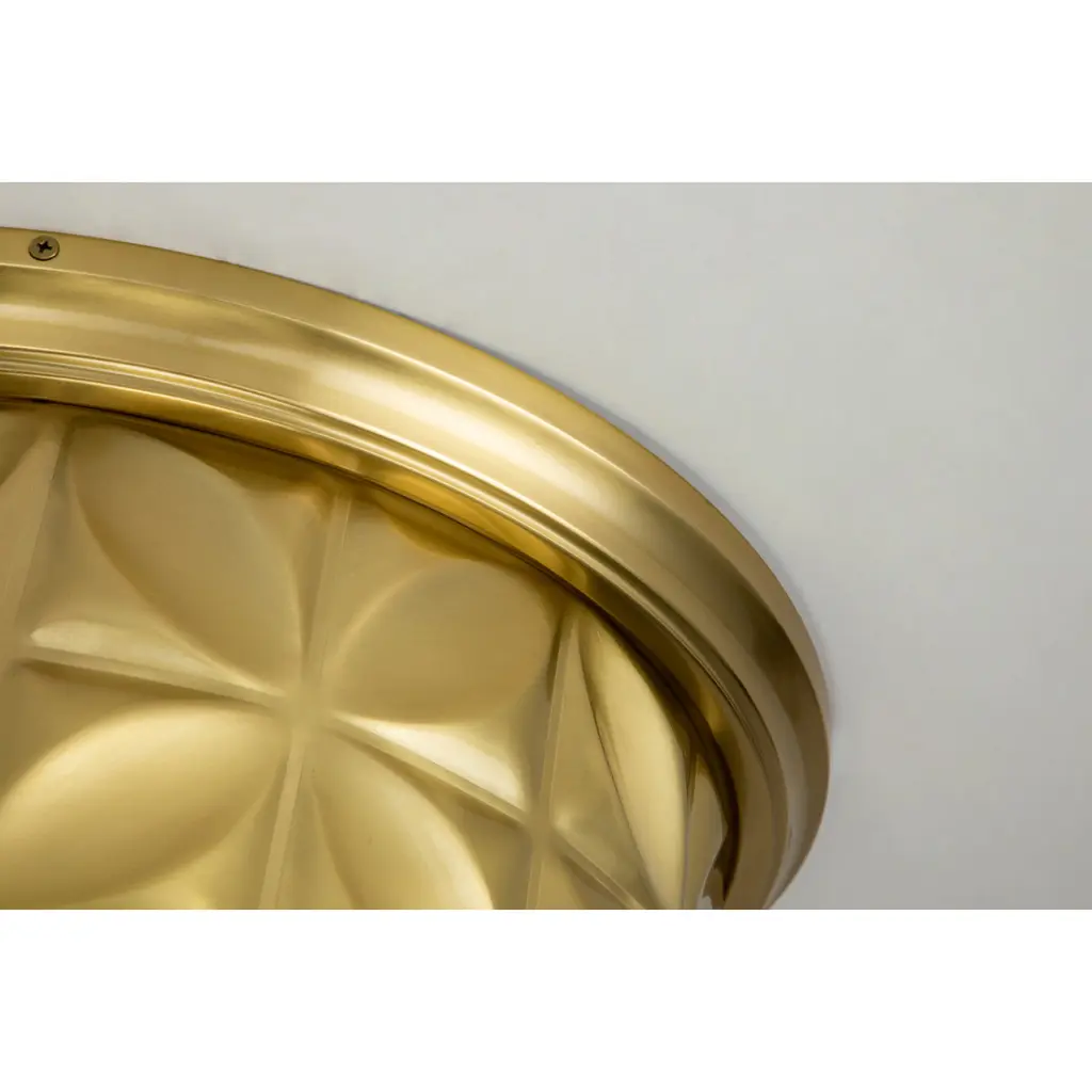 Always looking to add texture and dimension to a room, we created the perfect 17.5 inch round flush mount ceiling light. The sophisticated design of this lighting fixture uses shape and its aged brass finish to add traditional design and eye-catching appeal. Approved for damp location, this flush mount will work in a bathroom design as well as a kitchen or living room space. The creamy white glass allows just the right amount of light to create a beautiful, flattering ambiance giving off just the right amount of light.