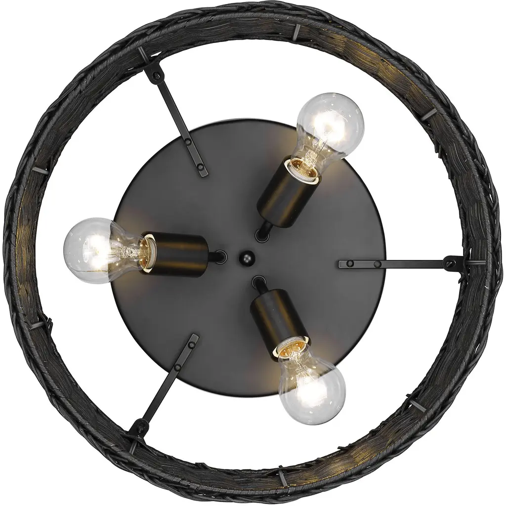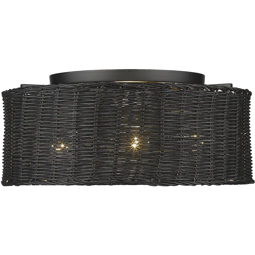 Embrace modern elegance with the Golden Lighting Erma 3-light Flush Mount. Featuring a wicker shade and a matte black frame, it creates a welcoming atmosphere. The black wicker shade offers a sophisticated texture, meticulously handcrafted to create a bold and inviting glow, while the matte black finish adds a timeless touch with its smooth, non-reflective surface. Ideal for low ceilings in hallways, closets, bathrooms, and other compact spaces, this fixture is damp location rated, suitable for areas with occasional moisture. Requires 3 E26 Medium base bulbs (not included), max 60 watts per bulb. Overall dimensions are 16.38"W x 7.5"H x 16.38"D. Elevate your decor with this stylish light fixture that perfectly balances elegance and practicality.