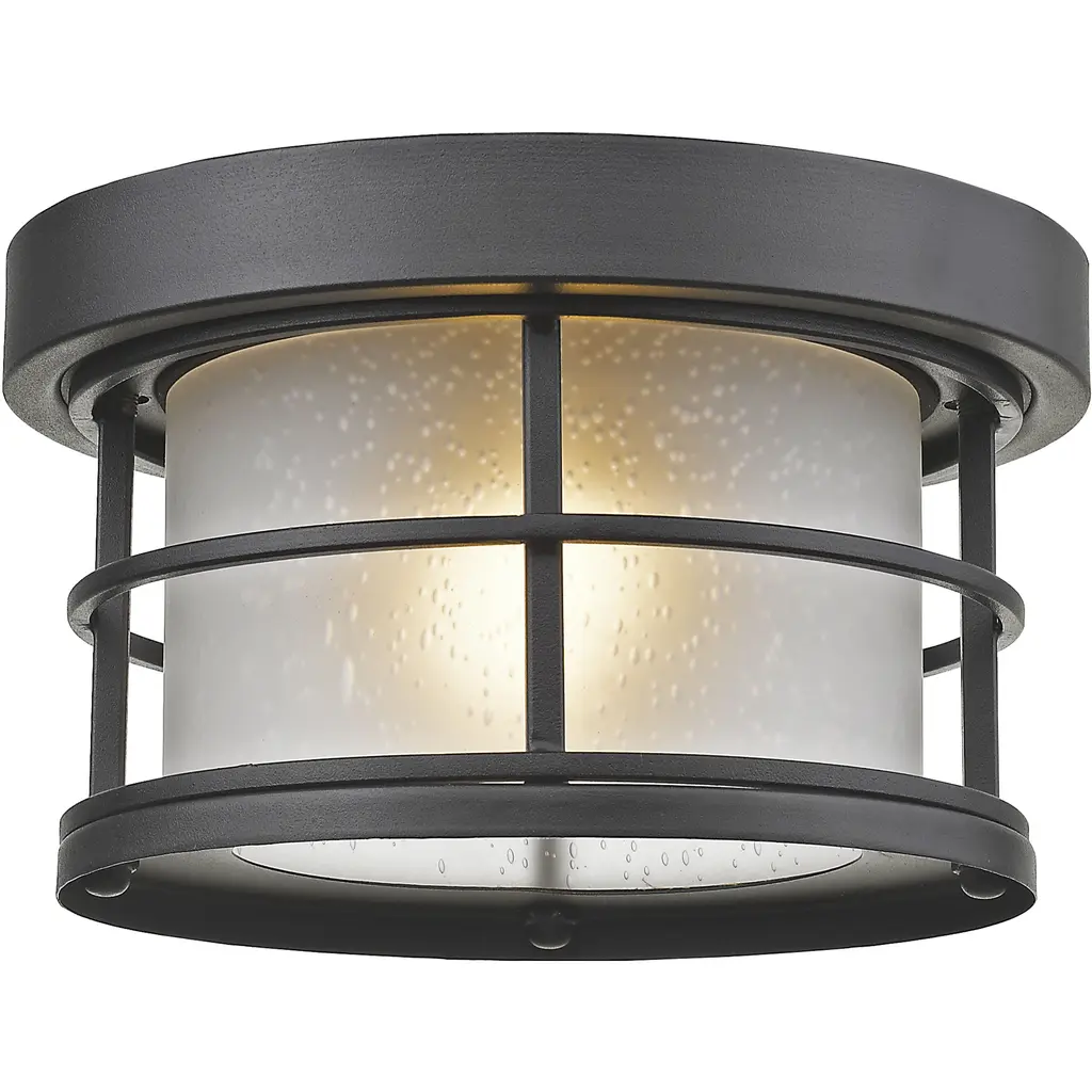 With its sturdy dual frames encasing uniqueseedy glass panels, this flush mount exudes a classic craftsmen style that is bold yet charming. Available in Black or Oil Rubbed Bronze, these fixtures will accent any outdoor setting.