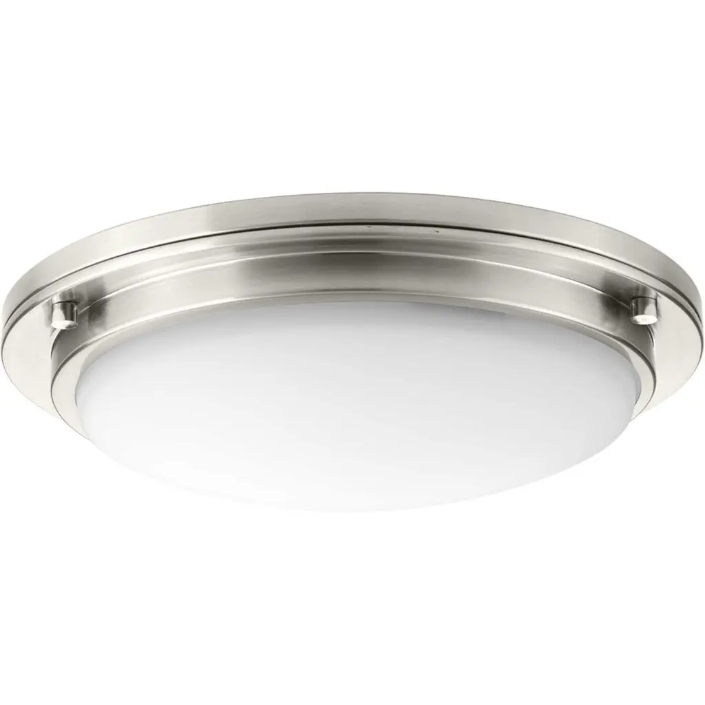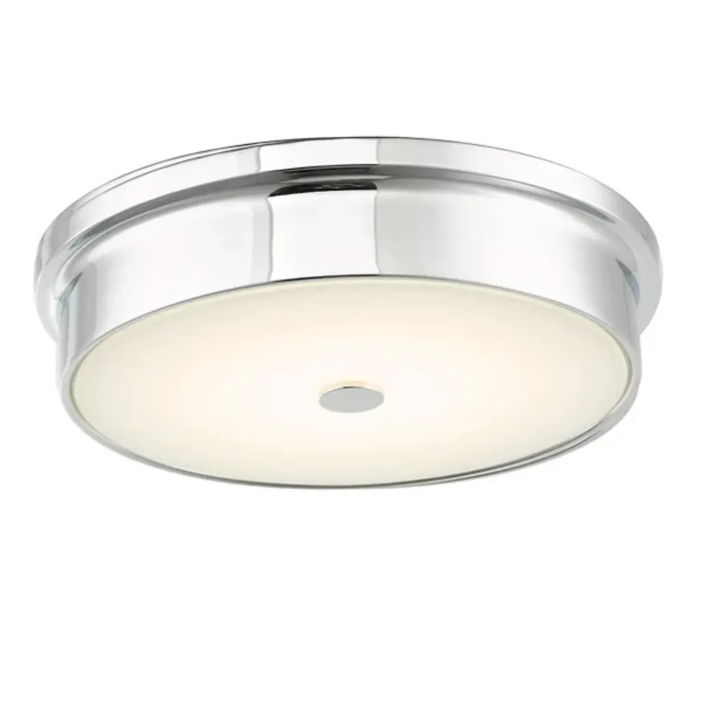 The Federico LED Flush Mount Ceiling Light from Huxe factors neatly in a modern bedroom and living room with a polished structure and generous light. It emphasizes the flush aspect of its design with a layered, yet singular metal structure. The transition between trim and drum form is highlighted by the sleek polish of its surface. A plate of frosted glass mellows out a vibrant LED light from inside into an encompassing warm glow.