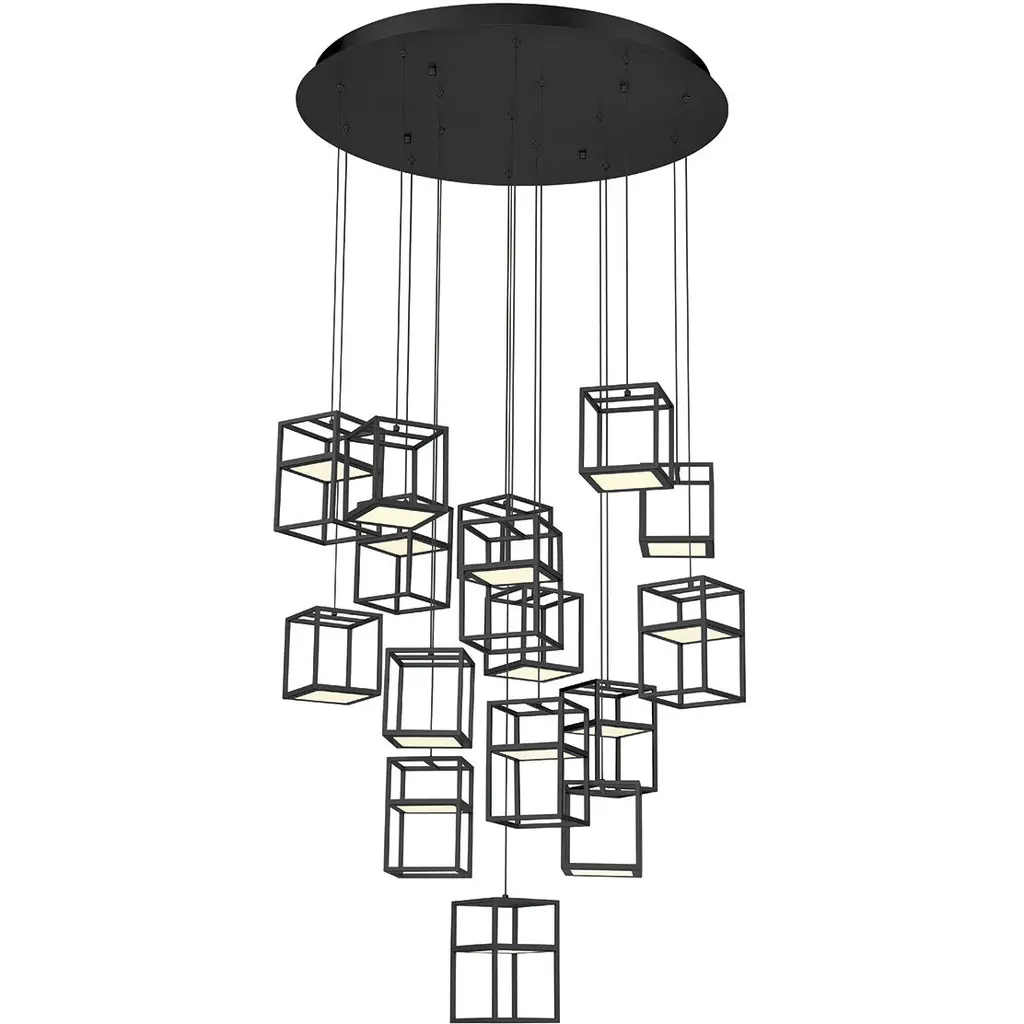 Inspired by shadow box wall art, multiple cubes are positioned in dimensional patterns and illuminated by LED panels to create a dramatic visual effect. The strategically placed direct and indirect light sources illuminate up and down for even more visual interest. The Ferro collection can bring its modern design to a variety of rooms with available chandelier, pendant, flushmount and wall sconce options.