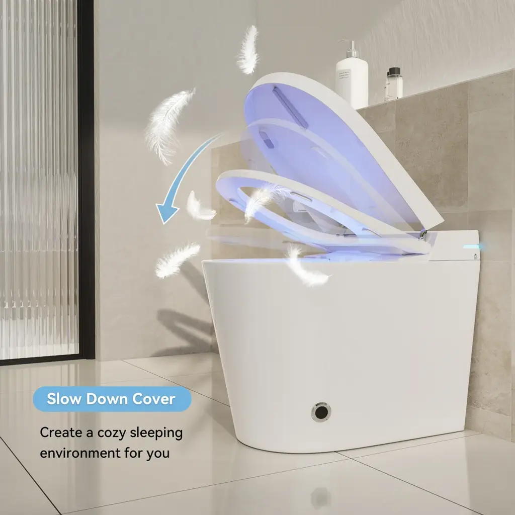 Compact yet powerful, this one-piece smart bidet toilet in a sleek white ceramic finish is designed for modern living. With UV sterilization, auto flush, and a heated seat, it blends style with innovation. Enjoy customizable cleaning, warm drying, and atmosphere lighting for a hygienic and comfortable bathroom experience.