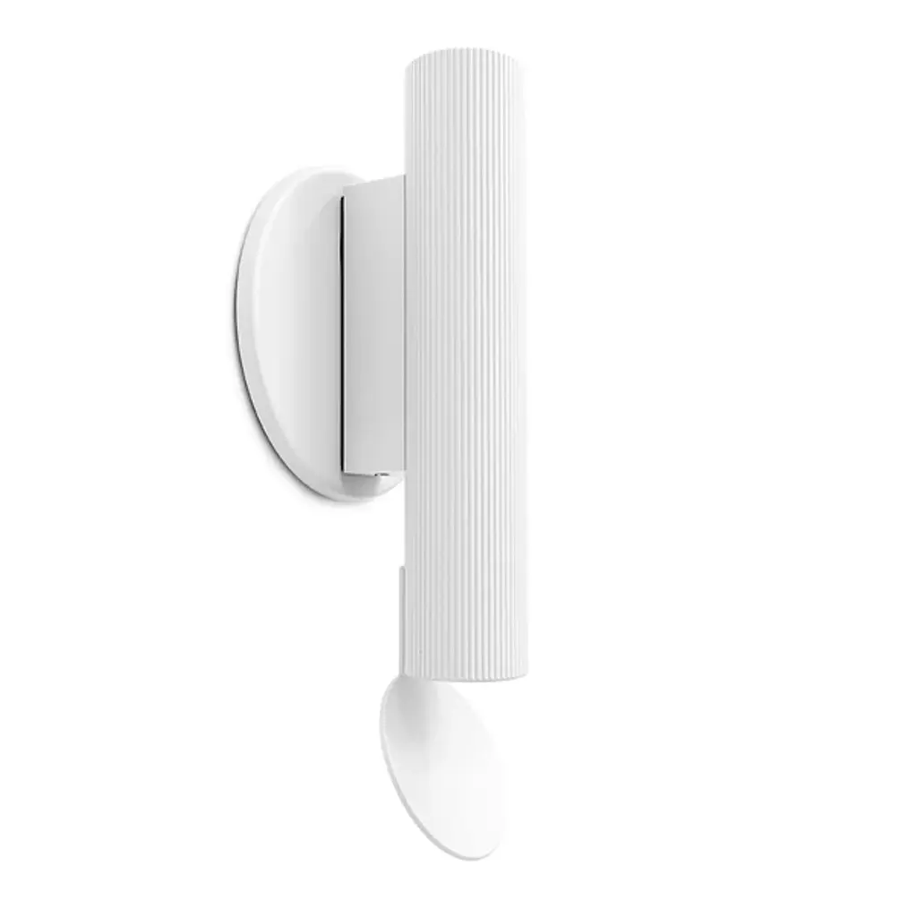 The Flauta LED Wall / Flushmount by FLOS enriches its surroundings with a stylish, upbeat tempo. Designed by Patricia Urquiola to pay homage to the shape of woodwinds and organs, it extends from a sleek circular wall plate along a single vertical fin, seating two spotlights inside a cylindrical housing with an integral LED driver. The lamping is robust and ADA-compliant, shinning out indirectly above and bouncing off an angular reflector set below the fixture.