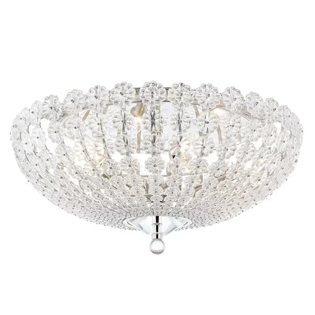Add complexity to your ceilings with the Floral Park Flushmount from Hudson Valley Lighting. an elegant blend of rich textures forged from simple materials; it uses a round canopy to suspend a series of candelabra-base lamps beneath a partially open canopy of glass petal designs strung along curving ribs. This element coheres to form a dome over the lamping, transforming unrestricted brightness from above into a warmer ambiance that sparkles through the clear glass accents.