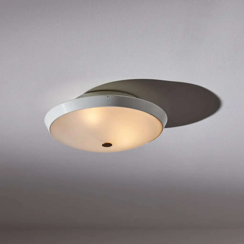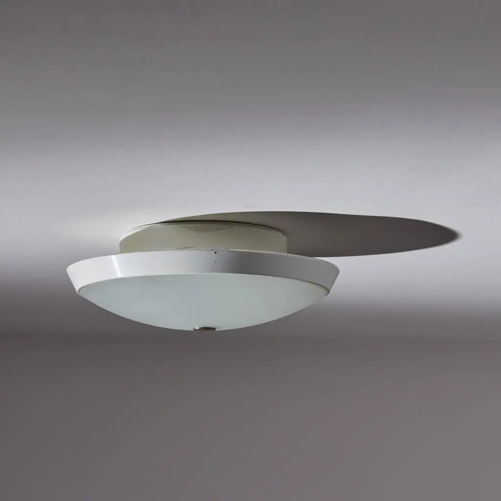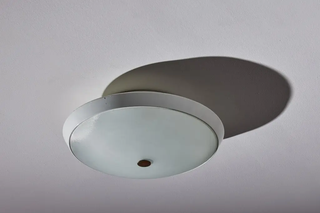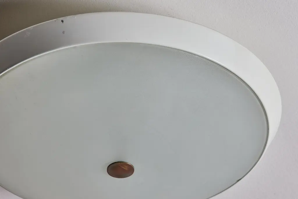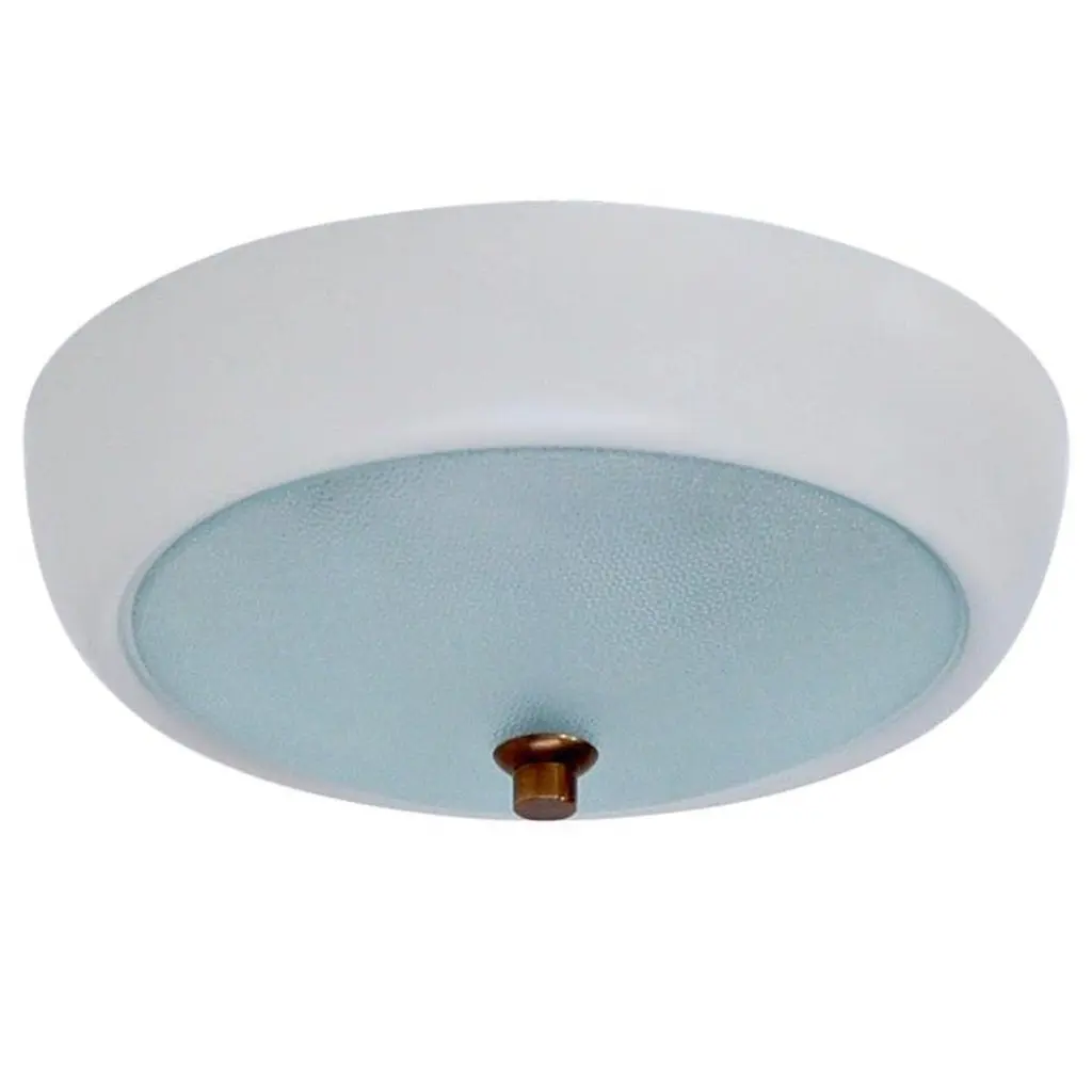 Flush mount ceiling lights by Fontana Arte. Manufactured in Italy, circa 1960's. Enameled metal, textured glass, brass finials. Rewired for U.S. standards. We recommend two E27 60w maximum bulbs per fixture. Bulbs provided as a one time courtesy. Priced and sold individually. Smaller version available see reference number LU794723670992.Chips on glass. Please inquire for images.