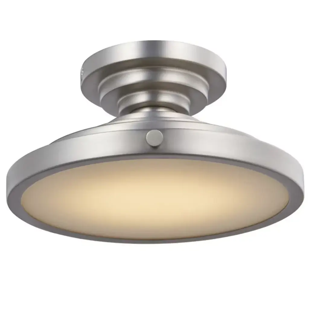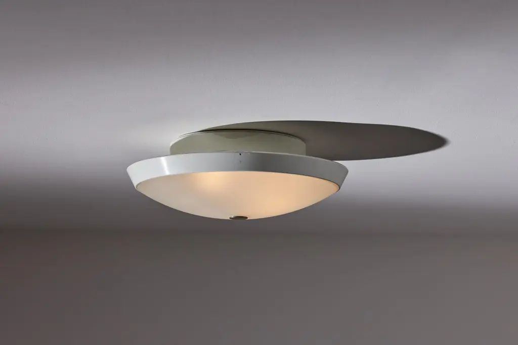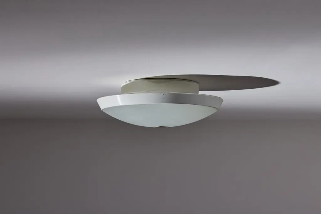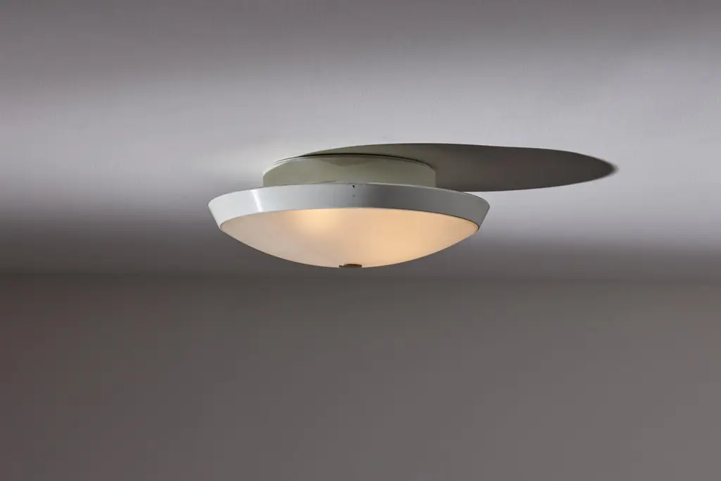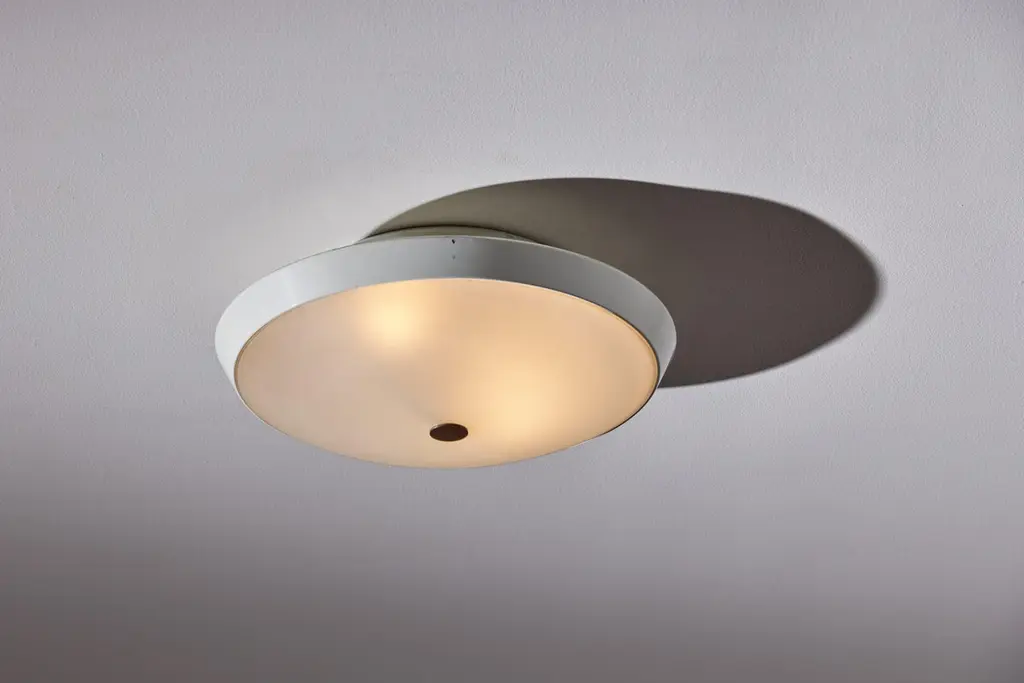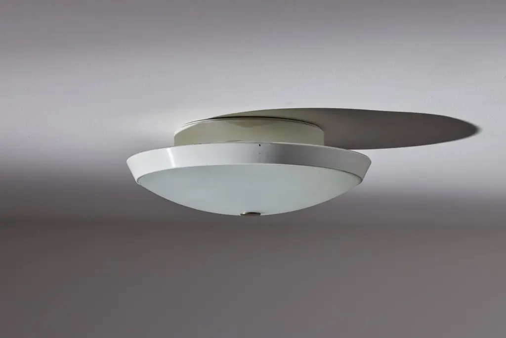 Flush mount ceiling lights by Fontana Arte. Manufactured in Italy, circa 1960's. Enameled metal, textured glass, brass finials. Rewired for U.S. standards. We recommend two E27 60w maximum bulbs per fixture. Bulbs provided as a one time courtesy. Priced and sold individually. Smaller version available see reference number LU794723670992.Chips on glass. Please inquire for images.